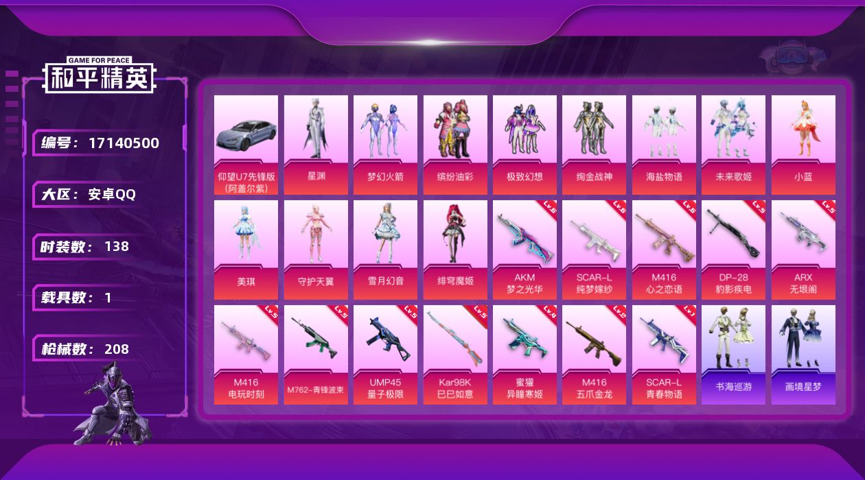 [17140500]安卓 手Q-12粉装-12特效枪-1载具-3粉色飞行器-69006热力值-10王牌印记-138套装-208枪皮