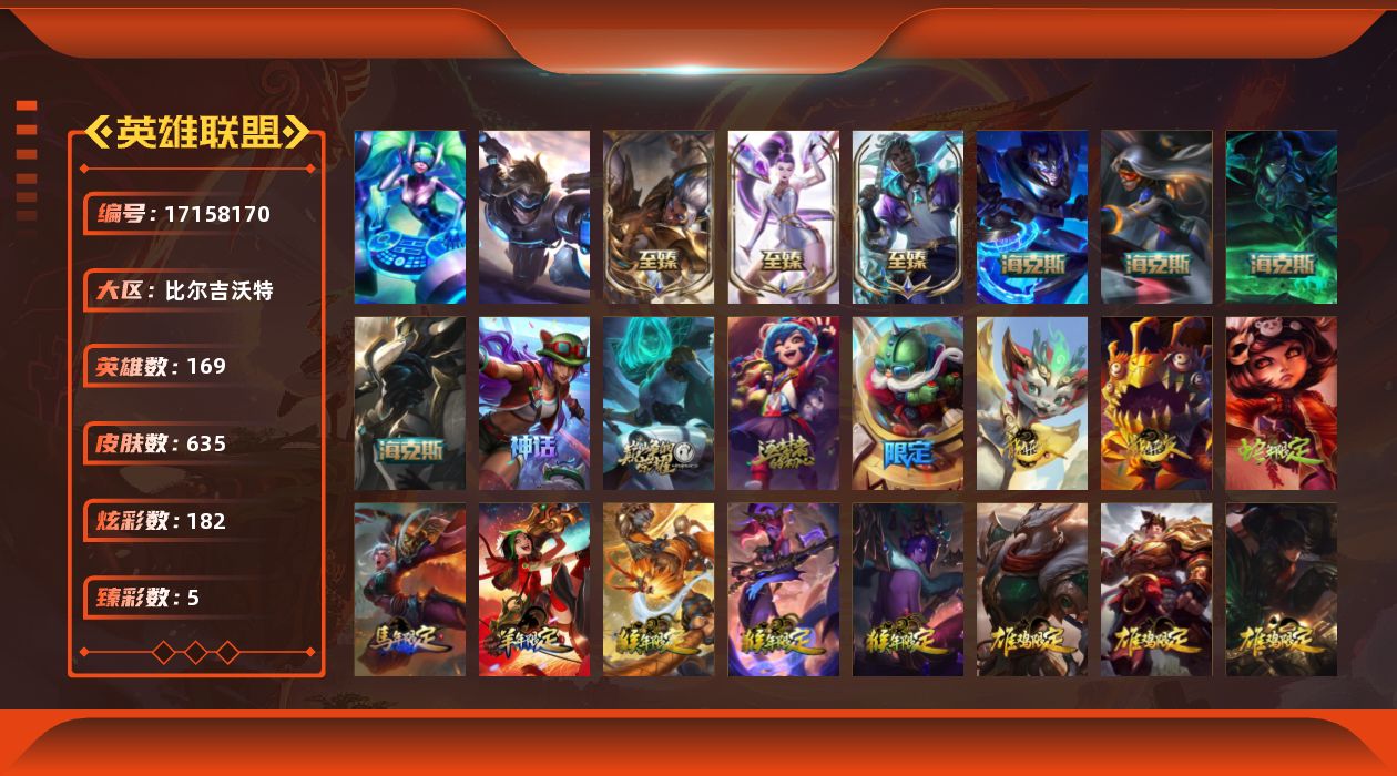 [17158170]未定级段位-169英雄-635皮肤-182炫彩-2终极-11神话-115限定-54传说-157史诗