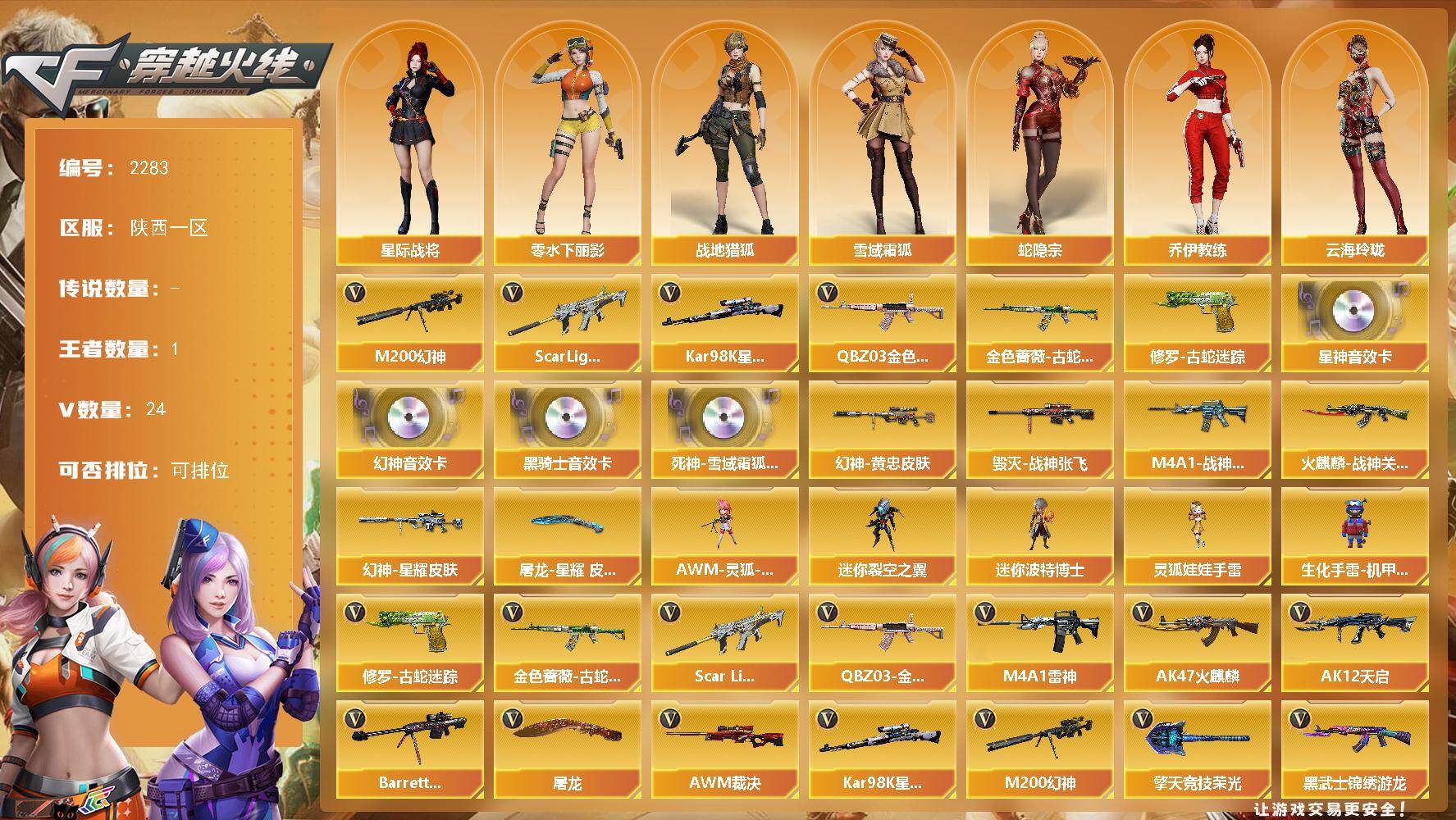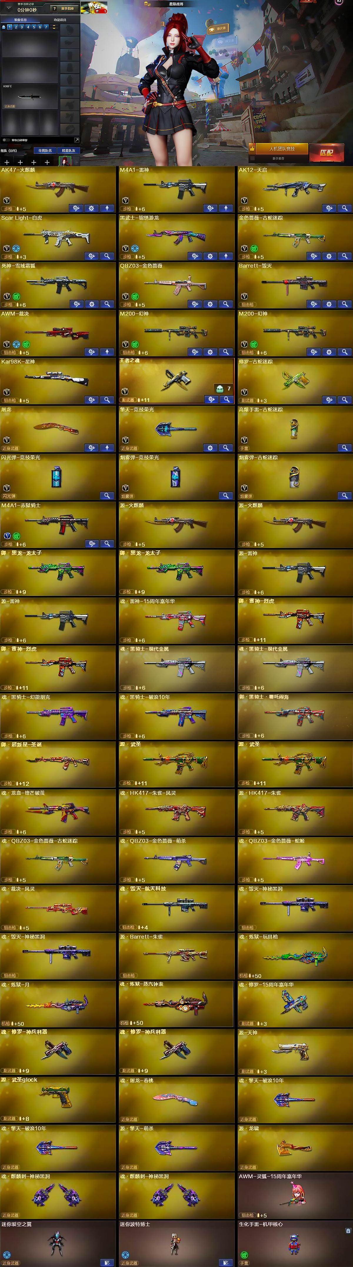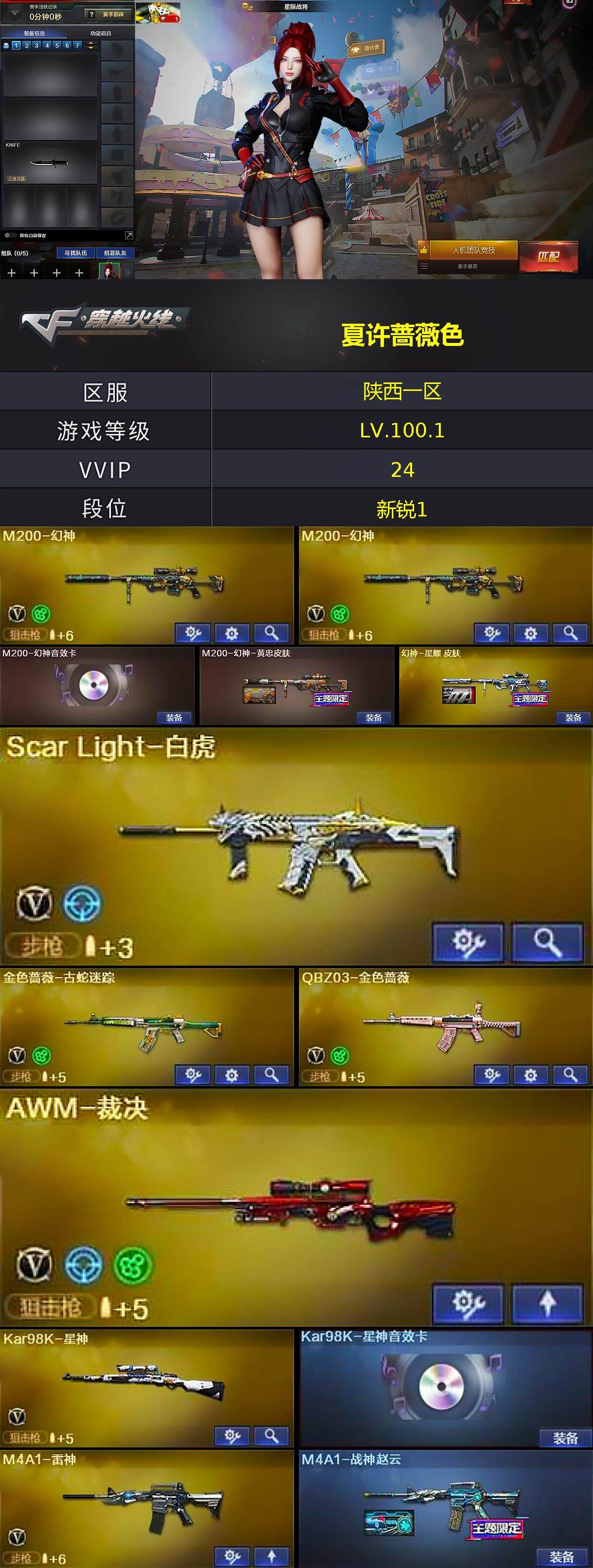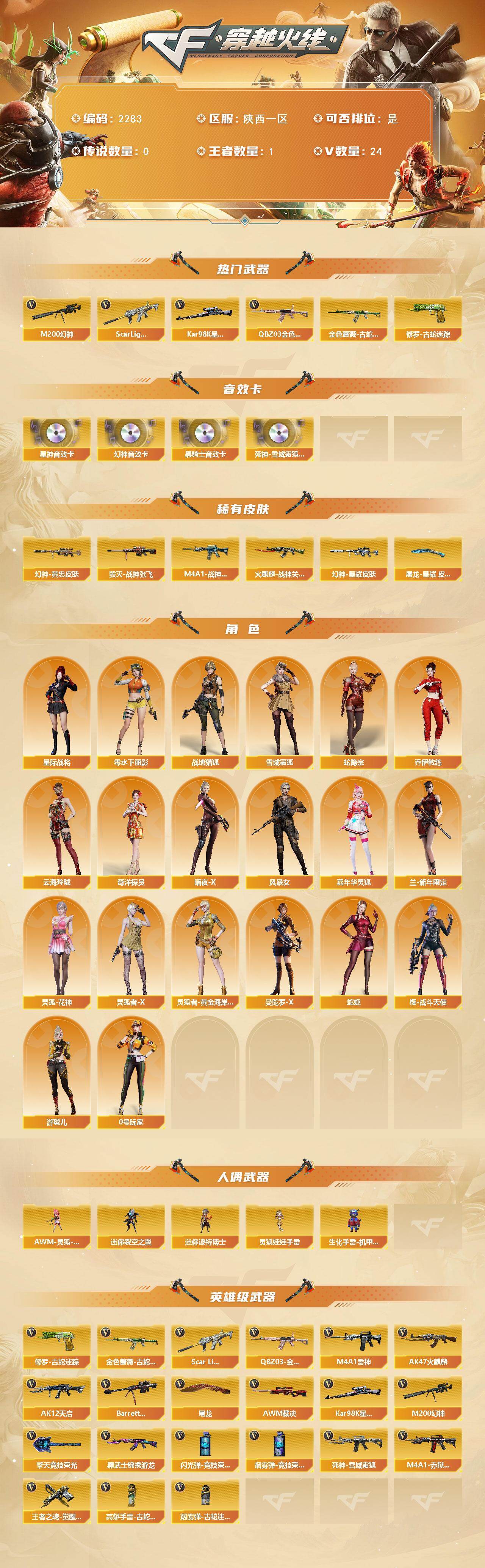 [17095172]陕西一区-21V-1王者武器数-0炫金武器数 【热门武器】:QBZ03-金色蔷薇,Scar Light-白虎,M200-幻神*2,金色蔷薇-古蛇迷踪,修罗-古蛇迷踪,Kar98K-星神 【音效卡】:M200-幻神音效卡,M4A1-黑骑士音效卡,Kar98K-星神音效卡,死神-雪域霜狐-怀旧音效卡 【皮肤】:M200-幻神-黄忠皮肤,幻神-星耀 皮肤,M4A1-战神赵云,火麒麟-战神关羽,毁灭-战神张飞,屠龙-星耀 皮肤 【角色】:星际战将,战地猎狐,雪域霜狐,蛇隐宗,奇洋探员,乔伊教练,云海玲珑,暗夜-X,风暴女,嘉年华灵狐,兰-新年限定,0号玩家,零-水下丽影,灵狐-花神,灵狐者-X,灵狐者-黄金海岸,曼陀罗-X,蛇姬,樱-战斗天使,游珑儿 【人偶武器】:AWM-灵狐-15周年嘉年华,迷你裂空之翼,迷你波特博士,生化手雷-机甲核心,灵狐娃娃手雷 【英雄级武器】:AK47-火麒麟,M4A1-雷神,AK12-天启,Scar Light-白虎,黑武士-锦绣游龙,金色蔷薇-古蛇迷踪,死神-雪域霜狐,QBZ03-金色蔷薇,Barrett-毁灭,AWM-裁决,M200-幻神*2,Kar98K-星神,王者之魂-觉醒版,修罗-古蛇迷踪,屠龙,擎天-竞技荣光,高爆手雷-古蛇迷踪,闪光弹-竞技荣光,烟雾弹-竞技荣光,烟雾弹-古蛇迷踪,M4A1-赤狱骑士 【道具】:冰冰企鹅背包-猛男专用,古蛇迷踪炫彩背包,臻选金狐背包,裂空之翼背包-金色,超级背包,雪域霜狐炫彩背包,救世主-黑桃战神,绿色巨人,夺命之镰,防化服*2,金色流光-枪王排位*2,星辰流光-枪王排位,枪王排位28赛季金色流光,枪王排位29赛季金色流光,语音特效-怀旧,古蛇迷踪打击特效,雪域霜狐表情,蛇隐宗表情,EP战队名片,C4-沙漠,防弹头盔*6,防弹衣*6,C4工具钳*6,手雷包*6 【特殊枪械】:1白虎