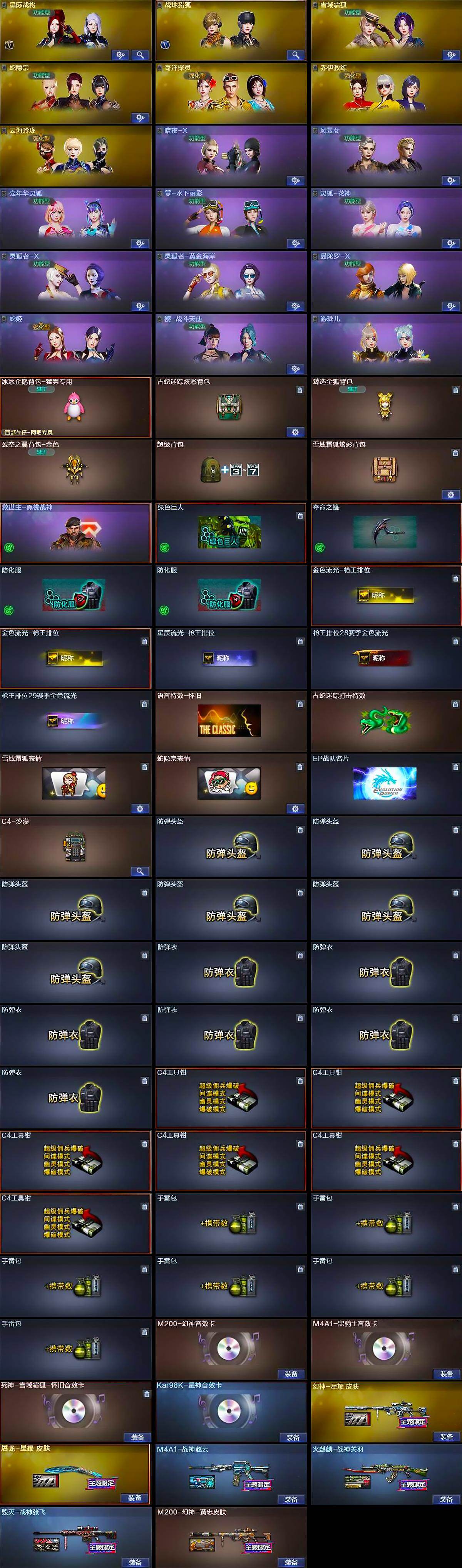【道具】:冰冰企鹅背包-猛男专用,古蛇迷踪炫彩背包,臻选金狐背包,裂空之翼背包-金色,超级背包,雪域霜狐炫彩背包,救世主-黑桃战神,绿色巨人,夺命之镰,防化服*2,金色流光-枪王排位*2,星辰流光-枪王排位,枪王排位28赛季金色流光,枪王排位29赛季金色流光,语音特效-怀旧,古蛇迷踪打击特效,雪域霜狐表情,蛇隐宗表情,EP战队名片,C4-沙漠,防弹头盔*6,防弹衣*6,C4工具钳*6,手雷包*6