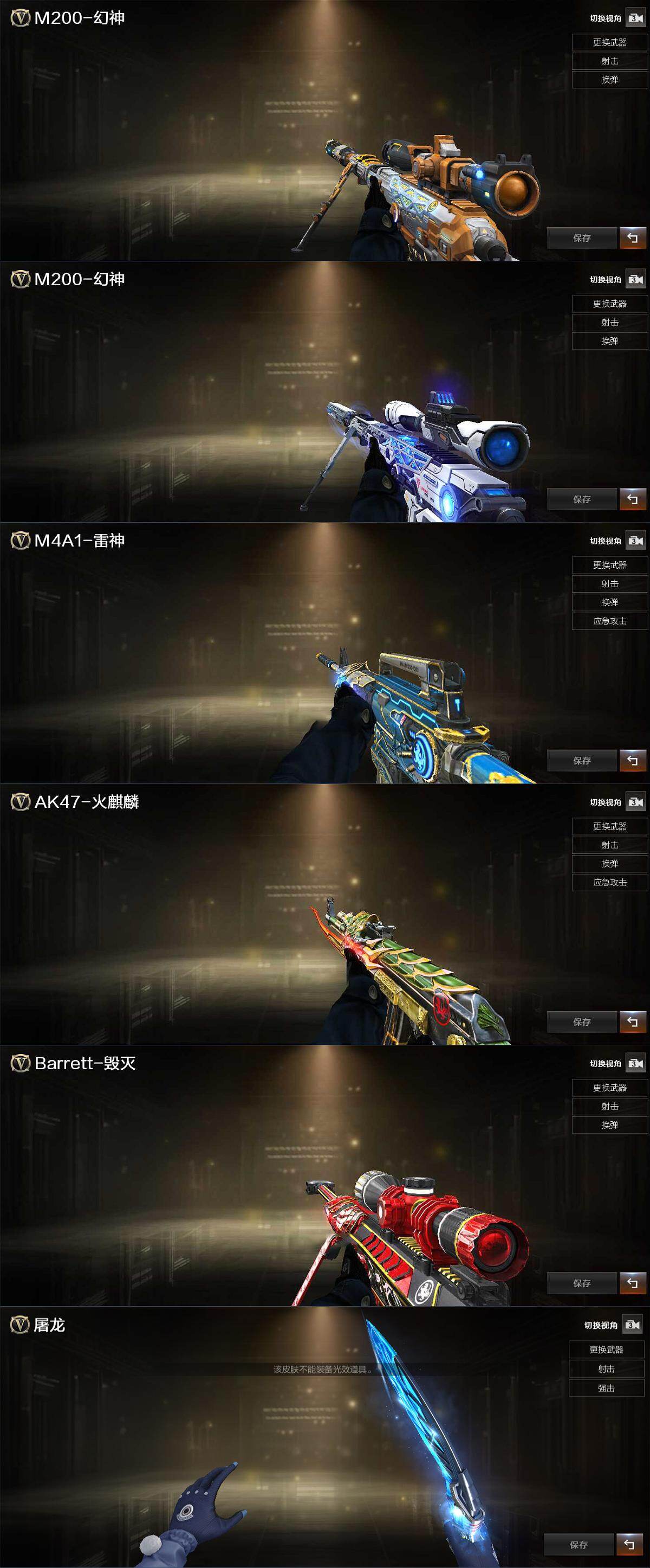 【皮肤】:M200-幻神-黄忠皮肤,幻神-星耀 皮肤,M4A1-战神赵云,火麒麟-战神关羽,毁灭-战神张飞,屠龙-星耀 皮肤