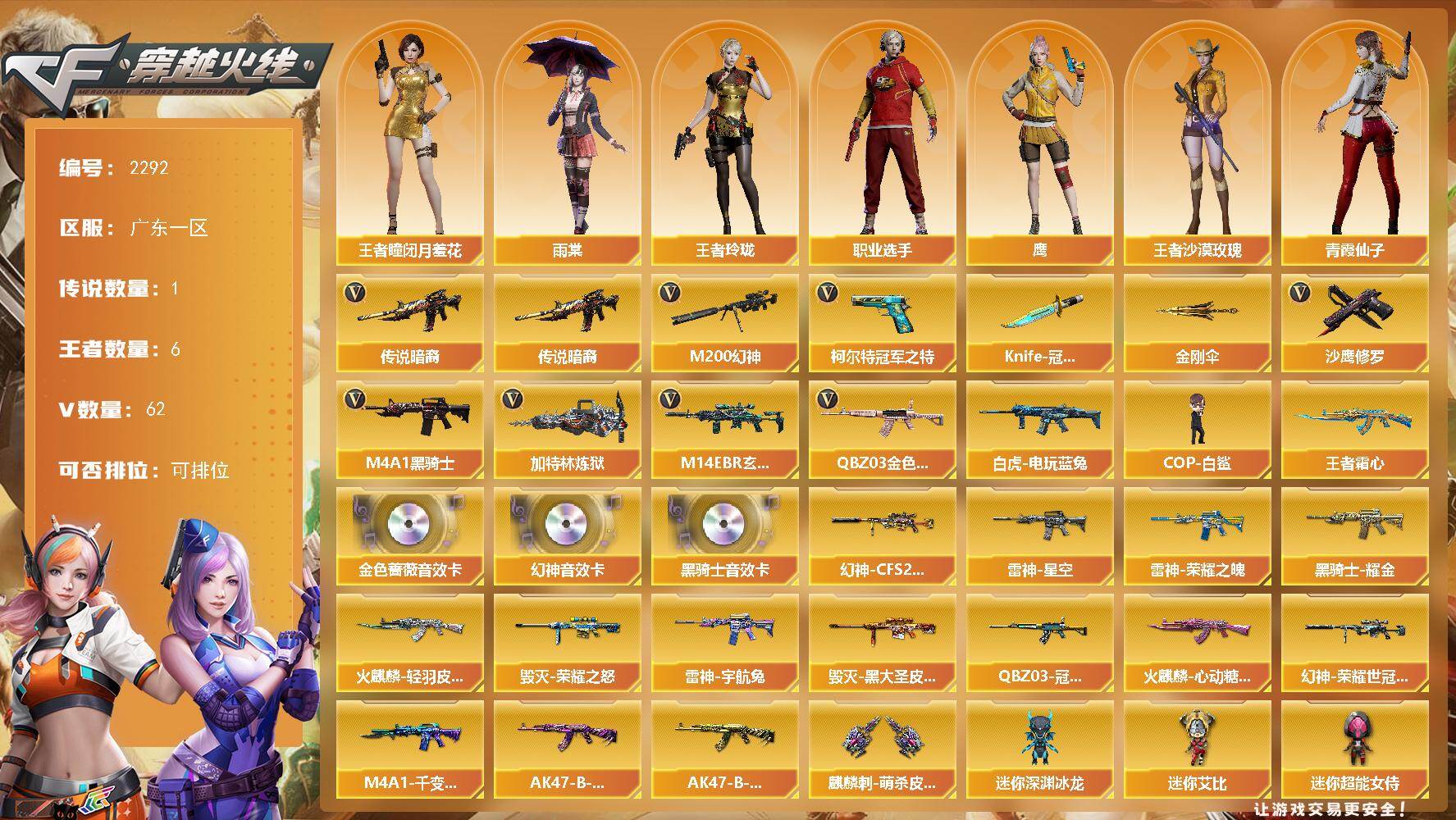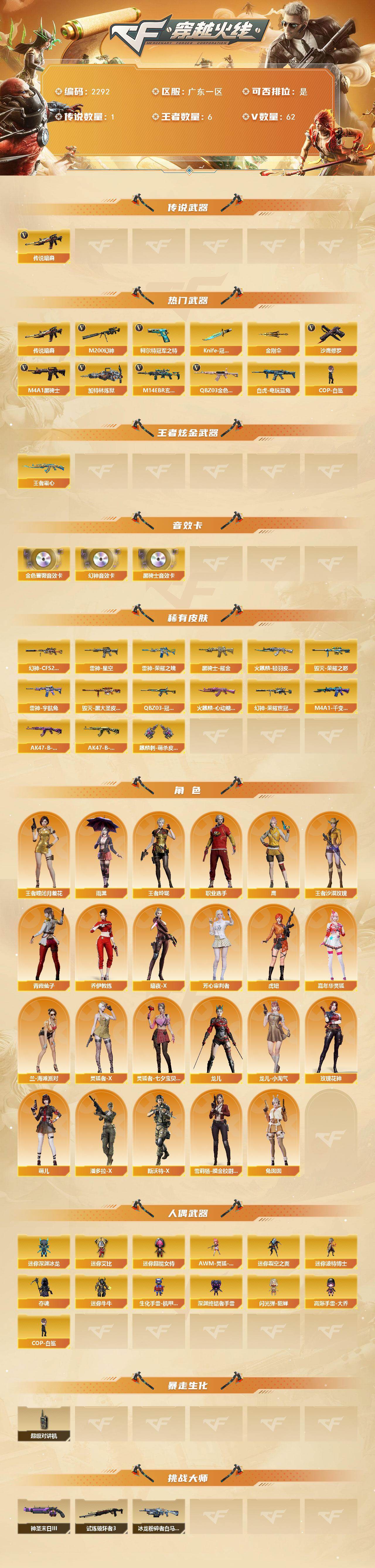 [17095582]广东一区-68V-6王者武器数-0炫金武器数 【传说武器】:传说暗裔 【热门武器】:传说暗裔,QBZ03-金色蔷薇,M14EBR-玄武,M200-幻神,白虎-电玩蓝兔,柯尔特-冠军之特,M4A1-黑骑士*2,加特林-炼狱,COP-白鲨,沙鹰-修罗*4,Knife-冠军之刃,金刚伞 【王者炫金武器】:王者霜心 【音效卡】:M200-幻神音效卡,M4A1-黑骑士音效卡,QBZ03-金色蔷薇音效卡 【皮肤】:幻神-CFS2022,幻神-荣耀世冠白鲨2023 皮肤,QBZ03-冠军之薇,雷神-荣耀之魄,雷神-星空,雷神-宇航兔皮肤,火麒麟-轻羽皮肤,火麒麟-心动糖果,毁灭-荣耀之怒,毁灭-黑大圣皮肤,M4A1-千变-孔明皮肤,黑骑士耀金皮肤,AK47-B-常胜将军-曹操,AK47-B-常胜将军-孙权*2,麒麟刺-萌杀皮肤 【角色】:雨棠,鹰,王者-瞳-闭月羞花,王者玲珑,王者沙漠玫瑰,乔伊教练,暗夜-X,芳心审判者,虎妞,嘉年华灵狐,兰-海滩派对,灵狐者-X,灵狐者-七夕宝贝,龙儿,龙儿-小淘气,玫瑰花神,萌儿,潘多拉-X,青霞仙子,斯沃特-X,兔囡囡,雪莉杨-摸金校尉,职业选手 【人偶武器】:COP-白鲨,AWM-灵狐-15周年嘉年华,迷你深渊冰龙,迷你裂空之翼*2,迷你波特博士*2,夺魂,迷你牛牛,生化手雷-机甲核心,深渊终结者手雷,闪光弹-貂蝉,高爆手雷-大乔,迷你艾比,迷你超能女侍 【暴走生化】:超级对讲机 【挑战大师】:冰龙粉碎者-白马银枪,试炼破坏者III,神圣爆裂者-末日III 【英雄级武器】:AK47-火麒麟*2,M4A1-黑龙,M4A1-雷神,M4A1-黑骑士*2,M14EBR-玄武,无影-神兵利器,QBZ03-金色蔷薇,9A91-烈火,烈火-动感闪耀,AK-47-猩红传说,AK47-B-常胜将军,王者白虎-觉醒版,QBZ-03-王者蔷薇-觉醒版,白虎-电玩蓝兔,白虎之魄-觉醒版,Barrett-极光,M200-幻神,王者之决-觉醒版,王者星神-觉醒版,加特林-炼狱,AA-12-雷霆,沙鹰-修罗*4,沙鹰-天神,柯尔特-冠军之特,USP-神工天巧*2,天神-动感闪耀,屠龙,马来剑-夜魔,擎天,麒麟刺,唐刀-神工天巧,屠龙-动感闪耀,斩神刀-雷暴,高爆手雷-雷暴,高爆手雷-夜魔,高爆手雷-神工天巧*5,手雷-动感闪耀,闪光弹-雷暴,闪光弹-夜魔,闪光弹-神