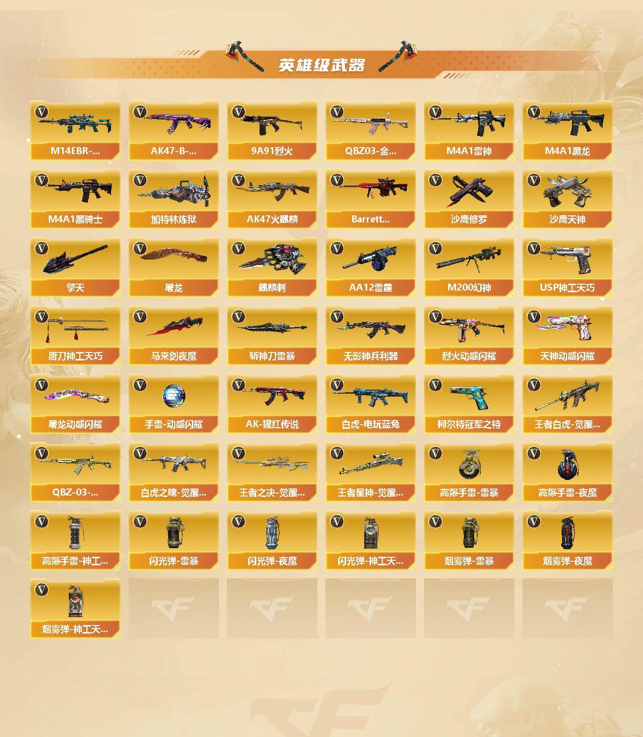 【英雄级武器】:AK47-火麒麟*2,M4A1-黑龙,M4A1-雷神,M4A1-黑骑士*2,M14EBR-玄武,无影-神兵利器,QBZ03-金色蔷薇,9A91-烈火,烈火-动感闪耀,AK-47-猩红传说,AK47-B-常胜将军,王者白虎-觉醒版,QBZ-03-王者蔷薇-觉醒版,白虎-电玩蓝兔,白虎之魄-觉醒版,Barrett-极光,M200-幻神,王者之决-觉醒版,王者星神-觉醒版,加特林-炼狱,AA-12-雷霆,沙鹰-修罗*4,沙鹰-天神,柯尔特-冠军之特,USP-神工天巧*2,天神-动感闪耀,屠龙,马来剑-夜魔,擎天,麒麟刺,唐刀-神工天巧,屠龙-动感闪耀,斩神刀-雷暴,高爆手雷-雷暴,高爆手雷-夜魔,高爆手雷-神工天巧*5,手雷-动感闪耀,闪光弹-雷暴,闪光弹-夜魔,闪光弹-神