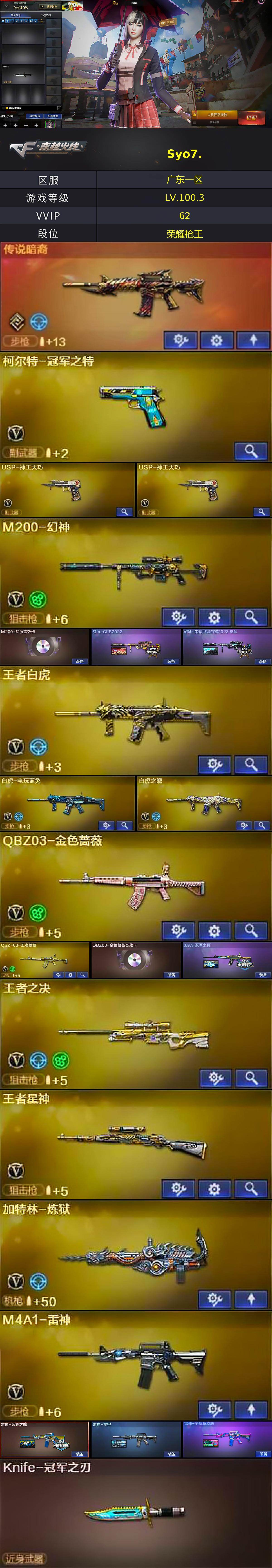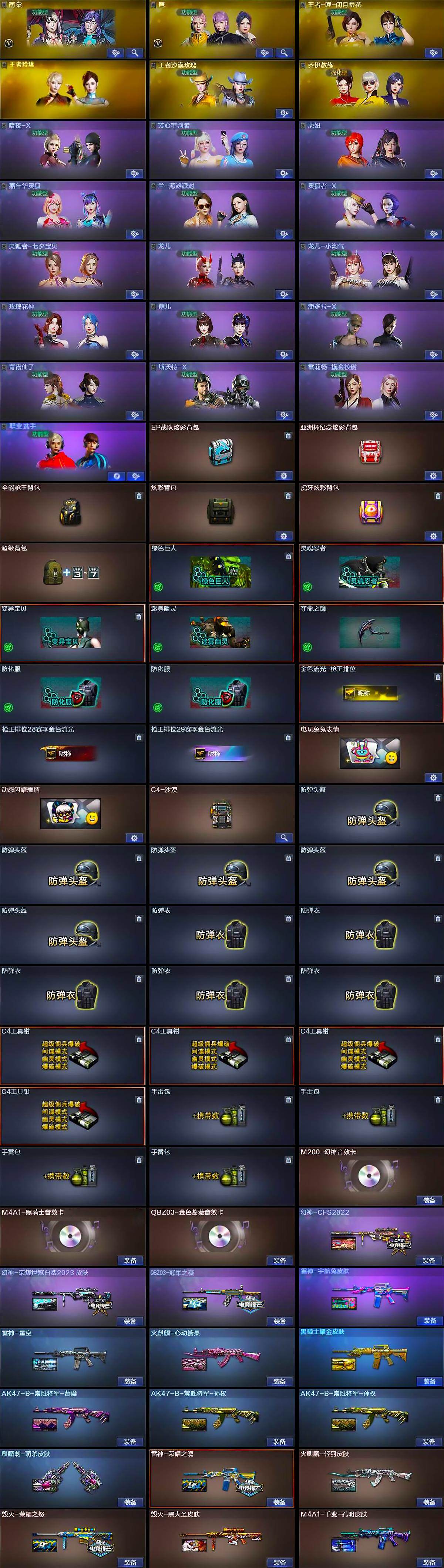 【皮肤】:幻神-CFS2022,幻神-荣耀世冠白鲨2023 皮肤,QBZ03-冠军之薇,雷神-荣耀之魄,雷神-星空,雷神-宇航兔皮肤,火麒麟-轻羽皮肤,火麒麟-心动糖果,毁灭-荣耀之怒,毁灭-黑大圣皮肤,M4A1-千变-孔明皮肤,黑骑士耀金皮肤,AK47-B-常胜将军-曹操,AK47-B-常胜将军-孙权*2,麒麟刺-萌杀皮肤