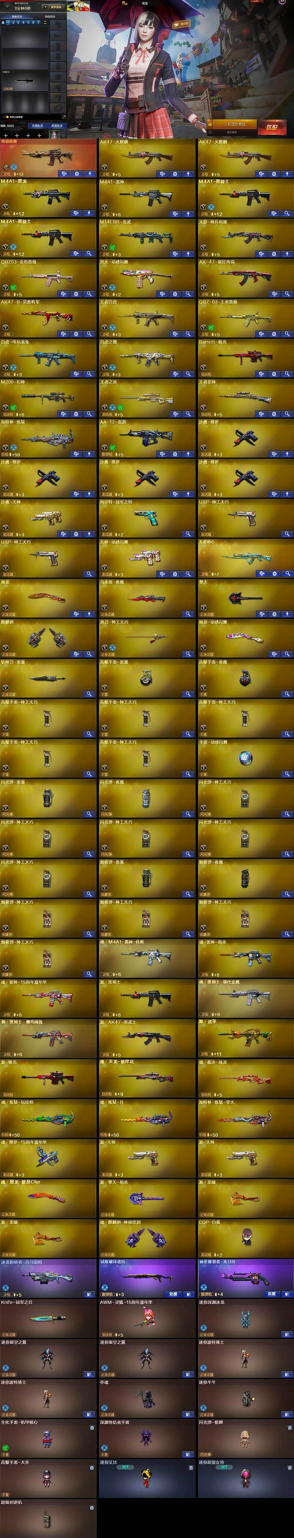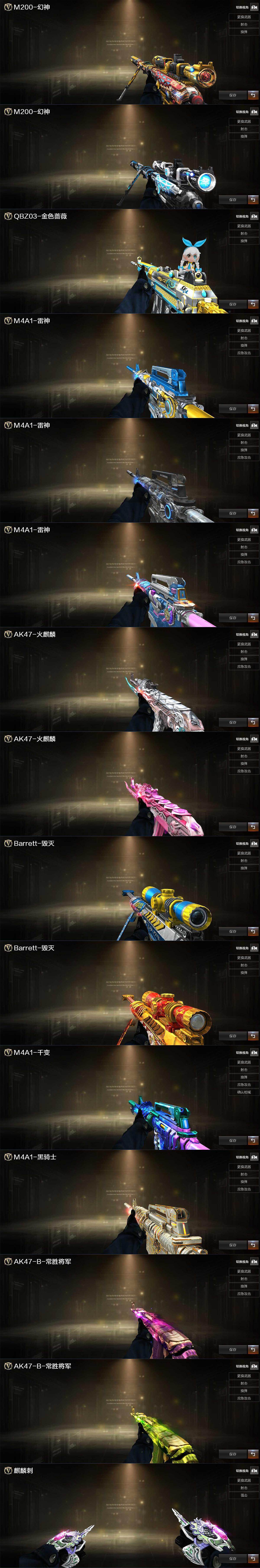 【热门武器】:传说暗裔,QBZ03-金色蔷薇,M14EBR-玄武,M200-幻神,白虎-电玩蓝兔,柯尔特-冠军之特,M4A1-黑骑士*2,加特林-炼狱,COP-白鲨,沙鹰-修罗*4,Knife-冠军之刃,金刚伞