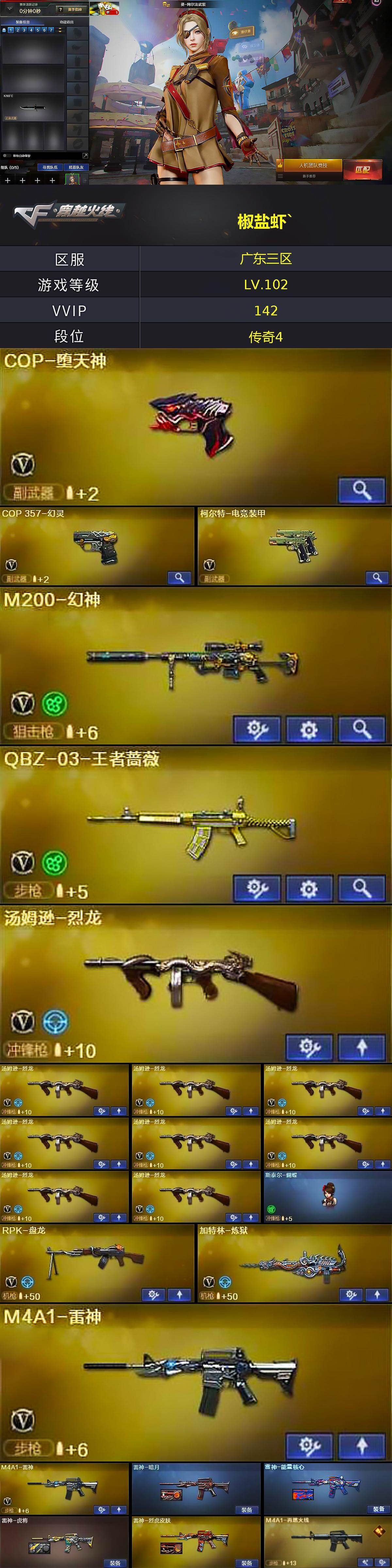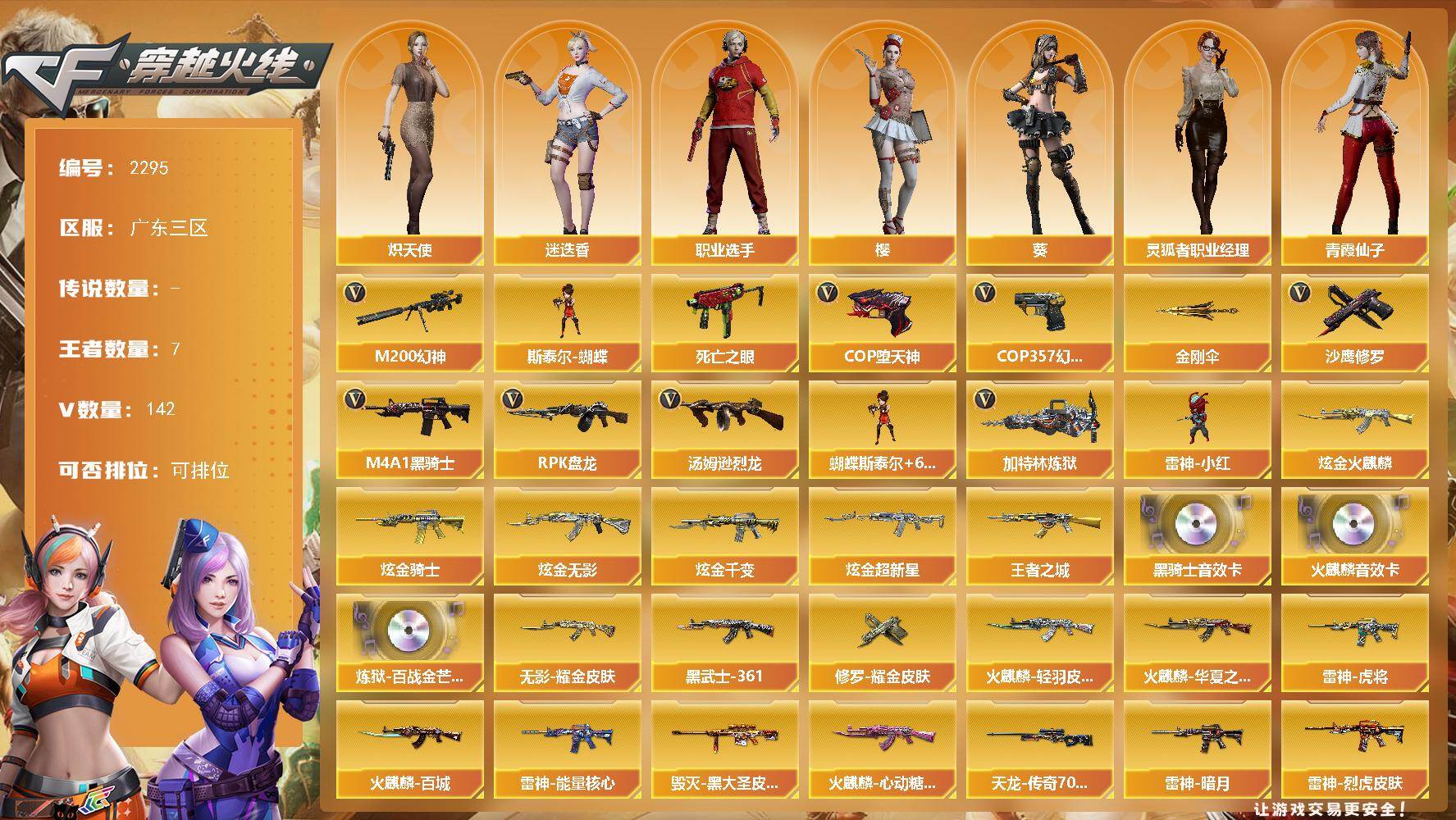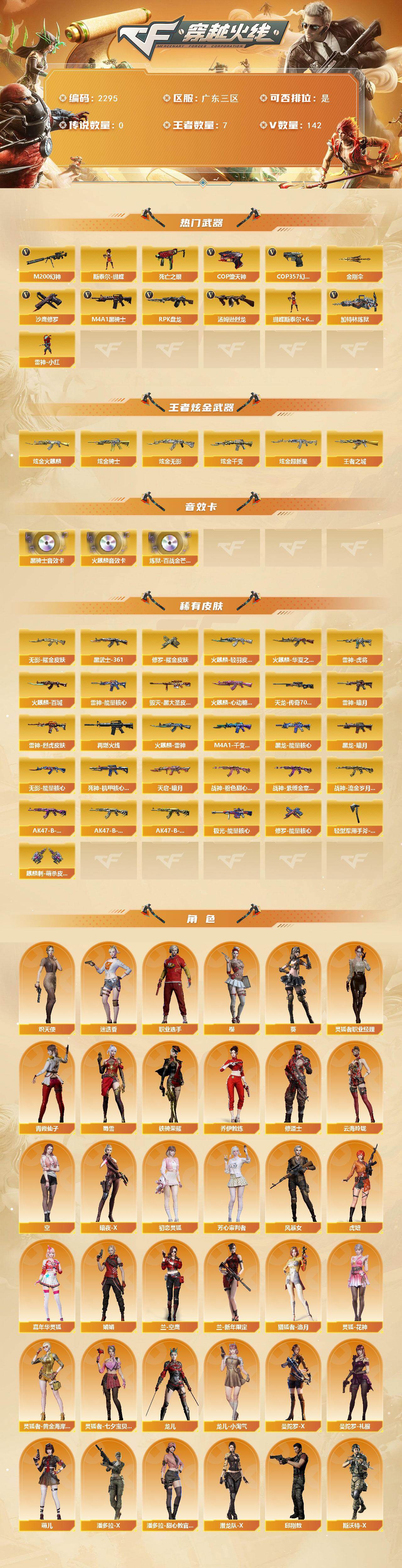 [17095922]广东三区-148V-7王者武器数-5炫金武器数 【热门武器】:M200-幻神,死亡之眼,M4A1-黑骑士,汤姆逊-烈龙*9,RPK-盘龙,加特林-炼狱,斯泰尔-蝴蝶,雷神-小红,COP-堕天神,COP 357-幻灵,沙鹰-修罗*5,金刚伞 【王者炫金武器】:王者之城,炫金火麒麟,炫金骑士,炫金无影,炫金千变,炫金超新星 【音效卡】:AK47-火麒麟音效卡,M4A1-黑骑士音效卡,炼狱-百战金芒-庆典舞曲音效卡 【皮肤】:雷神-暗月,雷神-能量核心,雷神-虎将,雷神-烈虎皮肤,M4A1-再燃火线,火麒麟-雷神,火麒麟-华夏之心,火麒麟-轻羽皮肤,火麒麟-百城,火麒麟-心动糖果,毁灭-黑大圣皮肤,M4A1-千变-孔明皮肤,黑龙-能量核心,黑龙-暗月*2,无影-能量核心,无影耀金皮肤,死神-机甲核心皮肤,AK47-黑武士-361,天启-暗月,战神-粉色甜心皮肤*3,战神-紫绶金章皮肤*9,战神-流金岁月皮肤*4,AK47-B-常胜将军-曹操,AK47-B-常胜将军-刘备,AK47-B-常胜将军-孙权,AWM-天龙-传奇70KG,极光-能量核心,修罗-能量核心,修罗耀金皮肤,轻型军用手斧-再燃火线,麒麟刺-萌杀皮肤 【角色】:葵,樱,迷迭香,乔伊教练,修道士,云海玲珑,葵-阿尔法武装,炽天使,空,暗夜-X,初恋灵狐,芳心审判者,风暴女*2,虎妞,嘉年华灵狐,娟娟,兰-空鹰,兰-新年限定,猎狐者-追月,灵狐-花神,灵狐者-黄金海岸,灵狐者-七夕宝贝,灵狐者-职业经理,龙儿,龙儿-小淘气,曼陀罗-X,曼陀罗-礼服,萌儿,潘多拉-X,潘多拉-甜心教官,潜龙队-X,邱刚敖,青霞仙子,斯沃特-X,蜀雪,铁骑荣耀,兔囡囡,维纳斯,新娜塔莎,雪莉杨,雪莉杨-摸金校尉,夜玫瑰-幻能朋克,樱-战斗天使,影武者-X,职业选手 【人偶武器】:雷神-小红,天龙-曼陀罗,火麒麟-灵狐,斯泰尔-蝴蝶,巴雷特-零-水下丽影*2,AWM-灵狐-15周年嘉年华,迷你深渊冰龙,迷你牛魔王,夺魂,迷你牛牛,迷你生化手雷,深渊终结者手雷,闪光弹-小乔,闪光弹-貂蝉,高爆手雷-大乔,M4A1-斯沃特,迷你艾比,迷你巨石泰坦-魔花研究所,灵狐娃娃手雷 【暴走生化】:死亡之眼,超级对讲机 【挑战大师】:神圣爆裂者III,AK47-冰龙粉碎者,冰龙粉碎者-白马银枪,激光毁灭者III-白马银枪*2,激光毁灭者III*3,