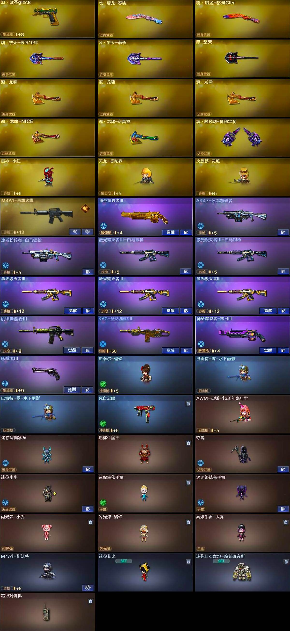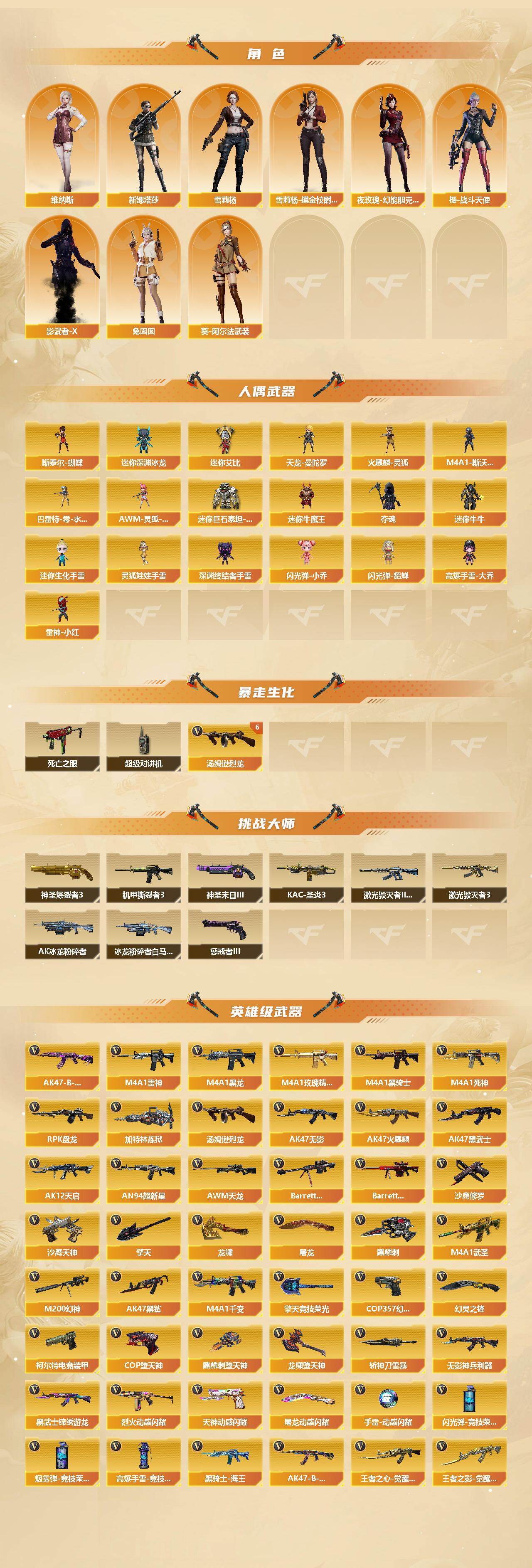 【人偶武器】:雷神-小红,天龙-曼陀罗,火麒麟-灵狐,斯泰尔-蝴蝶,巴雷特-零-水下丽影*2,AWM-灵狐-15周年嘉年华,迷你深渊冰龙,迷你牛魔王,夺魂,迷你牛牛,迷你生化手雷,深渊终结者手雷,闪光弹-小乔,闪光弹-貂蝉,高爆手雷-大乔,M4A1-斯沃特,迷你艾比,迷你巨石泰坦-魔花研究所,灵狐娃娃手雷