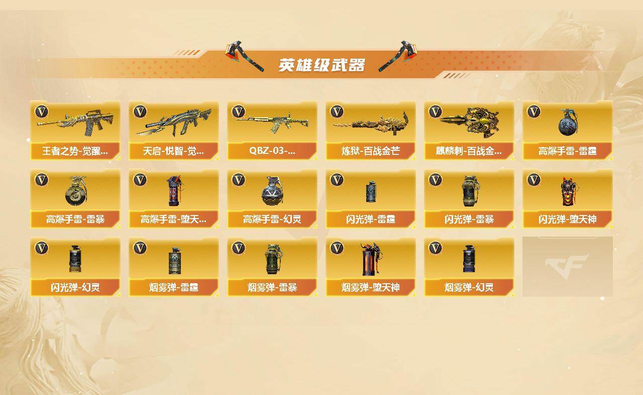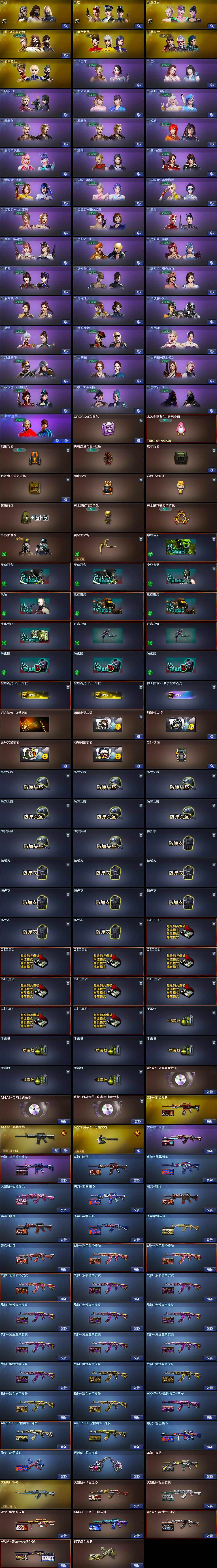 【皮肤】:雷神-暗月,雷神-能量核心,雷神-虎将,雷神-烈虎皮肤,M4A1-再燃火线,火麒麟-雷神,火麒麟-华夏之心,火麒麟-轻羽皮肤,火麒麟-百城,火麒麟-心动糖果,毁灭-黑大圣皮肤,M4A1-千变-孔明皮肤,黑龙-能量核心,黑龙-暗月*2,无影-能量核心,无影耀金皮肤,死神-机甲核心皮肤,AK47-黑武士-361,天启-暗月,战神-粉色甜心皮肤*3,战神-紫绶金章皮肤*9,战神-流金岁月皮肤*4,AK47-B-常胜将军-曹操,AK47-B-常胜将军-刘备,AK47-B-常胜将军-孙权,AWM-天龙-传奇70KG,极光-能量核心,修罗-能量核心,修罗耀金皮肤,轻型军用手斧-再燃火线,麒麟刺-萌杀皮肤