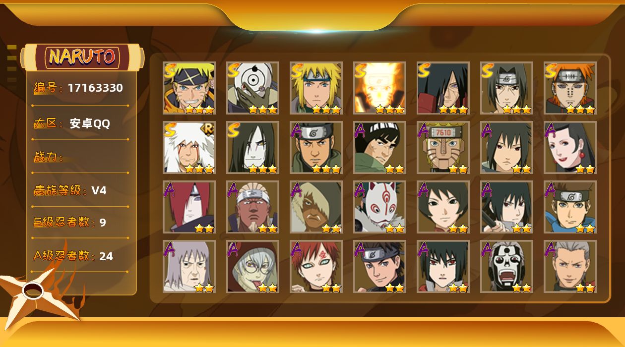 [17163330]9S级忍者数-24A级忍者数 【S级忍者】:宇智波斑「秽土转生」(3星),宇智波鼬「须佐能乎」(3星),自来也「舞之豪杰」(3星),大蛇丸(3星),波风水门(3星),漩涡鸣人「九喇嘛连结」(3星),佩恩「天道」(3星),宇智波斑 「白面具」(3星宇智波斑「白面具」),漩涡鸣人·宇智波佐助(3星) 【A级忍者】:艾「青年」(2星),长门「青年」(2星),达鲁伊「博人传」(2星),飞段(2星),飞段「死司凭血」(2星),干柿鬼鲛(2星),机械鸣人「初始形态」(2星),迈特凯(2星),我爱罗「疾风传」(2星),我爱罗「忍界大战」(2星),蝎(2星),小南「神驹佑将」(2星),猿飞阿斯玛(3星),猿飞日斩「火影继承人」(2星),宇智波佐助「须佐能乎」(2星),宇智波佐助「万花筒写轮眼」(2星),药师兜「半蛇斗篷」(2星),神秘面具男「忍者之路」(2星),猿飞木叶丸「博人传」(2星),黑土「博人传」(2星),千代「近松十人卫」(2星),不缘(2星),宇智波泉奈(2星),迈特凯「青春爆炸」(2星)