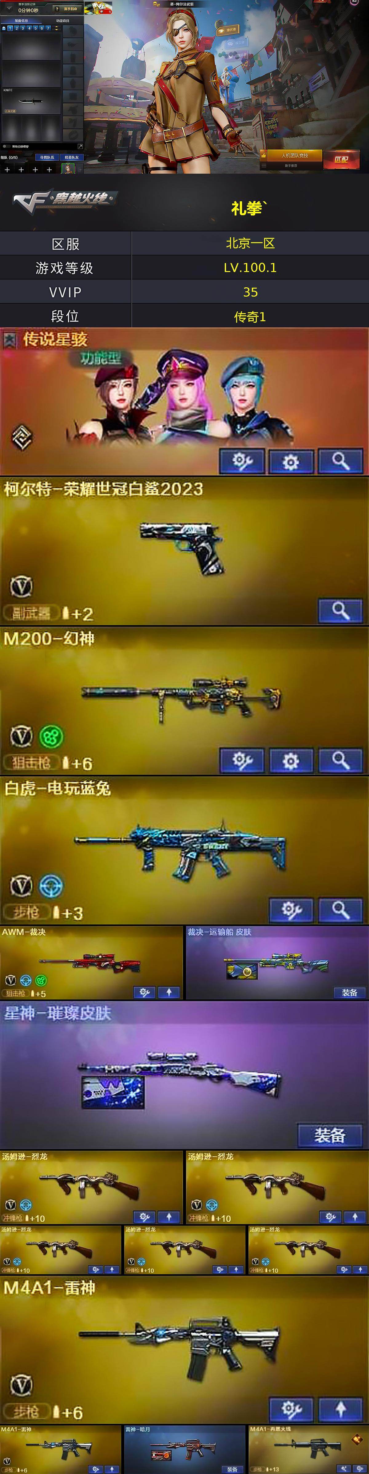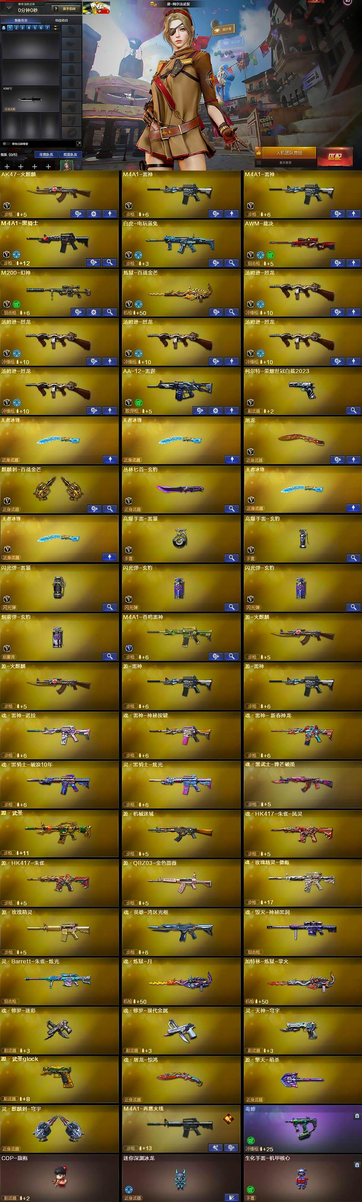 【英雄级武器】:AK47-火麒麟,M4A1-雷神*2,M4A1-黑骑士,白虎-电玩蓝兔,AWM-裁决,M200-幻神,炼狱-百战金芒,汤姆逊-烈龙*5,AA-12-雷霆,柯尔特-荣耀世冠白鲨2023,屠龙,麒麟刺-百战金芒,丛林匕首-玄豹,王者冰锋-觉醒版*2,高爆手雷-雷暴,高爆手雷-玄豹,闪光弹-雷暴,闪光弹-玄豹*2,烟雾弹-玄豹,M4A1-苍鸣雷神