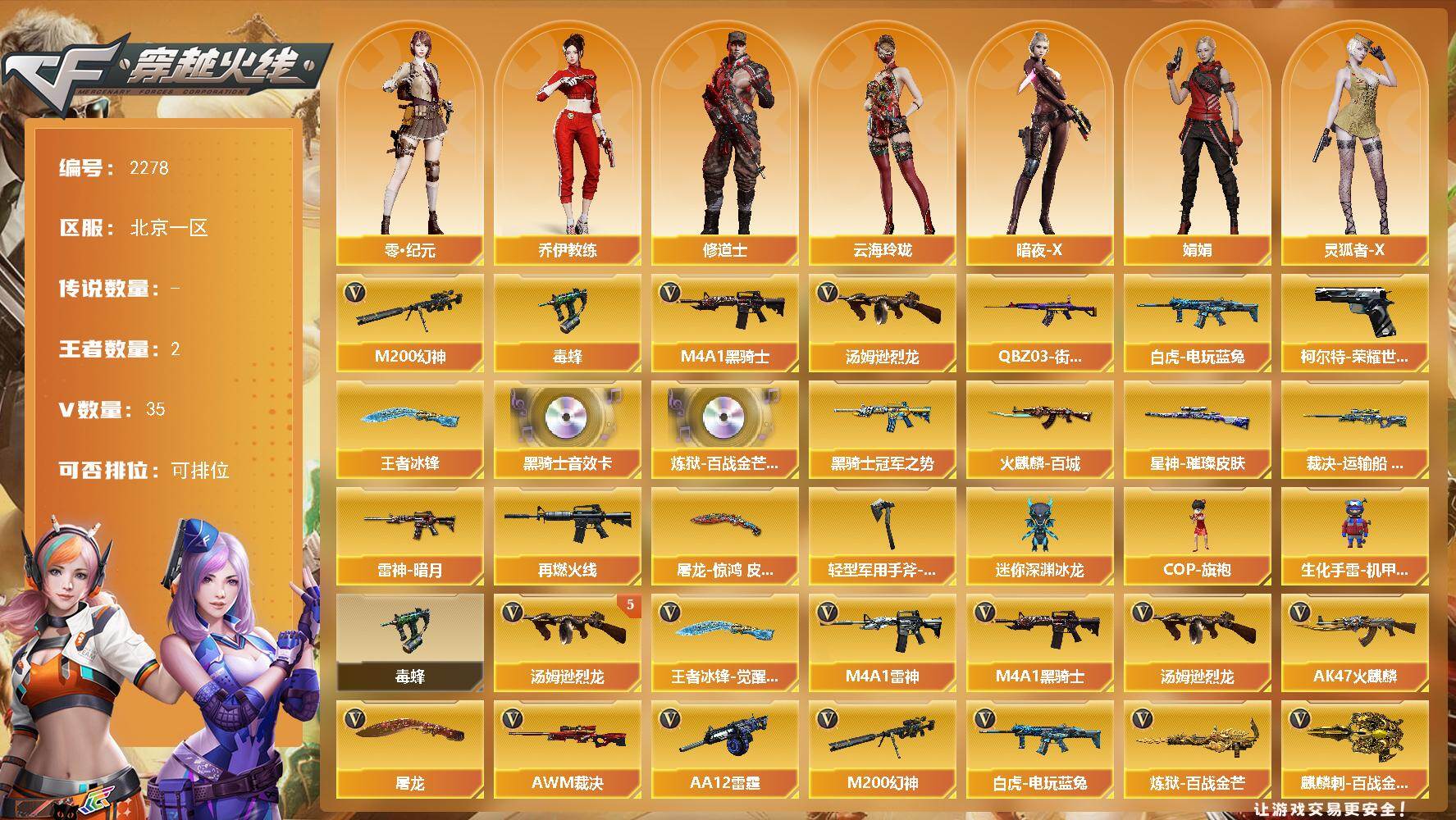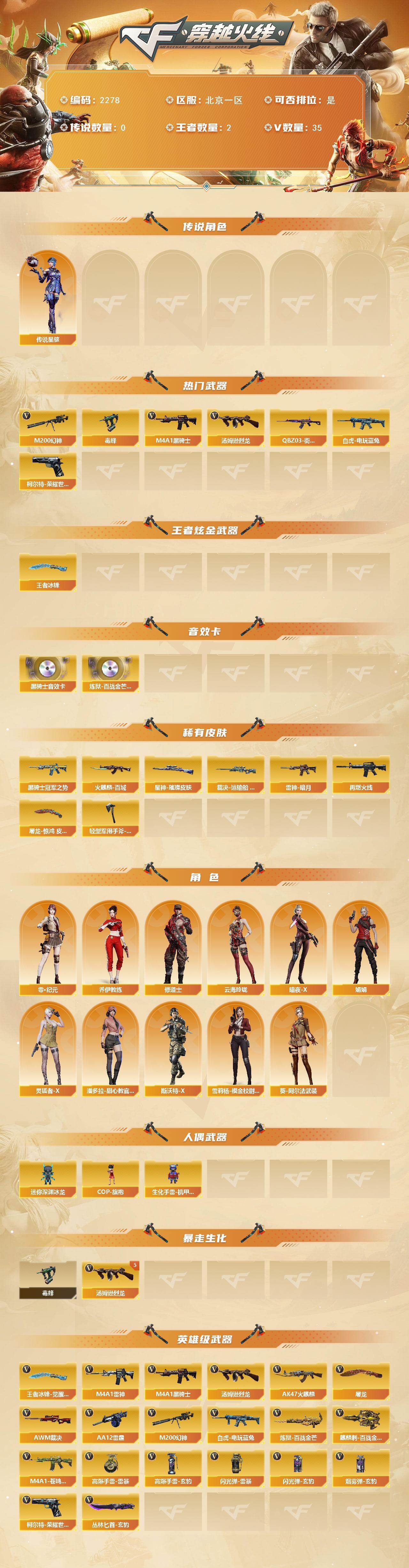 - [16911910]北京一区-36V-3王者武器数-0炫金武器数 【热门武器】:M200-幻神,凤吟之魄,QBZ03-街机,牛牛-AK47,M4A1-黑骑士,COP 357-幻灵 【王者炫金武器】:凤吟之魄,王者玉锋 【音效卡】:Barrett-极光音效卡 【皮肤】:幻神-冠军之幻,幻神-AG-CFPL S24冠军 皮肤,幻神-电竞之星 皮肤,雷神-暗月,雷神-源计划2.0专属 皮肤,龙啸-巅峰荣耀 皮肤 【角色】:司雨,王者影豹,蛇隐宗,乔伊教练,云海玲珑,电竞少女,猎狐者-追月,灵狐者-X,灵狐者-七夕宝贝,流浪蔷薇,龙儿-小淘气,曼陀罗-X,潘多拉-甜心教官,蛇姬,兔囡囡,新娜塔莎,影武者-X 【人偶武器】:Scar Light-马枪,牛牛-AK47,迷你牛牛,迷你生化手雷,深渊终结者手雷,AK12-烈火-灵狐者,灵狐娃娃手雷 【暴走生化】:双面神 【挑战大师】:冰龙粉碎者-白马银枪*2,机甲撕裂者III,KAC-圣炎切割者III 【英雄级武器】:AK47-火麒麟,M4A1-雷神,M4A1-黑骑士,AK12-天启,AK47-黑鲨,黑武士-锦绣游龙,王者风势-觉醒版,Barrett-极光,M200-幻神,烈龙-云海游龙,AA-12-雷霆,沙鹰-天神,COP 357-幻灵,龙啸*2,幻灵之锋,擎天-云海游龙,高爆手雷-幻灵,高爆手雷-竞技荣光*2,手雷-云海游龙,高爆手雷-古蛇迷踪,闪光弹-幻灵*2,闪光弹-竞技荣光,烟雾弹-幻灵*2,烟雾弹-竞技荣光,烟雾弹-古蛇迷踪 【道具】:云海游龙炫彩背包,冰冰企鹅背包,古蛇迷踪炫彩背包,背包-洛丽塔,绿色巨人,灵魂忍者,迷雾幽灵,夺命之镰*2,防化服*2,金色流光-枪王排位,星辰流光-枪王排位,枪王排位28赛季金色流光,枪王排位29赛季金色流光,古蛇迷踪打击特效,蛇隐宗表情,云海游龙表情,C4-黑曜,防弹头盔*2,防弹衣*2,C4工具钳*2,手雷包*2 【特殊枪械】:1黑骑士