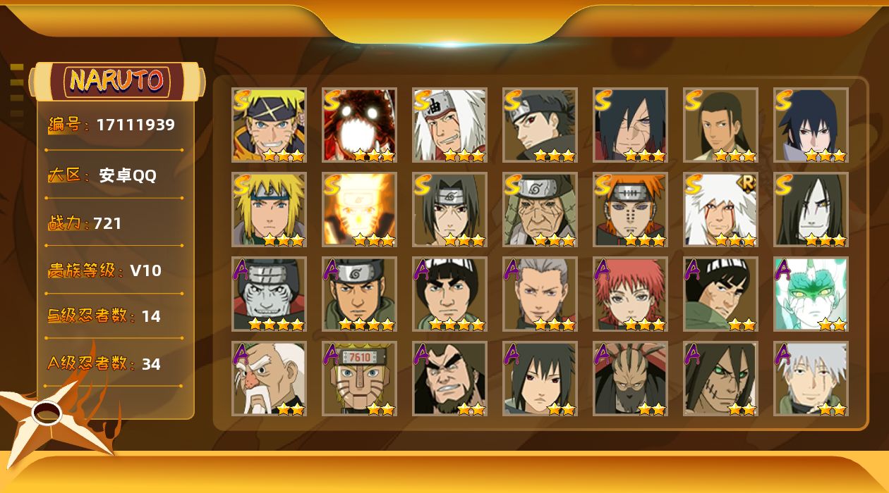 【S级忍者】:猿飞日斩「秽土转生」(3星),宇智波斑「秽土转生·解」(3星),宇智波鼬「须佐能乎」(3星),宇智波止水「须佐能乎」(3星),千手柱间「木叶创立」(3星),自来也「舞之豪杰」(3星),大蛇丸(3星),自来也「传说中的三忍」(3星),波风水门(3星),漩涡鸣人「九喇嘛连结」(3星),佩恩「天道」(3星),宇智波佐助「永恒万花筒」(3星),漩涡鸣人「暴怒·第六尾」(3星),漩涡鸣人·宇智波佐助(3星)