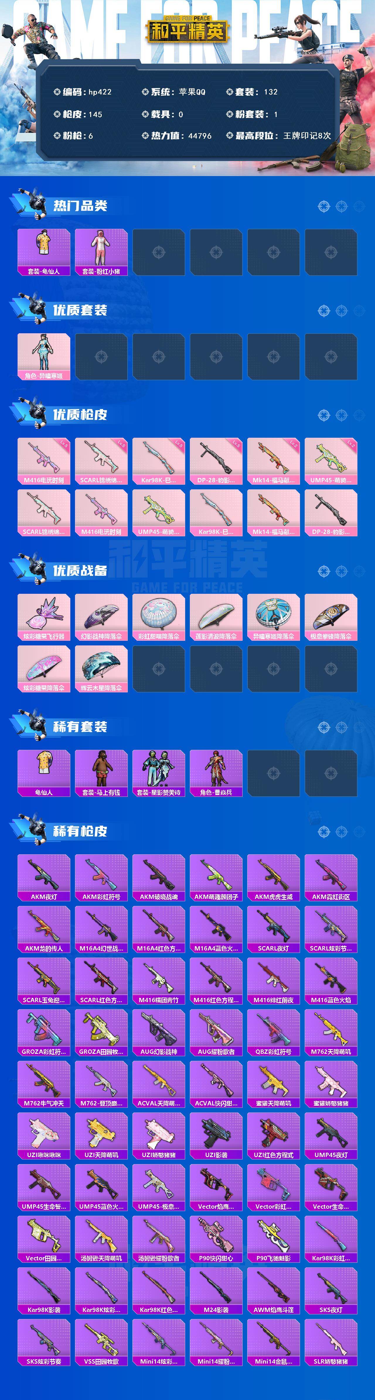 [17140032]苹果 手Q-1粉装-6特效枪-0载具-1粉色飞行器-44796热力值-8王牌印记-132套装-145枪皮 【热门品类】:套装-龟仙人,套装-粉红小猪 【粉色套装】:角色-异瞳寒姬 【粉色枪皮等级】:SCAR-L-锦绣绵绵(五级),M416-电玩时刻(五级),UMP45-萌骑冒险(二级),Kar98K-巳巳如意(五级),Mk14-福马献瑞(二级),DP-28-豹影疾电(五级) 【粉色枪皮】:SCAR-L-锦绣绵绵,M416-电玩时刻,UMP45-萌骑冒险,Kar98K-巳巳如意,Mk14-福马献瑞,DP-28-豹影疾电 【粉色飞行器】:炫彩糖果飞行器 【粉色降落伞】:幻影战神降落伞,彩虹甜喵降落伞,莲影清波降落伞,异瞳寒姬降落伞,极意拳锋降落伞,炫彩糖果降落伞,辉云木星降落伞 【稀有套装】:套装-龟仙人,套装-炫彩糖果,套装-马上有钱,套装-星影赞美诗,角色-曹焱兵 【稀有枪皮】:AUG-冰晶雪宝,AKM-夜灯,AKM-彩虹符号,AKM-破晓战魂,AKM-萌趣颜团子,AKM-虎虎生威,AKM-霓虹街区,AKM-龙的传人,M16A4-幻世战舞者,M16A4-红色方程式,M16A4-蓝色火焰,SCAR-L-夜灯,SCAR-L-炫彩节奏,SCAR-L-玉兔迎春,SCAR-L-红色方程式,M416-糯团青竹,M416-红色方程式,M416-绯红前夜,M416-蓝色火焰,GROZA-彩虹符号,GROZA-田园牧歌,AUG-幻影战神,AUG-耀粉歌者,QBZ-彩虹符号,M762-天降萌叽,M762-牛气冲天,M762-登顶巅峰,AC-VAL-天降萌叽,AC-VAL-快闪甜心,蜜獾-天降萌叽,蜜獾-娇憨猪猪,UZI-啾咪啾咪,UZI-天降萌叽,UZI-娇憨猪猪,UZI-影袭,UZI-红色方程式,UMP45-夜灯,UMP45-生命誓言,UMP45-蓝色火焰,UMP45-极意拳锋,Vector-焰鹰斗篷,Vector-彩虹符号,Vector-生命誓言,Vector-田园牧歌,汤姆逊-天降萌叽,汤姆逊-耀粉歌者,P90-快闪甜心,P90-飞驰魅影,Kar98K-彩虹符号,Kar98K-影袭,Kar98K-炫彩节奏,Kar98K-红色方程式,M24-影袭,AWM-焰鹰斗篷,SKS-夜灯,SKS-炫彩节奏,VSS-田园牧歌,Mini14-炫彩节奏,Mini14-耀粉歌者,Mini14-金鼠