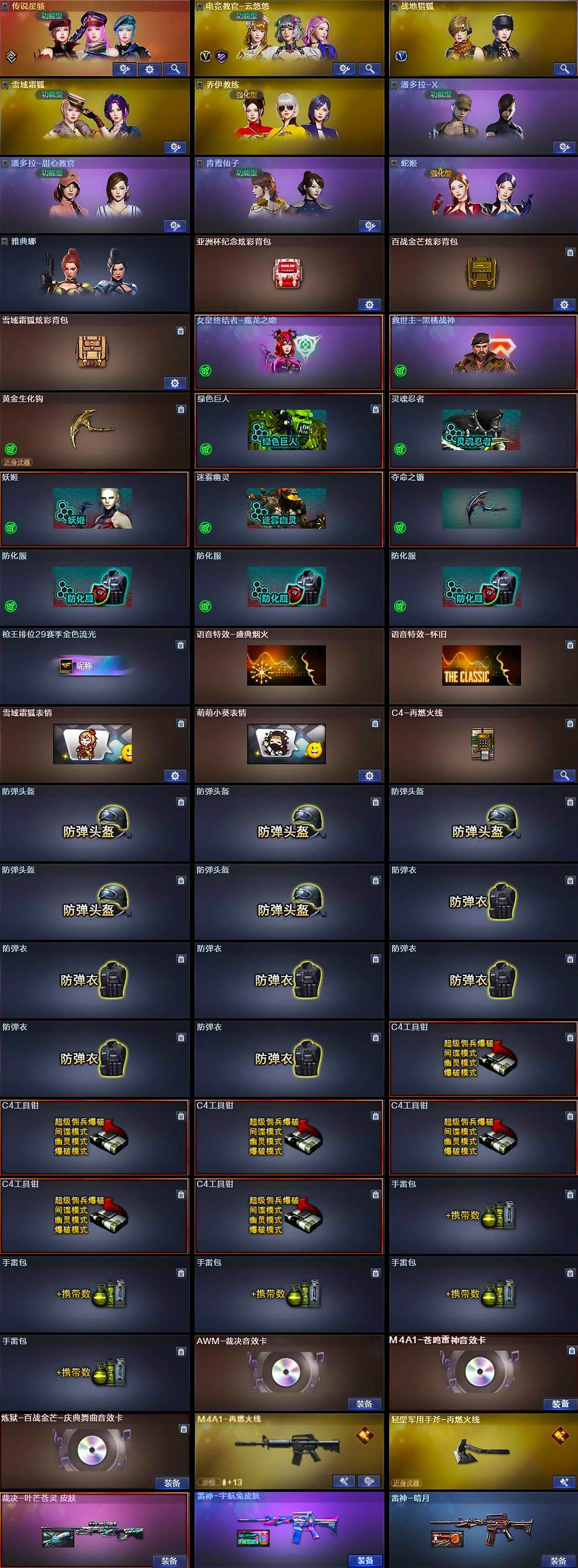 【道具】:亚洲杯纪念炫彩背包,百战金芒炫彩背包,雪域霜狐炫彩背包,女皇终结者-魔龙之吻,救世主-黑桃战神,黄金生化钩,绿色巨人,灵魂忍者,妖姬,迷雾幽灵,夺命之镰,防化服*3,枪王排位29赛季金色流光,语音特效-盛典烟火,语音特效-怀旧,雪域霜狐表情,萌萌小葵表情,C4-再燃火线,防弹头盔*5,防弹衣*6,C4工具钳*6,手雷包*5