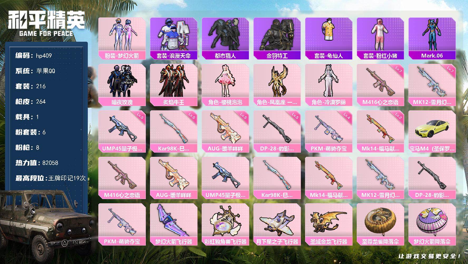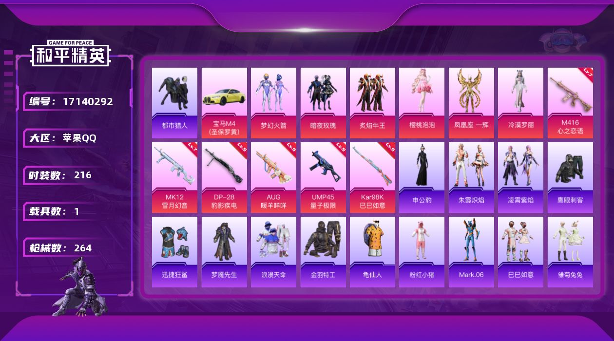 [17140292]苹果 手Q-6粉装-8特效枪-1载具-5粉色飞行器-82058热力值-19王牌印记-216套装-264枪皮