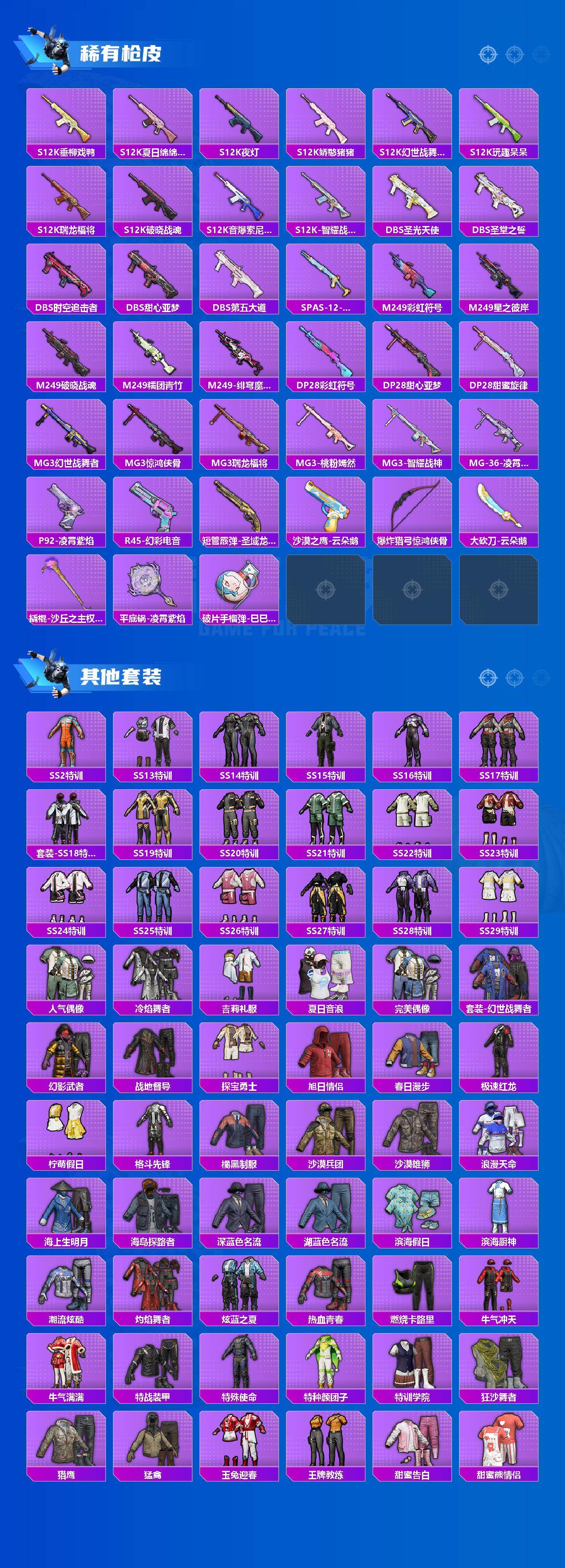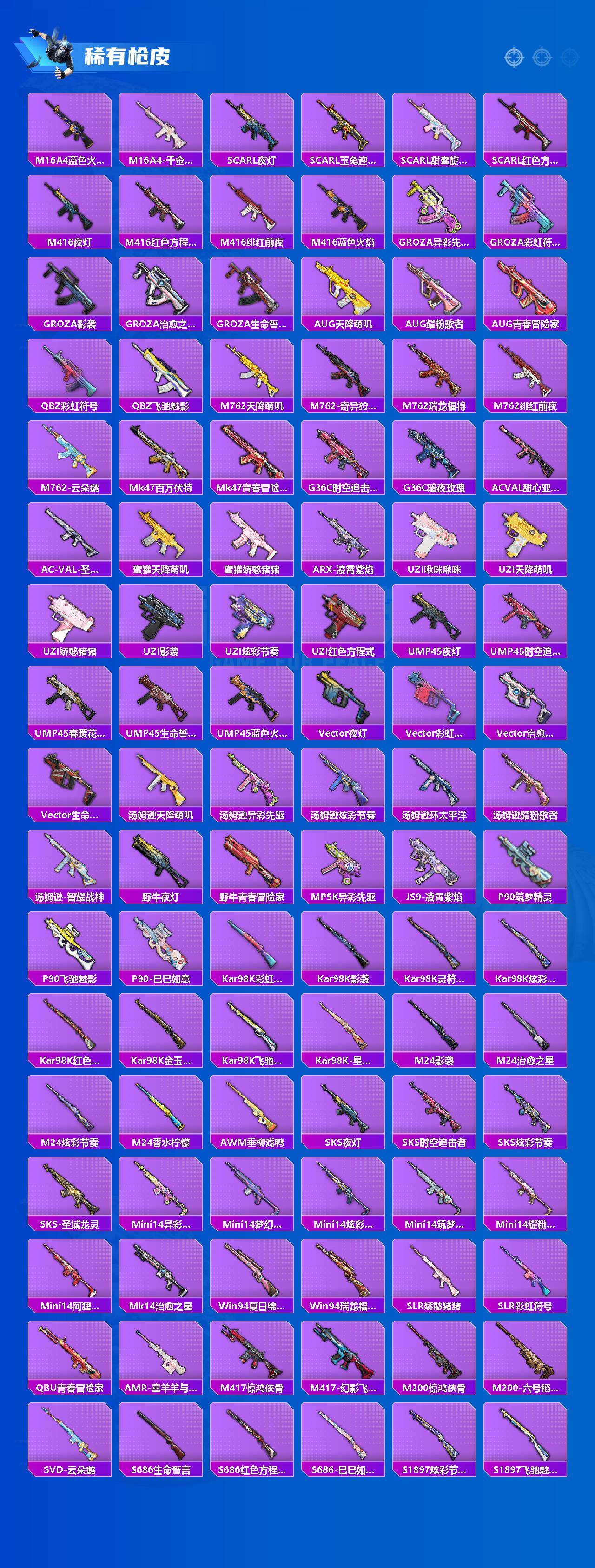 【稀有枪皮】:AKM-夜灯,AKM-彩虹符号,AKM-影袭,AKM-星之彼岸,AKM-灼热熔岩,AKM-破晓战魂,AKM-萌趣颜团子,AKM-虎虎生威,AKM-龙的传人,M16A4-幻世战舞者,M16A4-甜心亚梦,M16A4-红色方程式,M16A4-蓝色火焰,M16A4-千金淑猫,SCAR-L-夜灯,SCAR-L-玉兔迎春,SCAR-L-甜蜜旋律,SCAR-L-红色方程式,M416-夜灯,M416-红色方程式,M416-绯红前夜,M