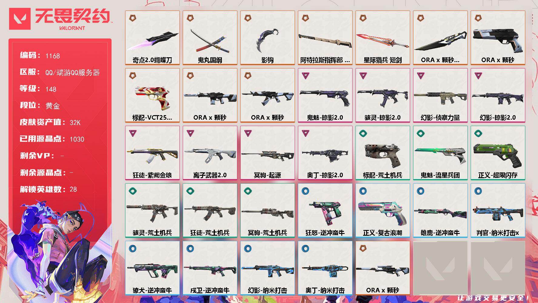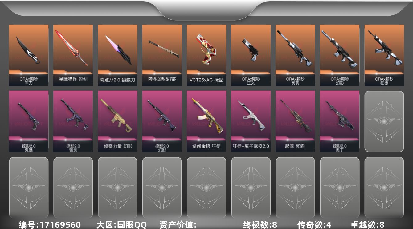 [17169560]【近战武器】:近战武器-ORA x 颗秒 军刀,近战武器-影钩,近战武器-奇点//2.0 蝴蝶刀,近战武器-鬼丸国纲,近战武器-阿特拉斯指挥部 甩棍,近战武器-星际猎兵 短剑 【狂徒】:狂徒-ORA x 颗秒,狂徒-紫阙金琅,狂徒-离子武器//2.0,狂徒-荒土机兵 【幻影】:幻影-ORA x 颗秒,幻影-侦察力量,幻影-掠影//2.0,幻影-纳米打击 【戍卫】:戍卫-逆冲蛮牛 【獠犬】:獠犬-逆冲蛮牛 【冥驹】:冥驹-ORA x 颗秒,冥驹-起源,冥驹-荒土机兵 【奥丁】:奥丁-掠影//2.0,奥丁-纳米打击 【判官】:判官-纳米打击x 【雄鹿】:雄鹿-逆冲蛮牛 【骇灵】:骇灵-掠影//2.0,骇灵-荒土机兵 【标配】:标配-荒土机兵 【VCT手枪】:标配-VCT25 x AG 【正义】:正义-ORA x 颗秒,正义-超限闪存,正义-复古浪潮 【鬼魅】:鬼魅-掠影//2.0,鬼魅-流星兵团 【狂怒】:狂怒-逆冲蛮牛 【卡面】:进入射程 卡面,纳米打击 卡面,抑制技术 卡面,激斗汉堡 卡面,瓦娃脸雪糕 P2 卡面,从黄昏到黎明 卡面,荒土机兵 卡面,银弹猎手 卡面,逆冲蛮牛 卡面,《双城之战》拥抱 卡面,精灵大战 卡面,欢迎来到底城 卡面,南瓜盛典 卡面,修车达人 卡面,正义的化身 卡面,时间到 卡面,最高舞台 卡面,声感陷阱设计图 卡面,梦幻奶茶 卡面,终章:打造专属狂徒 卡面,趁热吃 卡面,无畏契约:尚勃勒 卡面,源能反应 卡面,流星兵团 卡面,零点嗅探设计图 卡面,表象之下 卡面,沙雕爆能器 卡面,无畏契约GO!第一卷:芮娜 卡面,清除名单 卡面,无畏契约GO!第一卷:零 卡面,暗枪 卡面,代号红色 卡面,新兵报到 卡面,V契约 卡面,无畏契约 卡面 【喷漆】:小小心意 喷漆,战“素”兔 喷漆,宇宙的指引 喷漆,请求重启 喷漆,逆冲蛮牛 喷漆,纳米打击 喷漆,鼻尖上的蝴蝶 喷漆,简笔画黯兽 喷漆,独守蝰腹 喷漆,他们将落荒而逃 喷漆,通缉:战术企鹅 喷漆,荒土机兵 喷漆,别挡我吃球! 喷漆,嗨宝南瓜灯 喷漆,嘭! 喷漆,都算到了 喷漆,控场勿近 喷漆,小丑猫 喷漆,熊抱 喷漆,超级粉丝 喷漆,捷风差距 喷漆,惊声尖叫 喷漆,拼一枪 喷漆,尚勃勒 喷漆,分身有术 喷漆,我觉得不行 喷漆,致命优雅 喷漆,我的刀呢? 喷漆,UWU 喷漆,新潮流 喷漆,双击点赞 喷