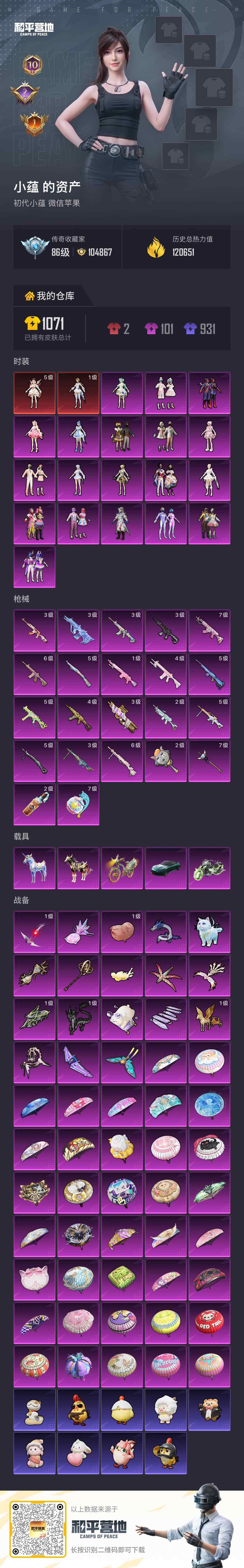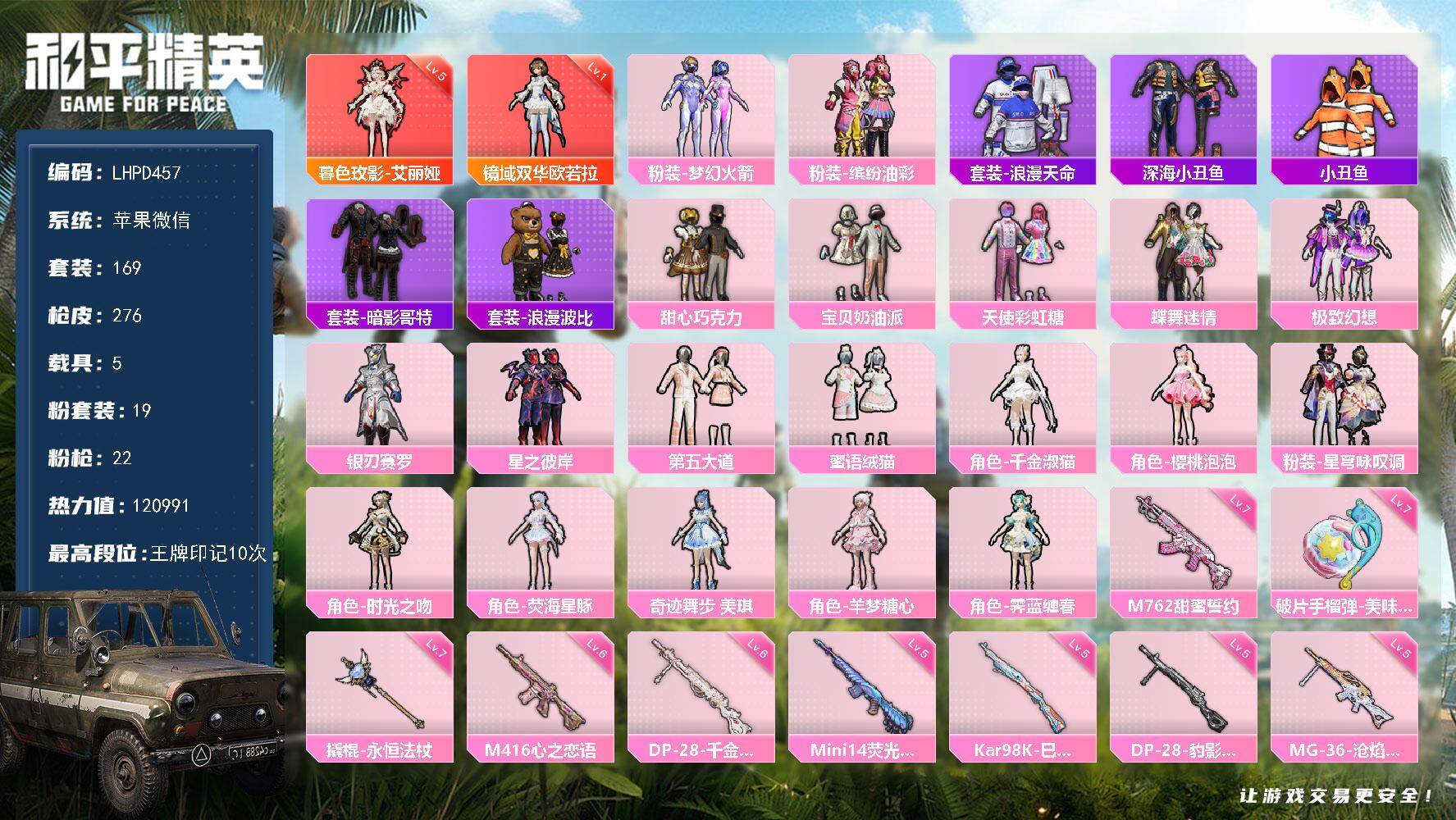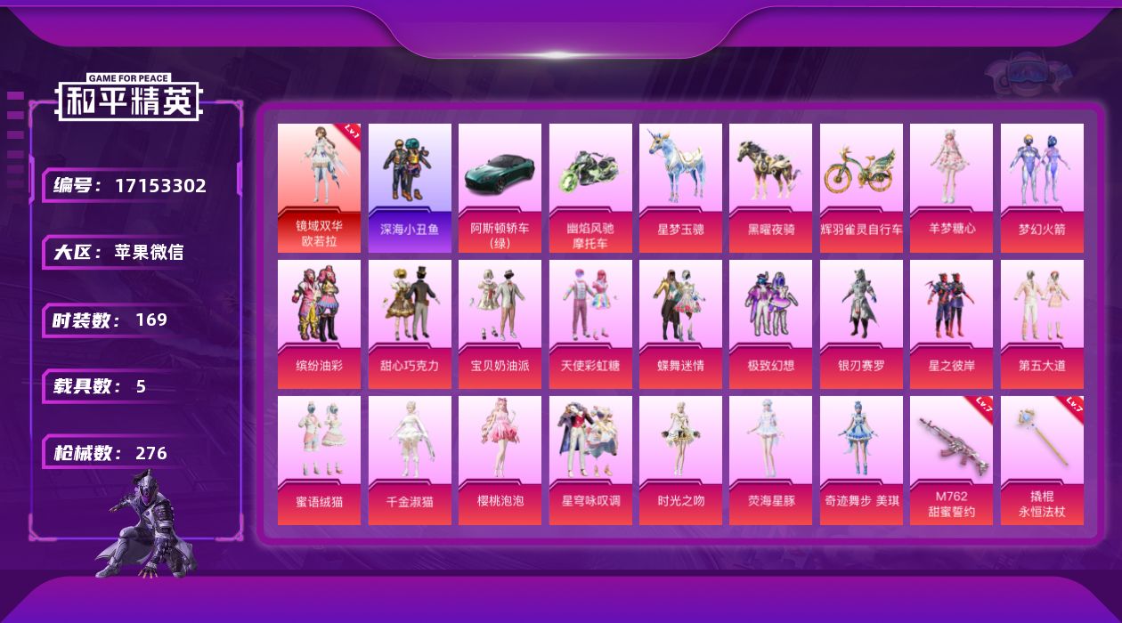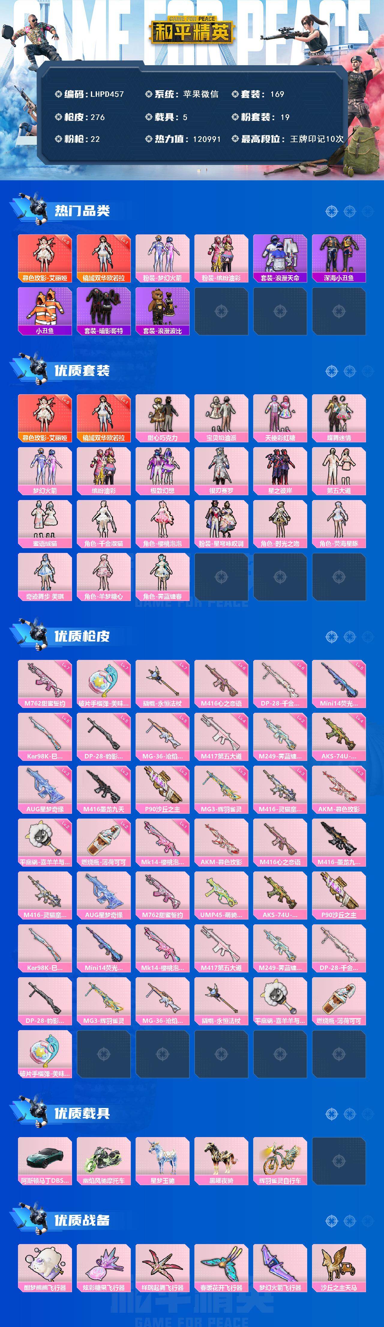 [17153302]【店主推荐捡漏号!可直接换绑】苹果 微信-2神装-19粉装-22特效枪-5载具-18粉色飞行器-120991热力值-10王牌印记-169套装-276枪皮【红色神装等级】:暮色玫影-艾丽娅(五级),镜域双华-欧若拉(一级)【红色角色神装】:暮色玫影-艾丽娅,镜域双华-欧若拉【热门品类】:粉装-梦幻火箭,粉装-缤纷油彩,套装-浪漫天命,套装-深海小丑鱼,套装-小丑鱼,套装-暗影哥特,套装-浪漫波比【粉色套装】:粉装-甜心巧克力,粉装-宝贝奶油派,粉装-天使彩虹糖,粉装-蝶舞迷情,粉装-梦幻火箭,粉装-缤纷油彩,粉装-极致幻想,粉装-银刃赛罗,粉装-星之彼岸,粉装-第五大道,粉装-蜜语绒猫,角色-千金淑猫,角色-樱桃泡泡,粉装-星穹咏叹调,角色-时光之吻,角色-荧海星豚,角色-奇迹舞步 美琪,角色-羊梦糖心,角色-霁蓝缠春【粉色枪皮等级】:AKM-暮色玫影(三级),M416-心之恋语(六级),M416-墨龙九天(三级),M416-灵猫魔法师(三级),AUG-星梦奇缘(三级),M762-甜蜜誓约(七级),AKS-74U-森灵之息(四级),P90-沙丘之主(三级),Kar98K-巳巳如意(五级),Mini14-荧光虫舞(五级),Mk14-樱桃泡泡(一级),M417-第五大道(四级),M249-霁蓝缠春(二级),DP-28-千金淑猫(六级),DP-28-豹影疾电(五级),MG3-辉羽雀灵(三级),MG-36-沧焰双生(五级),撬棍-永恒法杖(七级),平底锅-喜羊羊与灰太狼(二级),燃烧瓶-薄荷可可(二级),破片手榴弹-美味星星糖(七级)【粉色载具】:阿斯顿马丁DBS(绿),幽焰风驰摩托车,星梦玉骢,黑曜夜骑,辉羽雀灵自行车【粉色枪皮】:AKM-暮色玫影,M416-心之恋语,M416-墨龙九天,M416-灵猫魔法师,AUG-星梦奇缘,M762-甜蜜誓约,UMP45-萌骑冒险,AKS-74U-森灵之息,P90-沙丘之主,Kar98K-巳巳如意,Mini14-荧光虫舞,Mk14-樱桃泡泡,M417-第五大道,M249-霁蓝缠春,DP-28-千金淑猫,DP-28-豹影疾电,MG3-辉羽雀灵,MG-36-沧焰双生,撬棍-永恒法杖,平底锅-喜羊羊与灰太狼,燃烧瓶-薄荷可可,破片手榴弹-美味星星糖【粉色飞行器】:酣梦熊熊飞行器,炫彩糖果飞行器,祥瑞起舞飞行器,春暖花开飞行器,梦幻火箭飞行器
