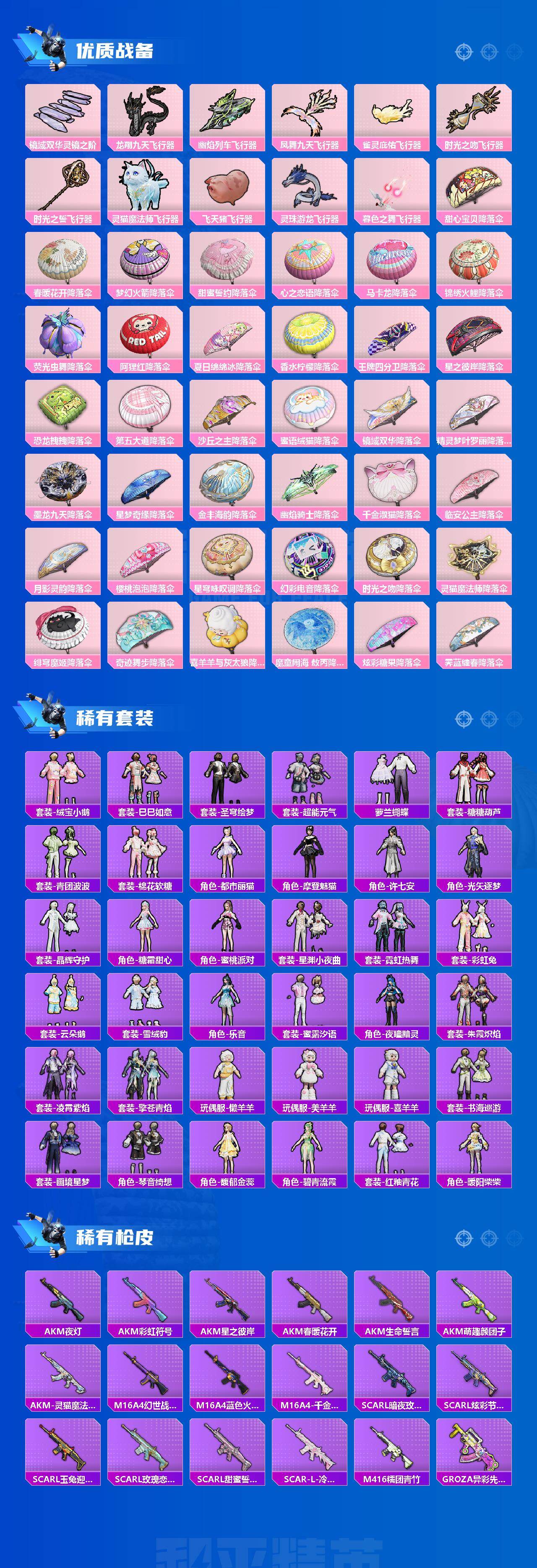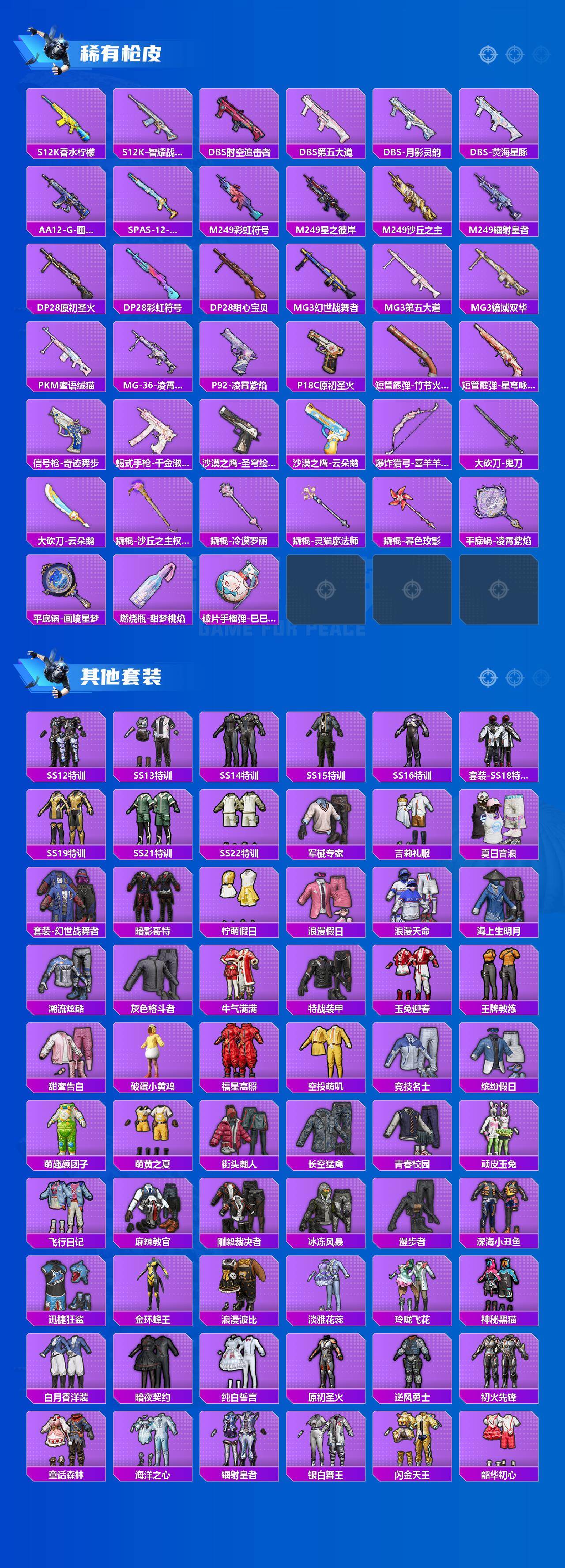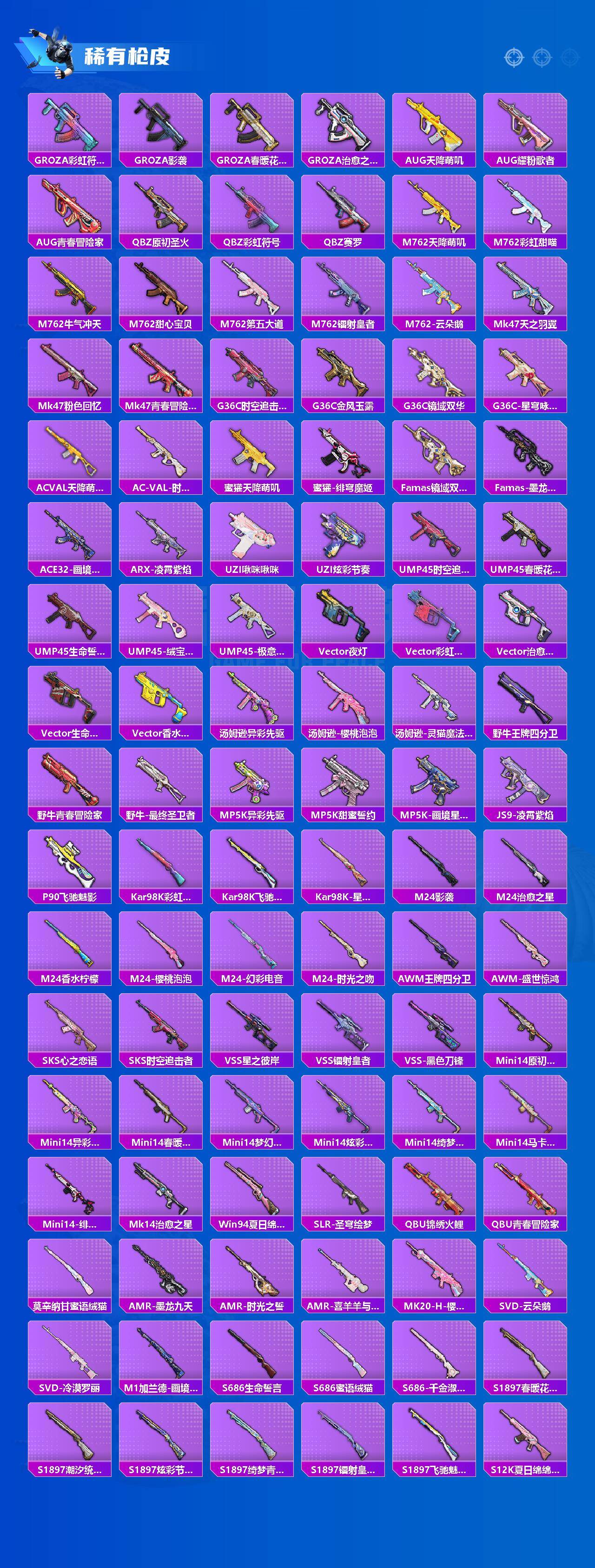 M416-心之恋语,M416-墨龙九天,AUG-星梦奇缘,M762-甜蜜誓约,P90-沙丘之主,Kar98K-巳巳如意,Mini14-荧光虫舞,Mk14-樱桃泡泡,M417-第五大道,DP-28-千金淑猫