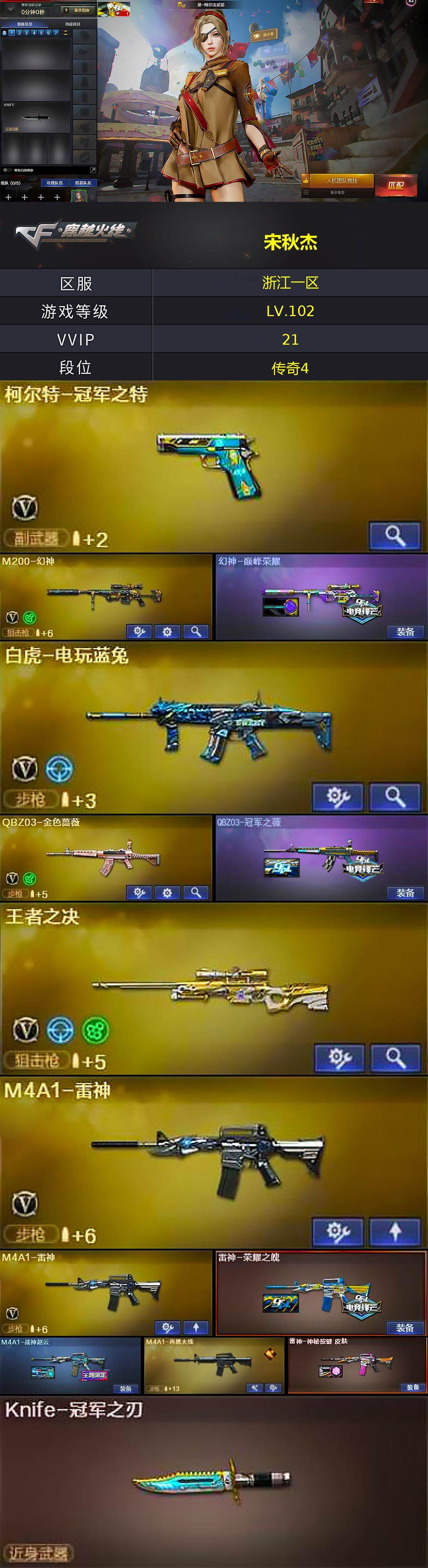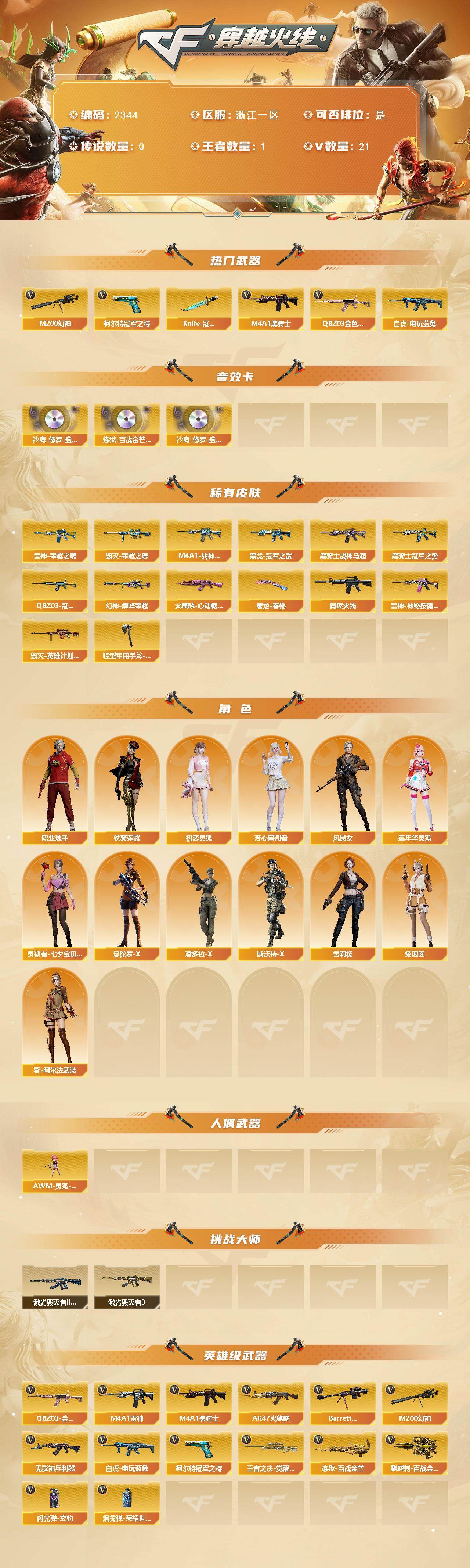 [17157332]浙江一区-22V-1王者武器数-0炫金武器数 【热门武器】:QBZ03-金色蔷薇,M200-幻神,白虎-电玩蓝兔,柯尔特-冠军之特,M4A1-黑骑士*2,Knife-冠军之刃 【音效卡】:沙鹰-修罗-盛典舞曲音效卡*2,炼狱-百战金芒-庆典舞曲音效卡 【皮肤】:幻神-巅峰荣耀,QBZ03-冠军之薇,雷神-荣耀之魄,M4A1-战神赵云,M4A1-再燃火线,雷神-神秘按键 皮肤,火麒麟-心动糖果,毁灭-荣耀之怒,毁灭-英雄计划 皮肤,黑龙-冠军之武,黑骑士-冠军之势,黑骑士-战神马超,屠龙-春桃 皮肤,轻型军用手斧-再燃火线 【角色】:葵-阿尔法武装,初恋灵狐,芳心审判者,风暴女,嘉年华灵狐,灵狐者-七夕宝贝,曼陀罗-X,潘多拉-X,斯沃特-X,铁骑荣耀,兔囡囡,雪莉杨,职业选手 【人偶武器】:AWM-灵狐-15周年嘉年华*2 【挑战大师】:激光毁灭者III-白马银枪,激光毁灭者III*2 【英雄级武器】:AK47-火麒麟*2,M4A1-雷神*2,M4A1-黑骑士*2,无影-神兵利器,QBZ03-金色蔷薇,白虎-电玩蓝兔,Barrett-毁灭,M200-幻神,王者之决-觉醒版,炼狱-百战金芒,柯尔特-冠军之特,麒麟刺-百战金芒,闪光弹-玄豹*2,烟雾弹-荣耀世冠EP 【道具】:EP战队炫彩背包,KZ战队炫彩背包,全能枪王背包,百战金芒炫彩背包,女皇终结者-魔龙之吻,绿色巨人,灵魂忍者,迷雾幽灵,夺命之镰,防化服*3,金色流光-枪王排位*2,枪王排位29赛季金色流光,语音特效-盛典烟火,萌萌小葵表情,电玩兔兔表情,防弹头盔*4,防弹衣*4,C4工具钳*4,手雷包*4 【特殊枪械】:2黑骑士
