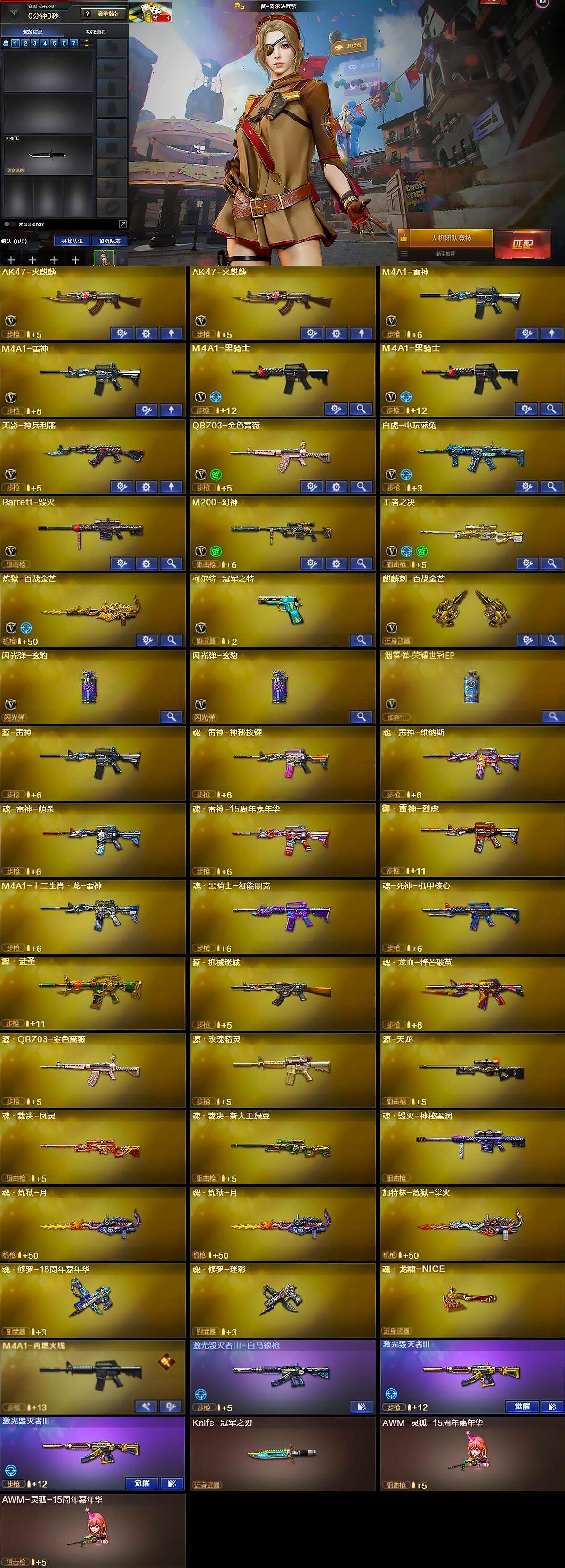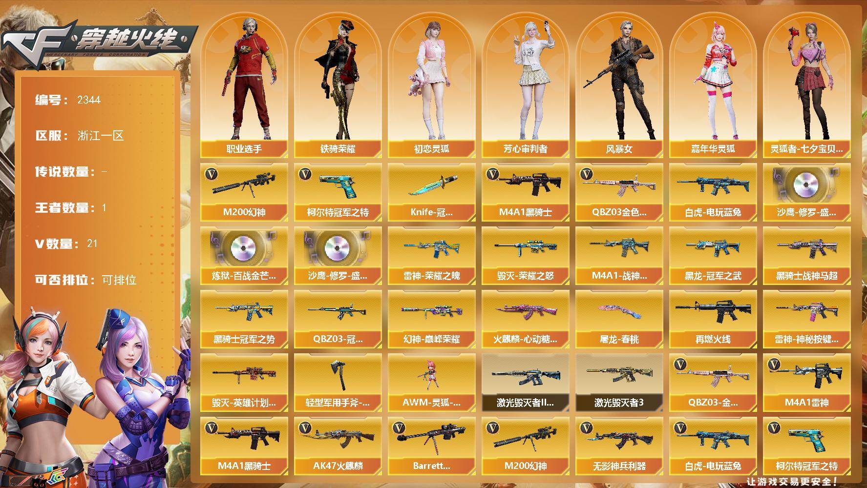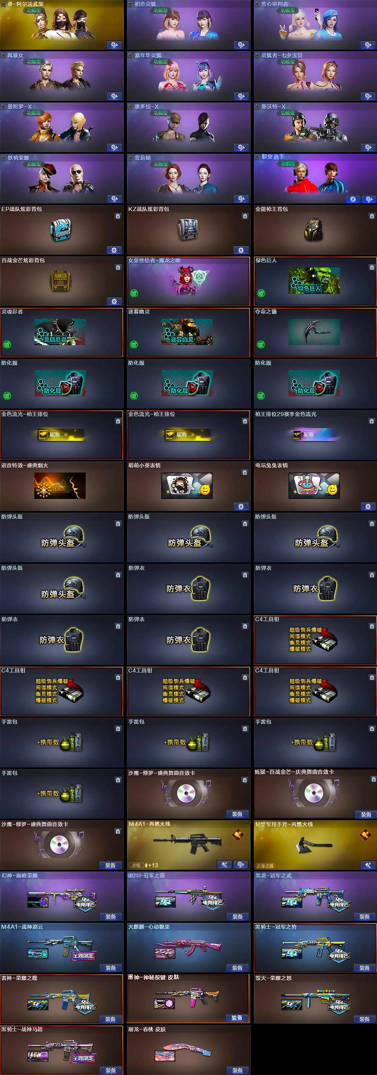 - [14522910]127V/100级/元帅/7王者/1炫金/3英雄/QBZ03-金色蔷薇/M200-幻神/M200-竞技荣光/死亡之眼/火麒麟-荣耀世冠/白虎-电玩蓝兔/金色小号/炼狱-迷你小钢/M4A1-黑骑士/汤姆逊-烈龙/RPK-盘龙/斯泰尔蝴蝶/羊驼玩偶/裁决-雪莉杨/火麒麟-绝迹/沙鹰-修罗/炫金毁灭/M4A1-黑骑士音效卡/Barrett-毁灭音效卡/幻神-宠儿/雷神-能量核心/M4A1-战神赵云/雷神-宠儿-2019MVP/火麒麟-AG战队皮肤/火麒麟-华夏之心/AK47-火麒麟-传奇EVEN/火麒麟-轻羽皮肤/火麒麟-平天大圣/火麒麟-百城/火麒麟-心动糖果/黑骑士-冠军之势/黑骑士-伏羲/毁灭-星空/毁灭-战神张飞/毁灭-风暴/AWM-天龙-传奇70KG/AWM-天龙-传奇白鲨/王者-魅影/王者-迷迭香/魅影/炫/电竞教官-云悠悠/蜀雪/炽天使/青霞仙子/Barrett-夜玫瑰/M37-葵/COP-旗袍/迷你超能女侍/迷你生化手雷/深渊终结者手雷/闪光弹-小乔/闪光弹-貂蝉/高爆手雷-大乔/超级对讲机/6盘龙/5烈龙/神圣爆裂者/阐释者/激光毁灭者III-白马银枪/柯尔特-竞技荣光/擎天-竞技荣光/高爆手雷-竞技荣光/烟雾弹-竞技荣光/闪光弹-竞技荣光/幻灵之锋/马来剑夜魔/斩神刀-雷暴/M4A1-雷霆/荣耀世冠-火麒麟/M4A1-雷神/M4A1-黑龙/M4A1-死神/AK47-火麒麟/AK47-黑武士/AK12-天启/AWM-天龙/Barrett-毁灭/Barrett-极光/AWM-裁决/AA-12-雷霆/AK47-黑鲨/AK-47-猩红传说/AK47-B-战神/AK47-B-常胜将军/炼狱-风暴/M4A1-赤狱骑士/沙鹰-天神/麒麟刺/擎天/龙啸/屠龙