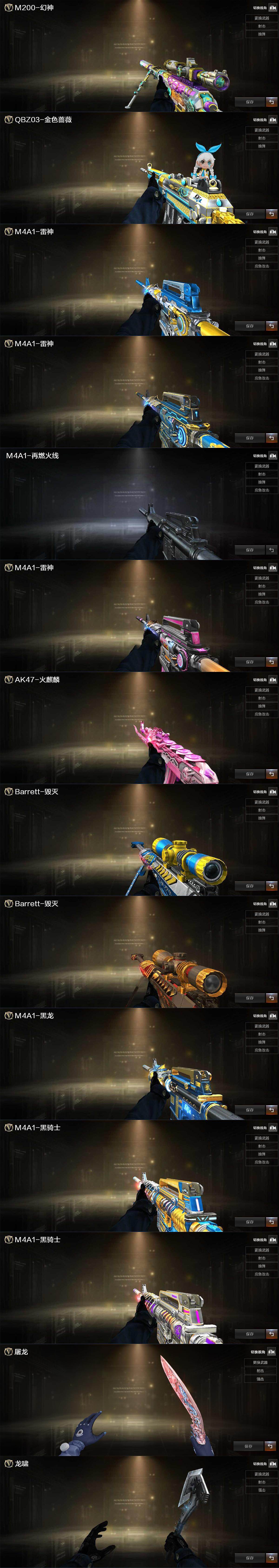 【热门武器】:QBZ03-金色蔷薇,M200-幻神,白虎-电玩蓝兔,柯尔特-冠军之特,M4A1-黑骑士*2,Knife-冠军之刃