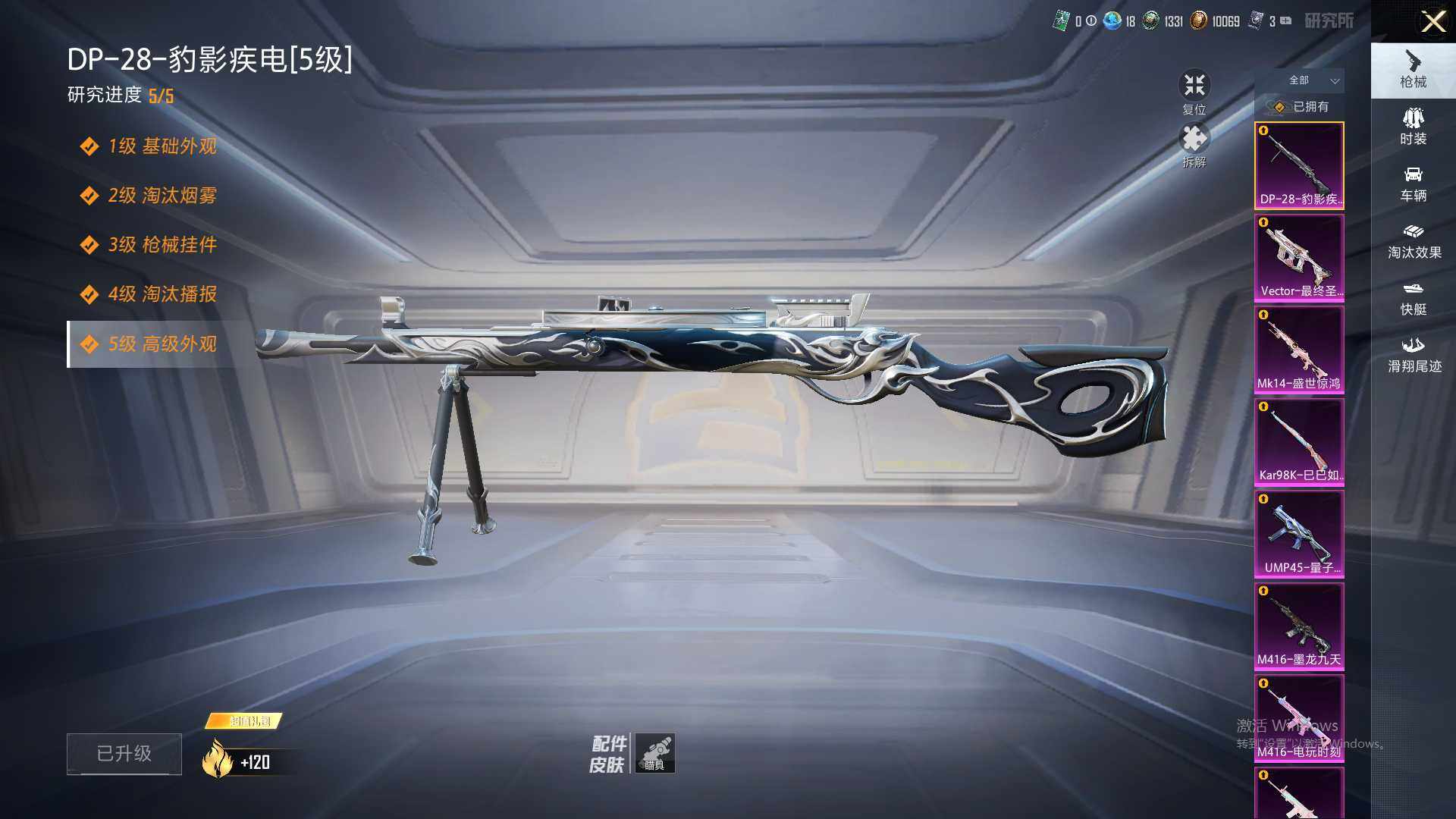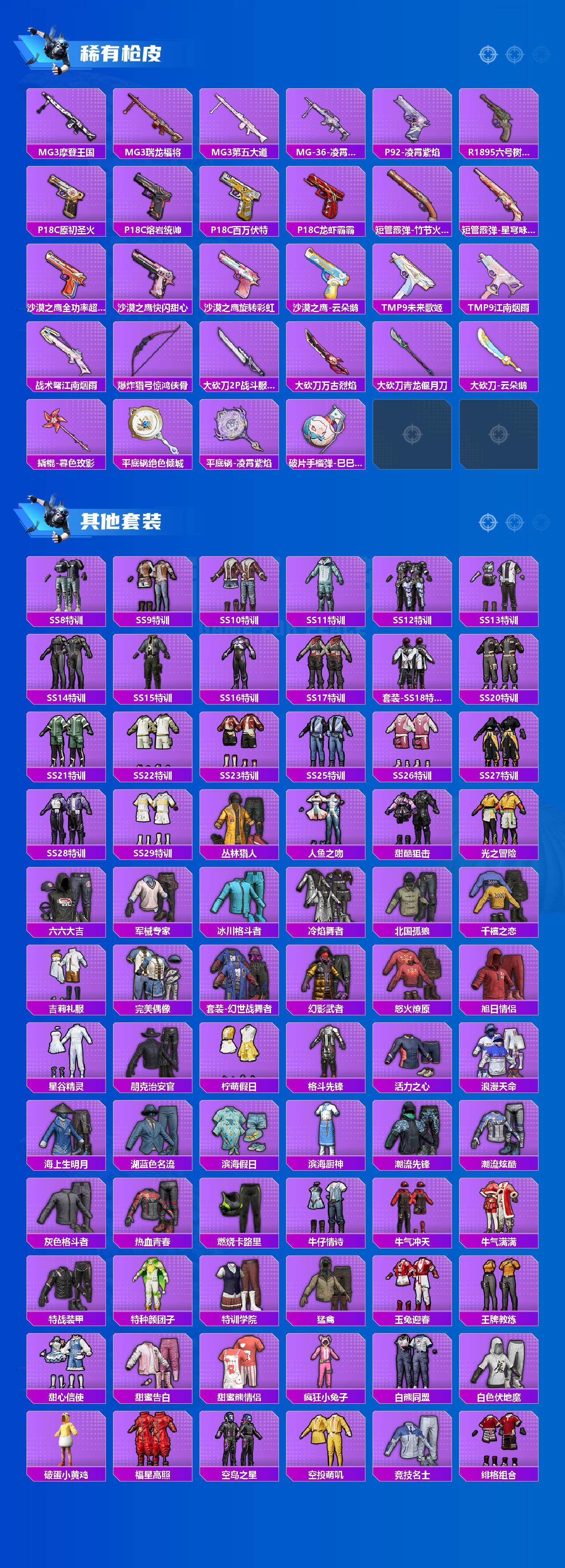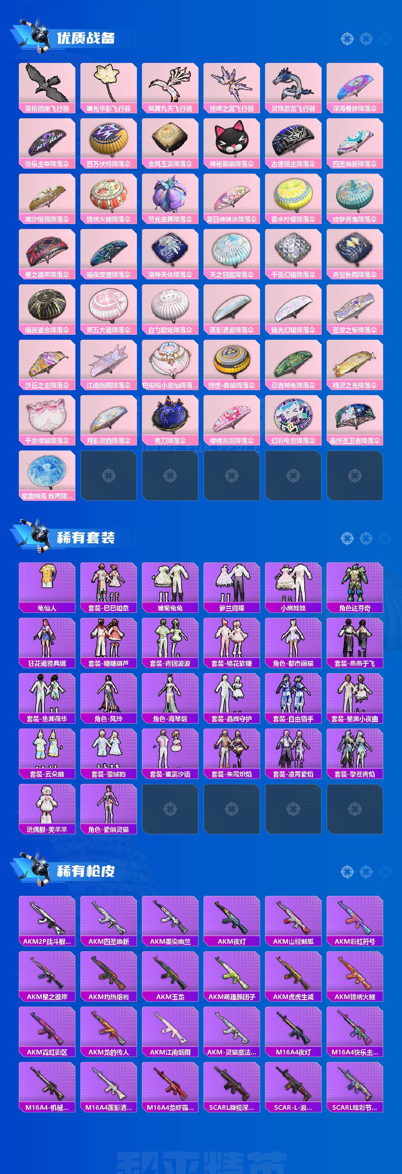 AKM-绿萝繁花,SCAR-L-锦绣绵绵,M416-心之恋语,M416-电玩时刻,M416-墨龙九天,AUG-星之彼岸,UMP45-量子极限,Kar98K-巳巳如意,Mk14-盛世惊鸿,M417-第五大道,MG3-洛神天依