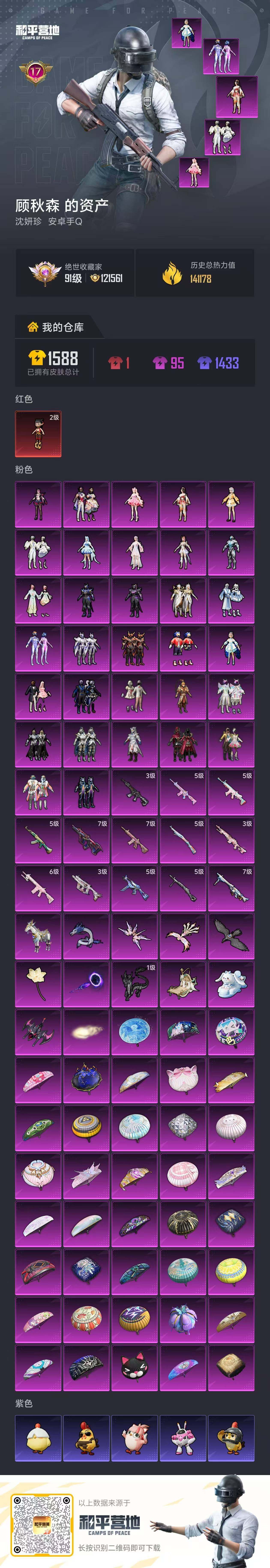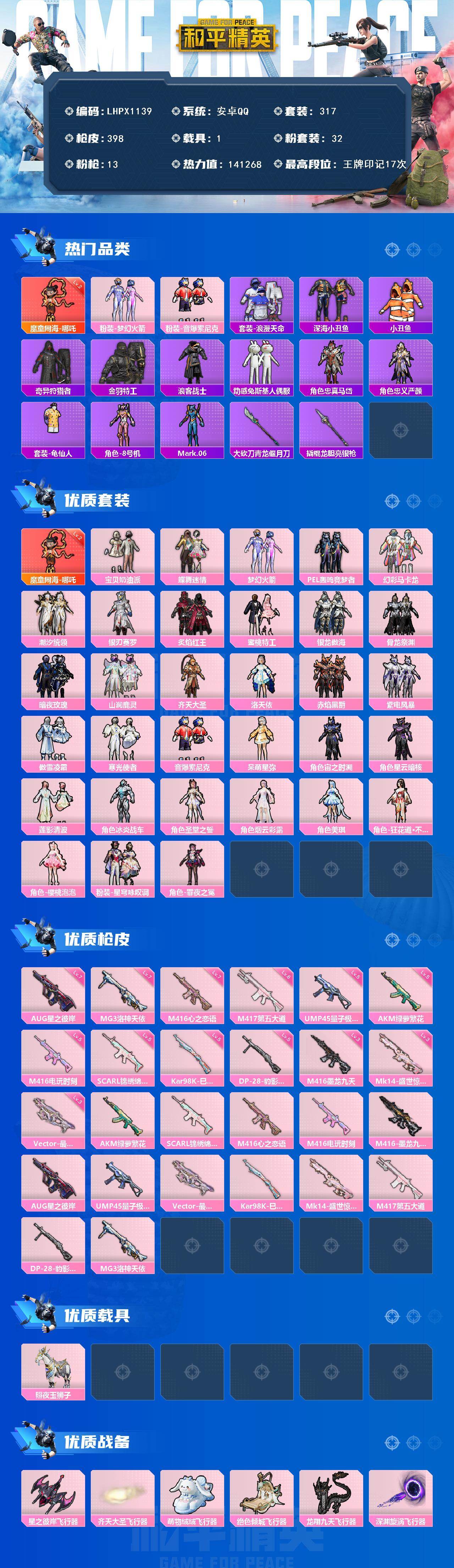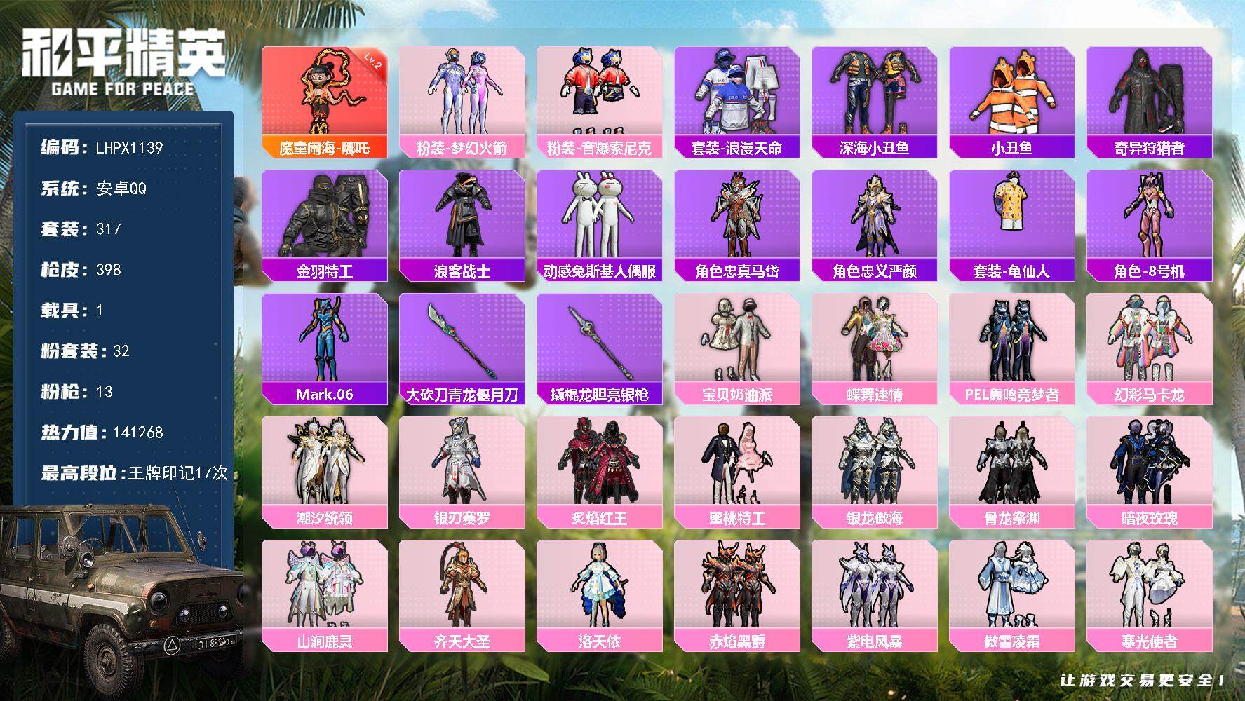 [17179100]可二次【特价出售/店主推荐】安卓 手Q-1神装-32粉装-13特效枪-1载具-11粉色飞行器-141268热力值-17王牌印记-317套装-398枪皮