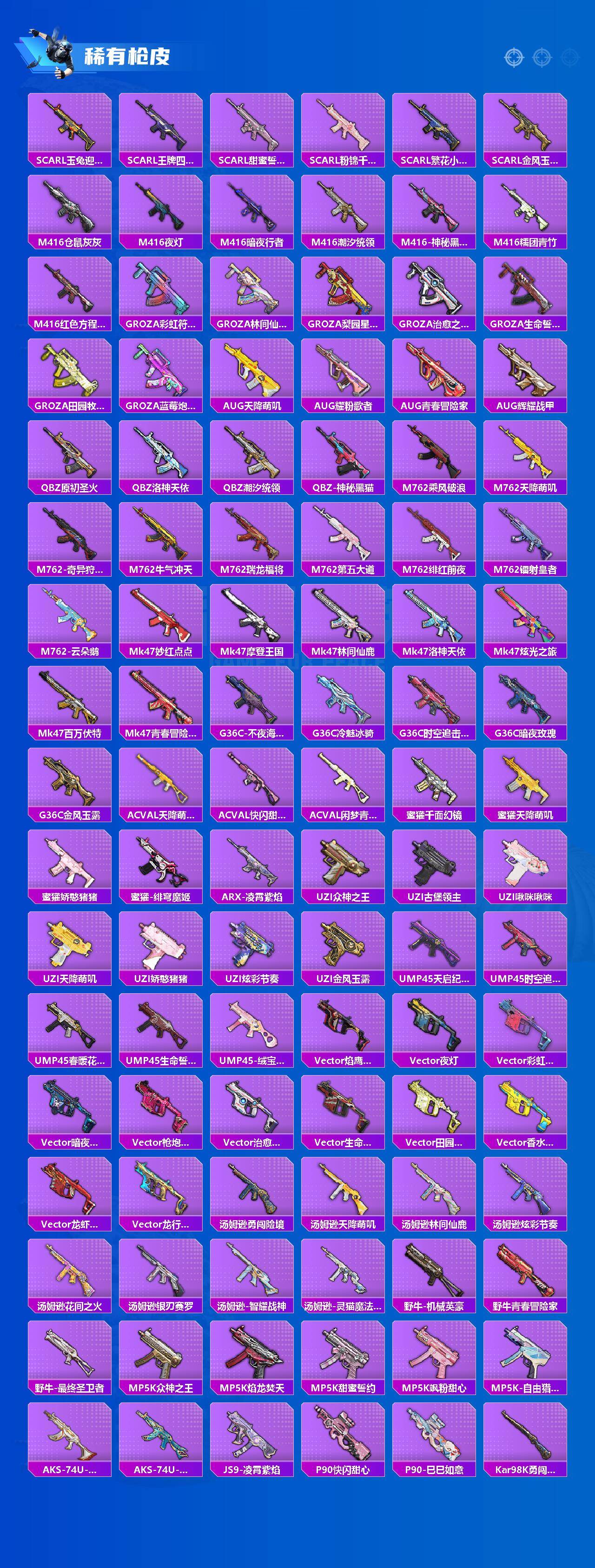 【粉色枪皮】:AKM-绿萝繁花,SCAR-L-锦绣绵绵,M416-心之恋语,M416-电玩时刻,M416-墨龙九天,AUG-星之彼岸,UMP45-量子极限,Vector-最终圣卫者,Kar98K-巳巳如意,Mk14-盛世惊鸿,M417-第五大道,DP-28-豹影疾电,MG3-洛神天依