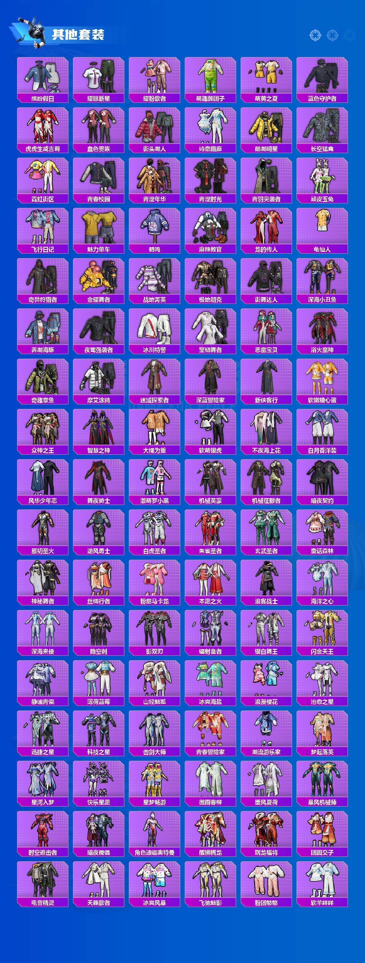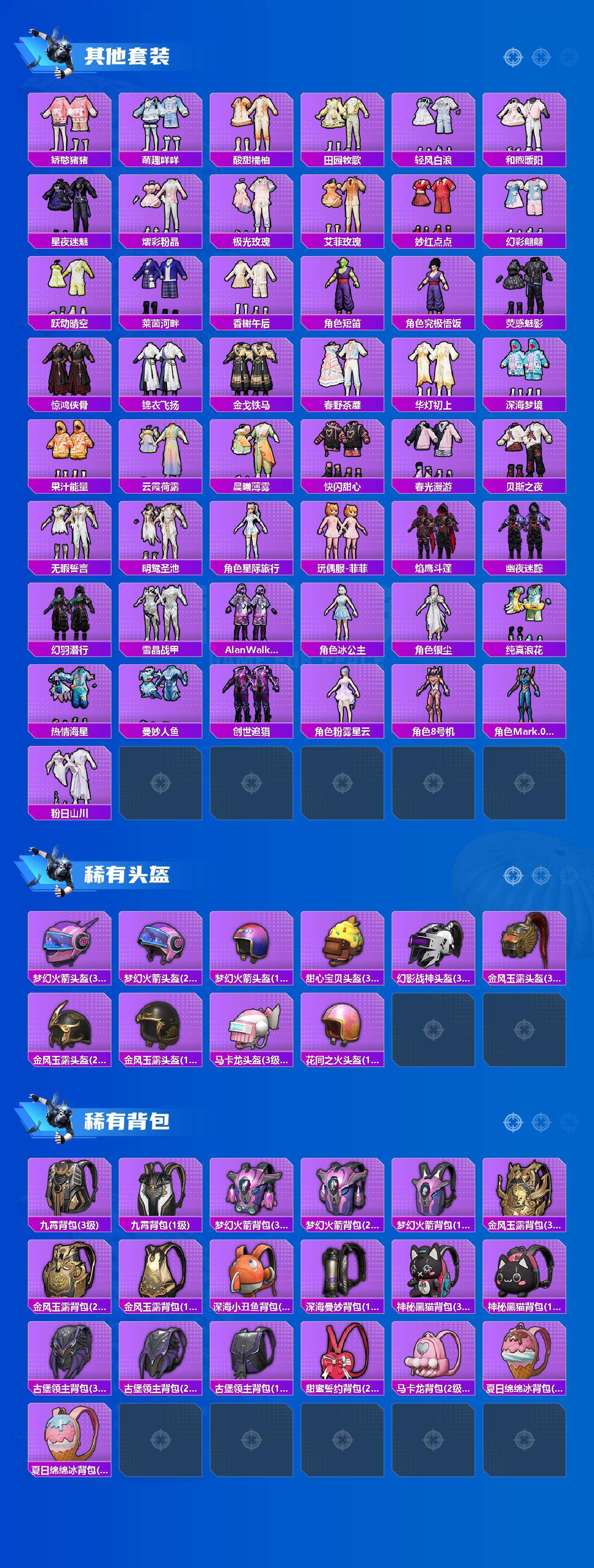 套装-梦幻火箭,套装-音爆索尼克,套装-深海小丑鱼,套装-奇异狩猎者,套装-浪客战士,套装-宝贝奶油派,套装-蝶舞迷情,套装-PEL轰鸣竞梦者,套装-幻彩马卡龙,套装-潮汐统领,套装-银刃赛罗,套装-炙焰红王,套装-蜜桃特工,套装-银龙傲海,套装-骨龙祭渊,套装-暗夜玫瑰,套装-山涧鹿灵,套装-齐天大圣,角色-洛天依,套装-赤焰黑爵,套装-紫电风暴,套装-傲雪凌霜,套装-寒光使者,角色-呆萌星弥,角色-宙之时溯,角色-星云暗核,套装-莲影清波,角色-冰炎战车,角色-圣堂之誓,角色-烟云彩露,角色-美琪,角色-狂花道·不知火舞,角色-樱桃泡泡,套装-大橘为重,套装-软萌银虎