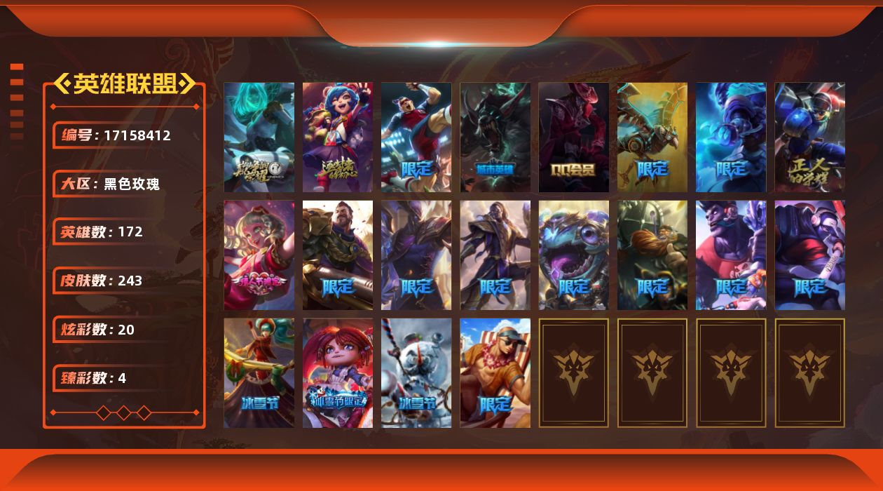[17158412]可二次【特价出售/店主推荐】白银段位-172英雄-243皮肤-20炫彩-0终极-2神话-26限定-17传说-68史诗