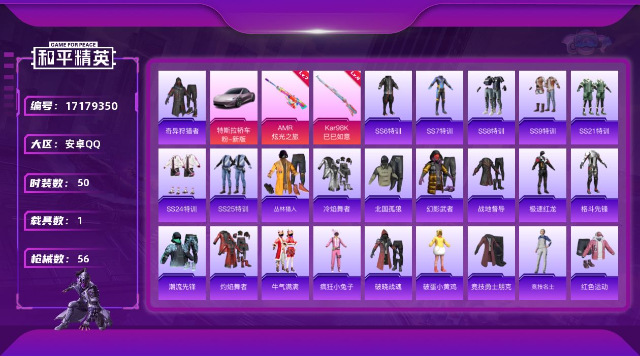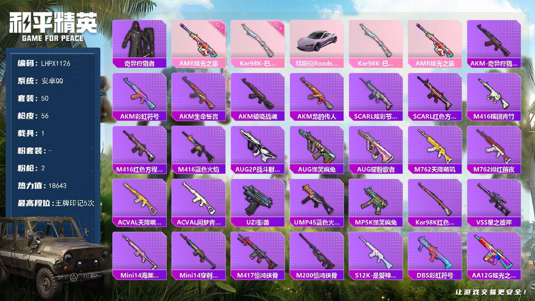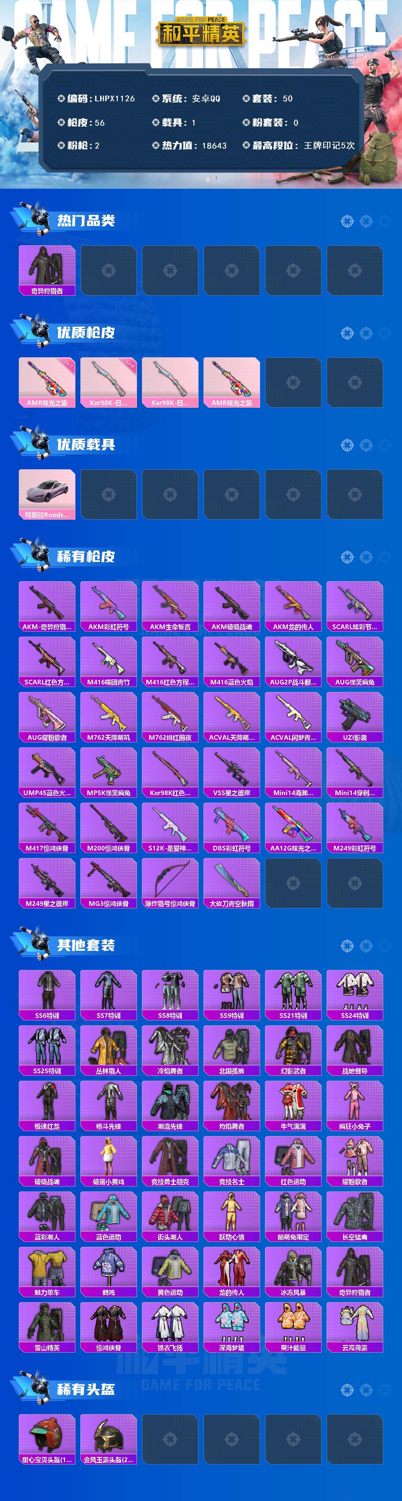 [17179350]可二次【特价出售/店主推荐】安卓 手Q-0粉装-2特效枪-1载具-0粉色飞行器-18643热力值-5王牌印记-50套装-56枪皮 【热门品类】:套装-奇异狩猎者 【粉色枪皮等级】:Kar98K-巳巳如意(四级),AMR-炫光之旅(七级) 【粉色载具】:特斯拉Roadster(沁心粉) 【粉色枪皮】:Kar98K-巳巳如意,AMR-炫光之旅 【稀有枪皮】:AKM-奇异狩猎者,AKM-彩虹符号,AKM-生命誓言,AKM-破晓战魂,AKM-龙的传人,SCAR-L-炫彩节奏,SCAR-L-红色方程式,M416-糯团青竹,M416-红色方程式,M416-蓝色火焰,AUG-2P战斗服款,AUG-怪笑疯兔,AUG-耀粉歌者,M762-天降萌叽,M762-绯红前夜,AC-VAL-天降萌叽,AC-VAL-闲梦青缨,UZI-影袭,UMP45-蓝色火焰,MP5K-怪笑疯兔,Kar98K-红色方程式,VSS-星之彼岸,Mini14-海渊国主,Mini14-穿刺龙虾,M417-惊鸿侠骨,M200-惊鸿侠骨,S12K-是爱神辣,DBS-彩虹符号,AA12-G-炫光之旅,M249-彩虹符号,M249-星之彼岸,MG3-惊鸿侠骨,爆炸猎弓-惊鸿侠骨,大砍刀-青空秋雨 【其他套装】:套装-SS6特训,套装-SS7特训,套装-SS8特训,套装-SS9特训,套装-SS21特训,套装-SS24特训,套装-SS25特训,套装-丛林猎人,套装-冷焰舞者,套装-北国孤狼,套装-幻影武者,套装-战地督导,套装-极速红龙,套装-格斗先锋,套装-潮流先锋,套装-灼焰舞者,套装-牛气满满,套装-疯狂小兔子,套装-破晓战魂,套装-破蛋小黄鸡,套装-竞技勇士朋克,套装-竞技名士,套装-红色运动,套装-耀粉歌者,套装-蓝彩潮人,套装-蓝色运动,套装-街头潮人,套装-跃动心情,套装-酷萌兔限定,套装-长空猛禽,套装-魅力单车,套装-鹤鸣,套装-黄色运动,套装-龙的传人,套装-冰冻风暴,套装-奇异狩猎者,套装-雪山精英,套装-惊鸿侠骨,套装-锦衣飞扬,套装-深海梦境,套装-果汁能量,套装-云霞荷露 【稀有头盔】:甜心宝贝头盔(1级),金风玉露头盔(2级) 【稀有背包】:精灵迷巫背包(1级) 【营地ID】:701306595