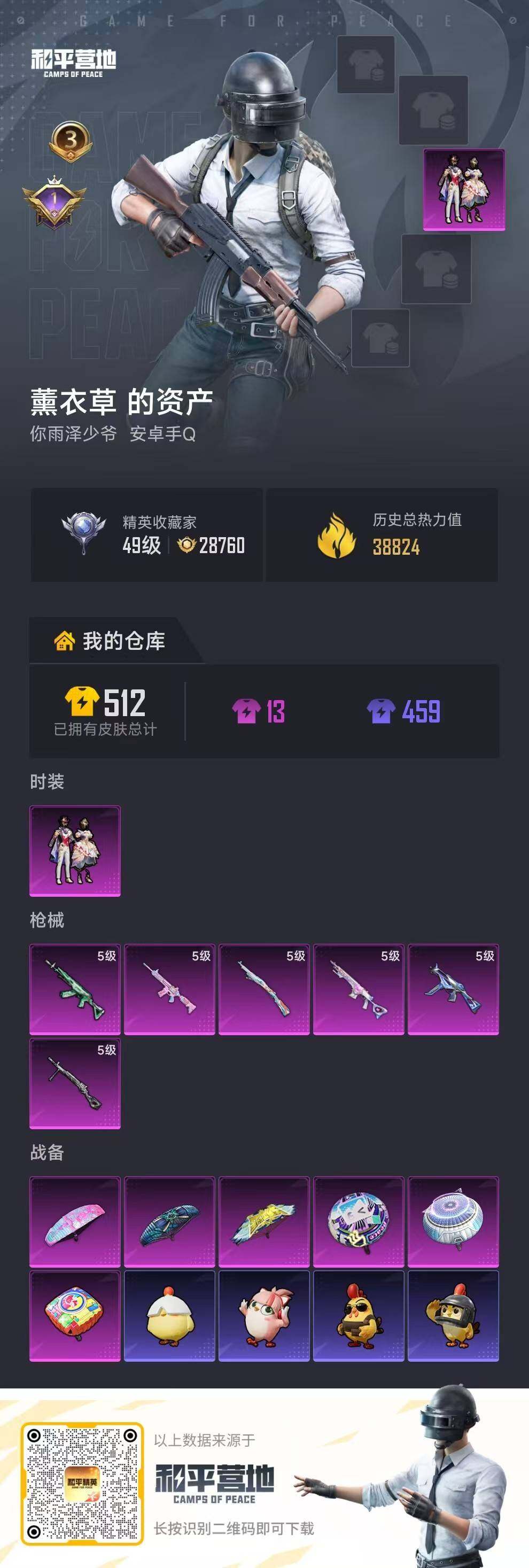 - [16329521]【店主推荐捡漏号!可直接换绑】苹果 手Q-3粉装-4特效枪-0载具-0粉色飞行器-33418热力值-7王牌印记-72套装-118枪皮【热门品类】:套装-龟仙人【粉色套装】:粉装-恐龙拽拽,粉装-闲梦青缨,粉装-星穹咏叹调【粉色枪皮等级】:AKS-74U-星穹咏叹调(七级),Kar98K-巳巳如意(五级),DP-28-豹影疾电(五级)【粉色枪皮】:AKS-74U-星穹咏叹调,Kar98K-巳巳如意,Mk14-闲梦青缨,DP-28-豹影疾电