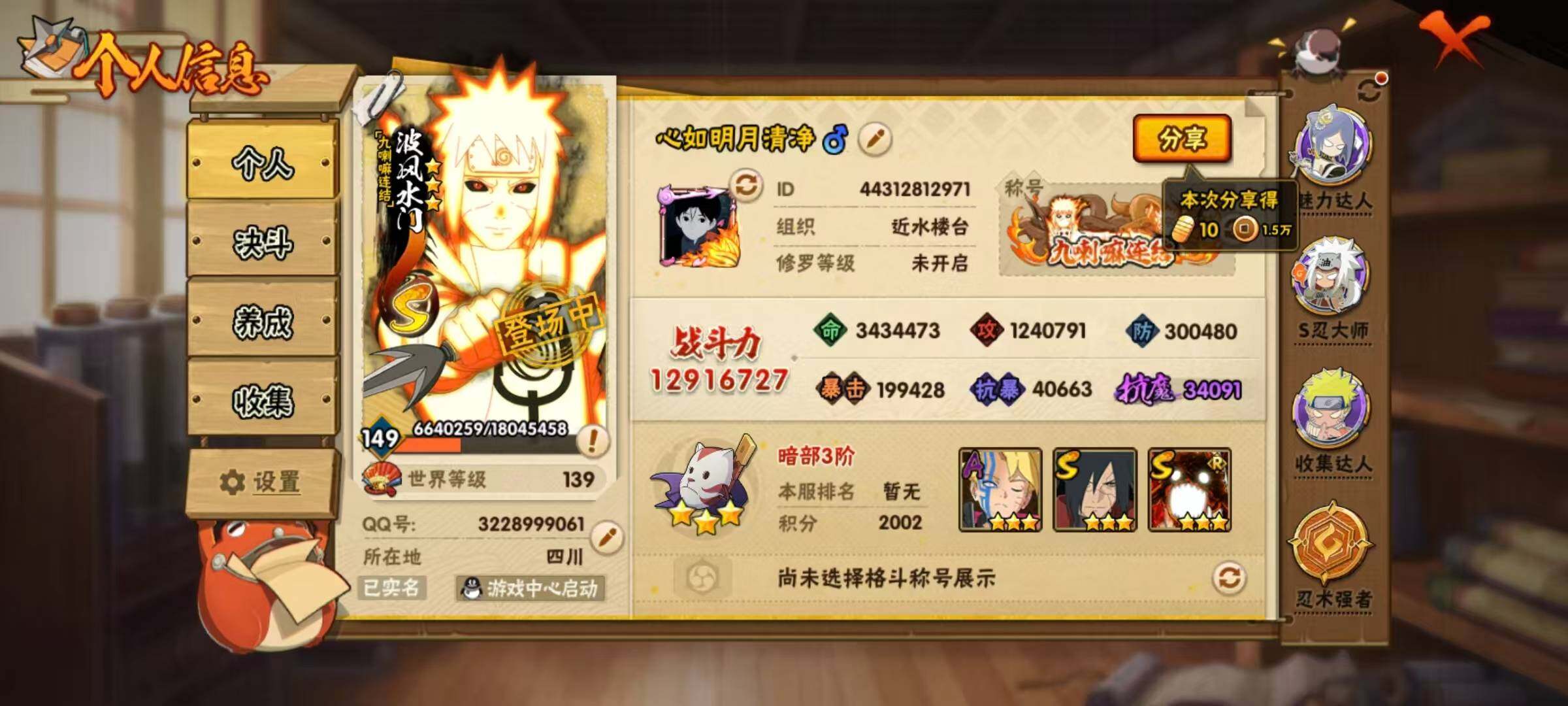 [17160362] VIP11,1291W战力,S忍27个,A忍34个,点券1425,金币23000
