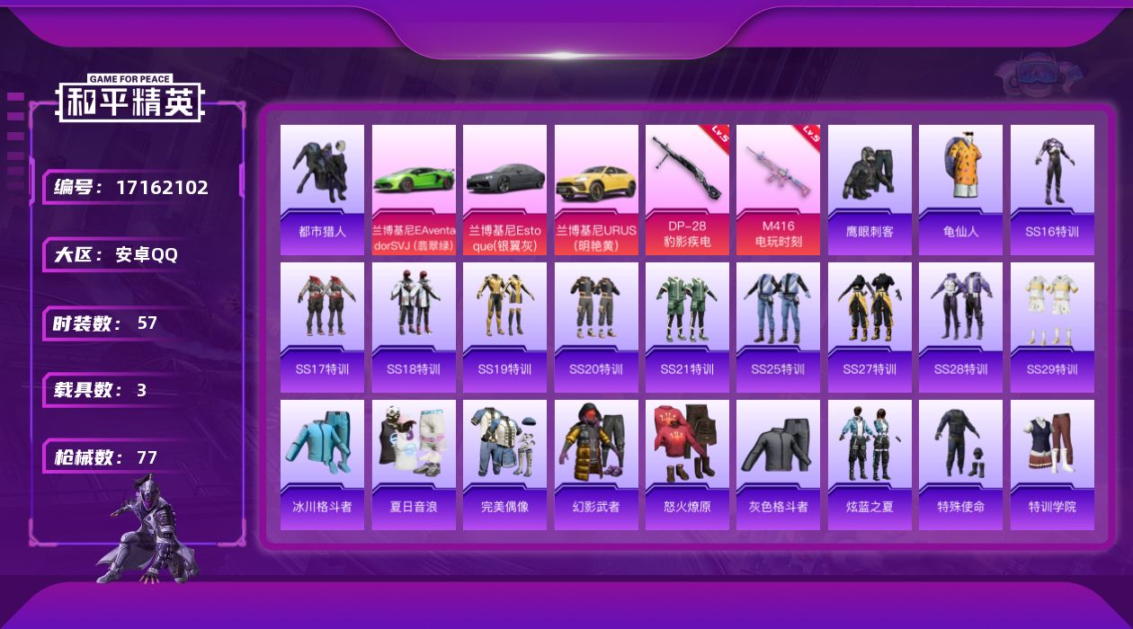 [17162102]【特价出售/店主推荐】安卓 手Q-0粉装-2特效枪-3载具-0粉色飞行器-24820热力值-3王牌印记-57套装-77枪皮 【热门品类】:套装-都市猎人,套装-龟仙人 【粉色枪皮等级】:M416-电玩时刻(五级),DP-28-豹影疾电(五级) 【粉色载具】:兰博基尼Aventador SVJ(翡翠绿),兰博基尼Estoque(银翼灰),兰博基尼URUS(明艳黄) 【粉色枪皮】:M416-电玩时刻,DP-28-豹影疾电 【粉色降落伞】:恐龙拽拽降落伞 【稀有套装】:套装-龟仙人,套装-雪国风尚 【稀有枪皮】:AKM-彩虹符号,AKM-影袭,AKM-王牌投手,AKM-破晓战魂,AKM-虎虎生威,SCAR-L-炫彩节奏,SCAR-L-红色方程式,M416-红色方程式,M416-蓝色火焰,GROZA-异彩先驱,GROZA-影袭,AUG-耀粉歌者,QBZ-飞驰魅影,M762-彩虹符号,G36C-星穹咏叹调,UZI-啾咪啾咪,UZI-天降萌叽,UZI-影袭,UMP45-仲夏莫吉托,UMP45-蓝色火焰,Vector-焰鹰斗篷,Vector-生命誓言,汤姆逊-天降萌叽,汤姆逊-异彩先驱,MP5K-异彩先驱,P90-飞驰魅影,Kar98K-影袭,Kar98K-炫彩节奏,Kar98K-飞驰魅影,M24-影袭,AWM-焰鹰斗篷,SKS-炫彩节奏,VSS-绿野极光,Mini14-异彩先驱,Mini14-穿刺龙虾,Mini14-耀粉歌者,S686-生命誓言,S1897-百万伏特,S1897-飞驰魅影,S12K-破晓战魂,DBS-焰鹰斗篷,SPAS-12-太空嘟嘟,M249-彩虹符号,M249-破晓战魂,DP-28-焰鹰斗篷,MG3-幻世战舞者 【其他套装】:套装-SS16特训,套装-SS17特训,套装-SS18特训,套装-SS19特训,套装-SS20特训,套装-SS21特训,套装-SS25特训,套装-SS27特训,套装-SS28特训,套装-SS29特训,套装-冰川格斗者,套装-夏日音浪,套装-完美偶像,套装-幻影武者,套装-怒火燎原,套装-灰色格斗者,套装-炫蓝之夏,套装-特殊使命,套装-特训学院,套装-猛禽,套装-白色伏地魔,套装-破蛋小黄鸡,套装-空投萌叽,套装-竞技名士,套装-绮丽涂鸦,套装-缤纷果语,套装-耀眼新星,套装-蓝彩潮人,套装-长空猛禽,套装-霓虹街区,套装-魅力单车,