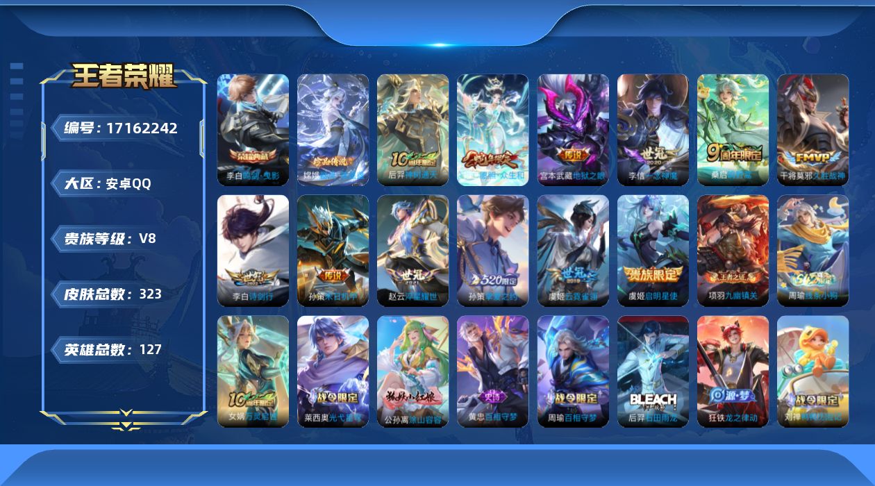 [17162242]可二次,【店主推荐捡漏号!可直接换绑】安卓Q-V8-最强王者段位-127英雄-320皮肤-1典藏-1珍品传说-12传说-105史诗 【英雄全皮】:狂铁全皮,影全皮 【荣耀典藏】:李白鸣剑曳影 【珍品传说】:嫦娥器灵落星盏 【传说皮肤】:后羿神树通天,妲己愿照众生和,桑启鸣野蒿,李白诗剑行,孙策挚爱之约,孙策末日机甲,赵云淬星耀世,虞姬启明星使,李信一念神魔,干将莫邪久胜战神,虞姬云霓雀翎,宫本武藏地狱之眼 【限定皮肤】:白起狰,蔡文姬夏日便利店,虞姬夏日便利店,姜子牙天穹之誓,狄仁杰阴阳师,赵云皇家上将,赵云龙胆,嬴政优雅恋人,孙尚香蔷薇恋人,钟无艳超时空战士,白起夜都怪侠,芈月重明,吕布猎兽之王,周瑜赤莲之焰,元歌无心,夏侯惇朔风刀,甄姬落雪兰心,曹操烛龙,典韦穷奇,马可波罗逐梦之星,马可波罗暗影游猎,马可波罗山海玄木吟,狄仁杰魔术师,狄仁杰万华元夜,达摩沙漠行僧,项羽海滩派对,项羽霸王别姬,老夫子醍醐杖,程咬金演武夺筹,韩信飞衡,王昭君午后时光,兰陵王金庭之子,孙悟空孙行者,牛魔御旌,李元芳匿光侦查者,李元芳云中旅人,虞姬启明星使,钟馗驱傩正仪,杨玉环遇见飞天,雅典娜黎明之约,鬼谷子原初探秘者,鬼谷子五谷丰年,铠青龙志,苏烈千军破阵,百里玄策原初追逐者,弈星混沌棋,梦奇顽趣,沈梦溪大漠名商,明世隐疑决卦,明世隐吟游魔法,裴擒虎李小龙,裴擒虎擒涛扼浪,狂铁御狮,狂铁电玩高手,米莱狄御霄,盾山御銮,孙策挚爱之约,上官婉儿梁祝,嫦娥拒霜思,嫦娥暖冬兔眠,西施玲珑珍味,鲁班大师探海日志,桑启海盐诗旅,暃星界游侠,戈娅驭风魔法,艾琳流音漫舞,司空震地狱燃心,阿古朵江河有灵,张良古海寻踪,蒙犽百解令,蒙恬荣光圣徽,高渐离燃音魔法,妲己灵卜魔法,鬼谷子天穹祈灯,沈梦溪龙舞盛年,鲁班七号蔬乡物语,李元芳蔬乡物语,刘邦剑破天穹,程咬金群星魔术团,镜青焰无极,项羽苍威无极,芈月浮光幕影,周瑜熔金海岸 【年限皮肤】:铠青龙志,韩信飞衡,赵云龙胆,马可波罗山海玄木吟 【赛季限定】:白起狰,芈月重明,夏侯惇朔风刀,曹操烛龙,典韦穷奇,狄仁杰万华元夜,达摩沙漠行僧,老夫子醍醐杖,程咬金演武夺筹,兰陵王金庭之子,张良古海寻踪,牛魔御旌,李元芳云中旅人,钟馗驱傩正仪,雅典娜黎明之约,鬼谷子原初探秘者,苏烈千军破阵,百里玄策原初追逐者,弈星混沌棋,梦奇顽趣,沈梦溪大漠名商,明世隐疑决卦,裴擒虎