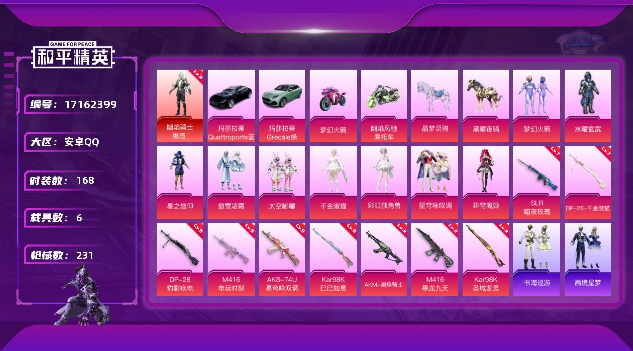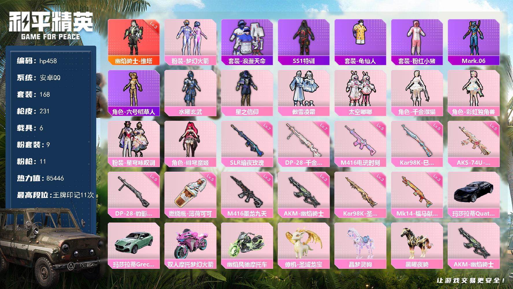 [17162399]安卓 手Q-1神装-9粉装-11特效枪-6载具-9粉色飞行器-85446热力值-11王牌印记-168套装-231枪皮
