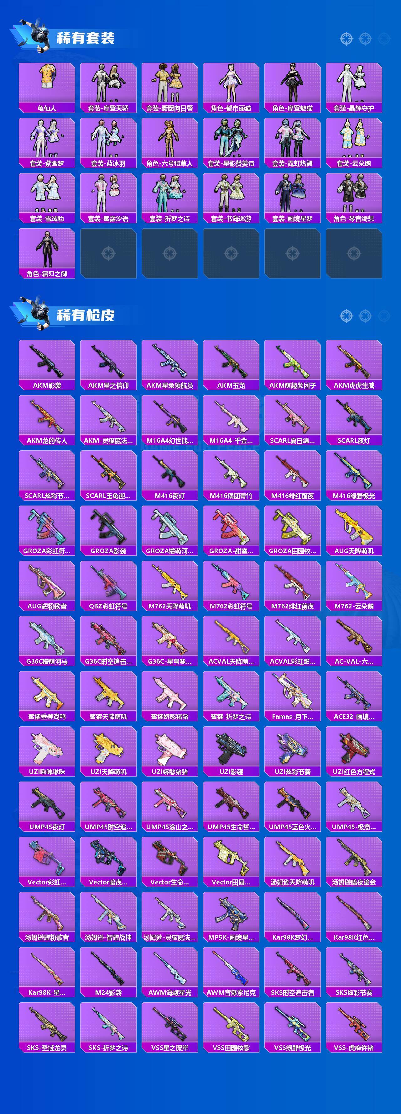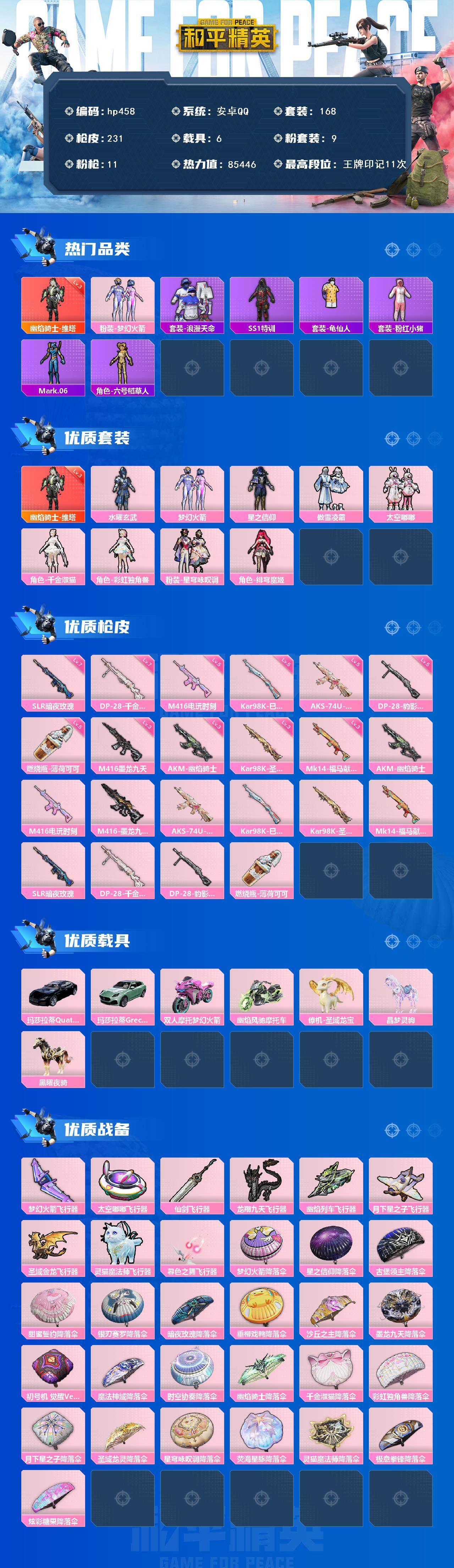 - [16335473]苹果 手Q-1神装-8粉装-13特效枪-4载具-9粉色飞行器-85353热力值-17王牌印记-164套装-264枪皮【红色神装等级】:辉羽雀灵-初翊(二级)【红色角色神装】:辉羽雀灵-初翊【热门品类】:粉装-梦幻火箭,套装-浪漫天命,套装-奇异狩猎者,套装-龟仙人,套装-暗影哥特【粉色套装】:粉装-梦幻火箭,粉装-星之彼岸,粉装-炫光之旅,角色-白兰星,粉装-蜜语绒猫,角色-烟云彩露,角色-千金淑猫,角色-智耀战神【粉色枪皮等级】:AKM-绿萝繁花(五级),AKM-幽焰骑士(三级),SCAR-L-锦绣绵绵(五级),M416-五爪金龙(六级),GROZA-镜光银凌(五级),AUG-暖羊咩咩(五级),UMP45-量子极限(五级),Kar98K-巳巳如意(五级),Kar98K-圣域龙灵(三级),Mk14-甜梦熊击(五级),DP-28-豹影疾电(五级),MG3-洛神天依(四级),平底锅-喜羊羊与灰太狼(二级)【粉色载具】:宾利欧陆GT敞篷(火焰橘),永恒黄蜂,幻影随行,僚机-萌兔起飞,辉羽雀灵自行车【粉色枪皮】:AKM-绿萝繁花,AKM-幽焰骑士,SCAR-L-锦绣绵绵,M416-五爪金龙,GROZA-镜光银凌,AUG-暖羊咩咩,UMP45-量子极限,Kar98K-巳巳如意,Kar98K-圣域龙灵,Mk14-甜梦熊击,DP-28-豹影疾电,MG3-洛神天依,平底锅-喜羊羊与灰太狼【粉色飞行器】:梦幻火箭飞行器,镜域双华-灵镜之阶,绝色倾城飞行器,龙翔九天飞行器,深渊漩涡飞行器,万象金身飞行器,圣域金龙飞行器,雀灵庇佑飞行器