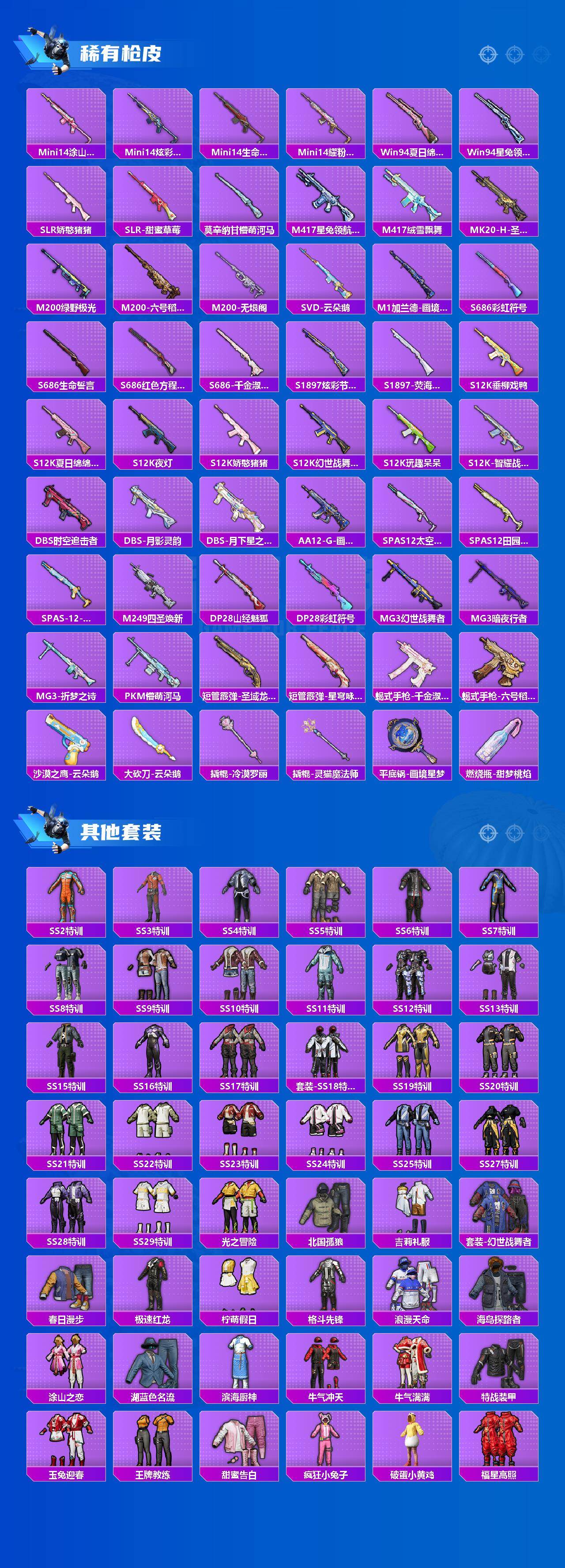 AKM-幽焰骑士,M416-电玩时刻,M416-墨龙九天,Kar98K-巳巳如意,Kar98K-圣域龙灵,SLR-暗夜玫瑰,DP-28-千金淑猫