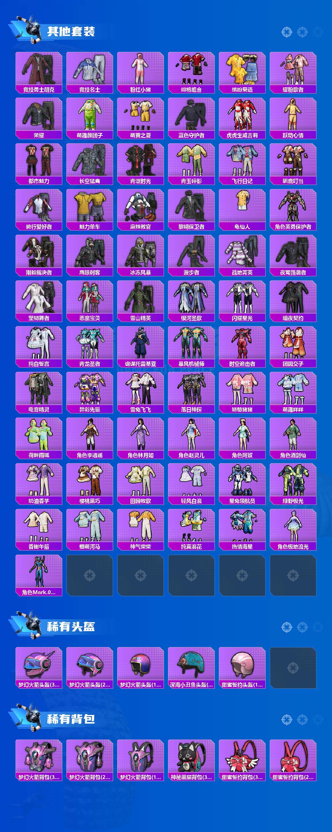 套装-浪漫天命,套装-龟仙人,套装-粉红小猪,角色-Mark.06,套装-极速红龙,套装-破蛋小黄鸡,角色-英勇保护者,套装-漫步者,套装-雪山精英,套装-暗夜契约,套装-纯白誓言,套装-青龙圣者,套装-团圆交子