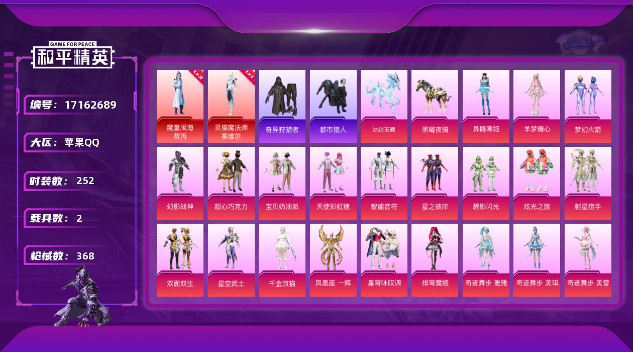 [17162689]苹果 手Q-2神装-21粉装-14特效枪-2载具-11粉色飞行器-131621热力值-22王牌印记-252套装-368枪皮