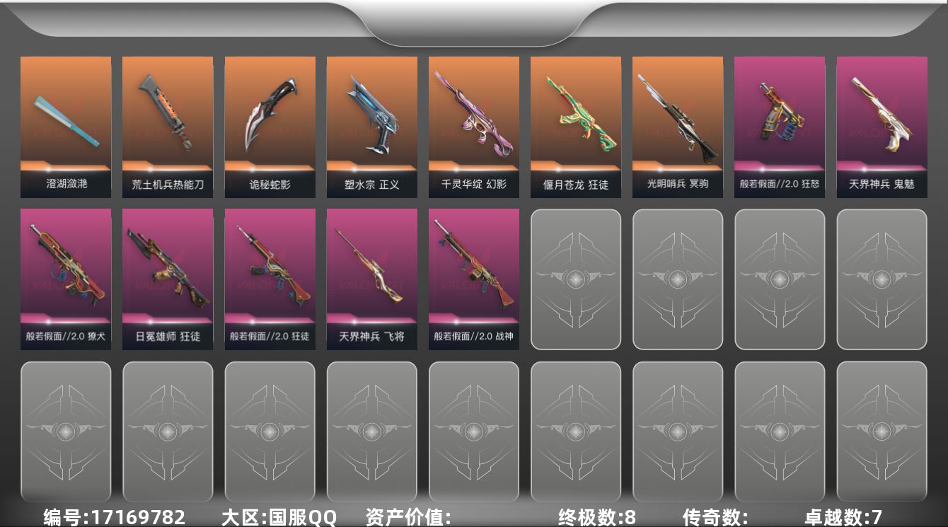[17169782]【套装】:般若假面//2.0套装 【英雄】:幻棱,炼狱,维斯,暮蝶,壹决,铁臂,捷风,雷兹,幽影,不死鸟,贤者,猎枭,零,芮娜,尚勃勒,霓虹,斯凯,夜露,星礈,盖可,黑梦,钢锁 【近战武器】:近战武器-澄湖潋滟,近战武器-鬼丸国纲,近战武器-荒土机兵 热能刀,近战武器-诡秘蛇影 军刀 【狂徒】:狂徒-偃月苍龙,狂徒-般若假面//2.0,狂徒-日冕雄师,狂徒-荒土机兵,狂徒-诡秘蛇影 【幻影】:幻影-千灵华绽,幻影-超限闪存,幻影-纳米打击,幻影-末日之翼 【戍卫】:戍卫-浮光跃金,戍卫-逆冲蛮牛,戍卫-折光棱晶 【獠犬】:獠犬-般若假面//2.0,獠犬-模拟赫兹,獠犬-逆冲蛮牛 【冥驹】:冥驹-光明哨兵,冥驹-荒土机兵,冥驹-模拟赫兹 【飞将】:飞将-天界神兵,飞将-末日之翼 【莽侠】:莽侠-超限闪存,莽侠-诡秘蛇影 【战神】:战神-般若假面//2.0,战神-浮光跃金 【奥丁】:奥丁-纳米打击,奥丁-末日之翼 【判官】:判官-诡秘蛇影,判官-纳米打击x 【雄鹿】:雄鹿-模拟赫兹,雄鹿-逆冲蛮牛 【骇灵】:骇灵-荒土机兵,骇灵-浮光跃金 【蜂刺】:蜂刺-超限闪存,蜂刺-折光棱晶 【标配】:标配-荒土机兵,标配-浮光跃金,标配-折光棱晶 【正义】:正义-塑水宗,正义-纳米打击 【鬼魅】:鬼魅-天界神兵,鬼魅-诡秘蛇影,鬼魅-模拟赫兹 【狂怒】:狂怒-般若假面//2.0,狂怒-逆冲蛮牛 【短炮】:短炮-末日之翼 【卡面】:终章:激斗汉堡 卡面,进入射程 卡面,分崩离析 卡面,纳米打击 卡面,抑制技术 卡面,激斗汉堡 卡面,瓦娃脸雪糕 P2 卡面,从黄昏到黎明 卡面,荒土机兵 卡面,银弹猎手 卡面,逆冲蛮牛 卡面,《双城之战》拥抱 卡面,精灵大战 卡面,欢迎来到底城 卡面,南瓜盛典 卡面,钢弓与箭弦 卡面,排除故障 卡面,战术桌游 卡面,悠享食光 卡面,修车达人 卡面,模拟赫兹 卡面,浮光跃金 卡面,超限闪存 卡面,维斯工牌 卡面,正义的化身 卡面,无畏契约GO!第一卷:芮娜 卡面,无畏契约GO!第一卷:零 卡面,《双城之战》金克丝 卡面,势不可挡//盖可 卡面,代号红色 卡面,新兵报到 卡面,V契约 卡面,无畏契约 卡面 【喷漆】:小小心意 喷漆,战“素”兔 喷漆,宇宙的指引 喷漆,请求重启 喷漆,逆冲蛮牛 喷漆,纳米打击 喷漆,鼻尖上的蝴蝶 喷漆,简笔画黯兽 喷漆,独