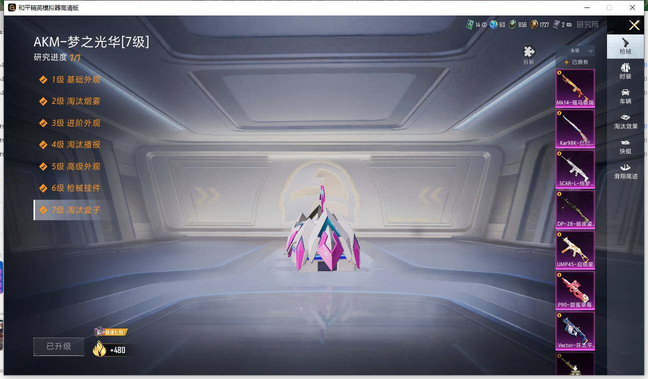 AKM-梦之光华,SCAR-L-梦幻火箭,SCAR-L-纯梦嫁纱,M416-风花雪月,M416-暖熊萌萌,AUG-妙趣可丽,UMP45-启明星,Vector-环太平洋,P90-甜蜜草莓,Kar98K-巳巳如意,DP-28-暗夜鎏金,MG3-洛神天依
