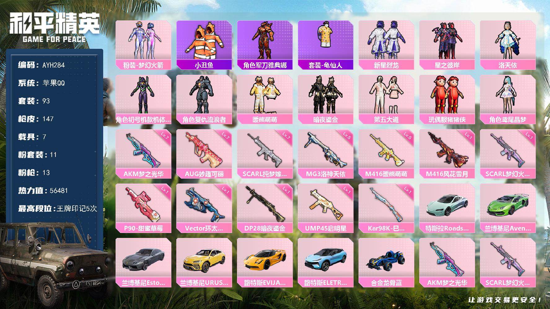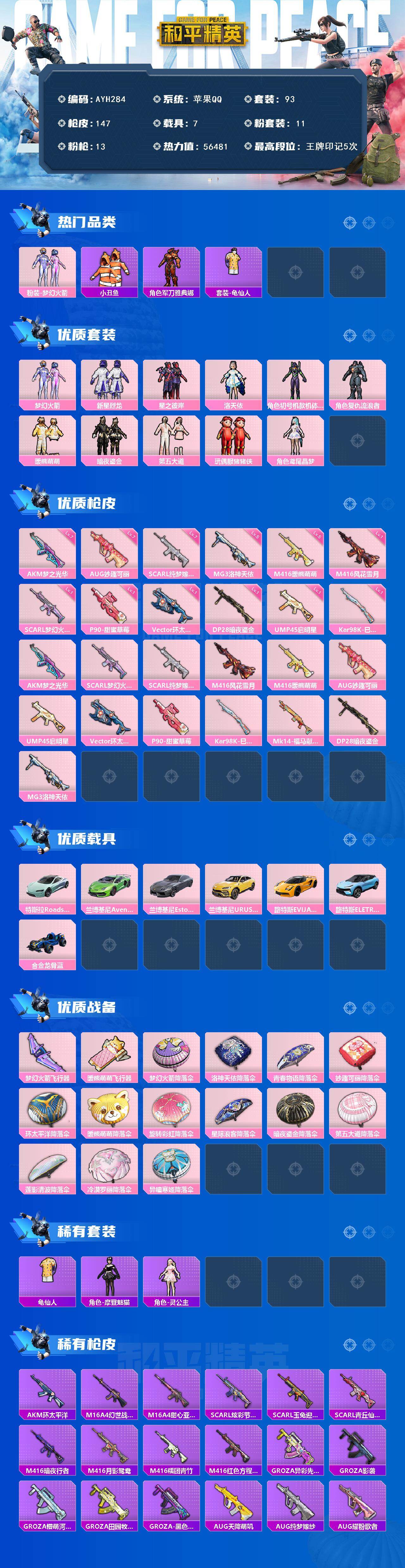 [17163259]苹果 手Q-11粉装-13特效枪-7载具-2粉色飞行器-56481热力值-5王牌印记-93套装-147枪皮 【热门品类】:粉装-梦幻火箭,套装-小丑鱼,角色-军刀雅典娜,套装-龟仙人 【粉色套装】:粉装-梦幻火箭,粉装-新星烈龙,粉装-星之彼岸,角色-洛天依,角色-初号机款机体服,角色-复仇流浪者,粉装-暖熊萌萌,粉装-暗夜鎏金,粉装-第五大道,玩偶服-猪猪侠,角色-鸢尾晶梦 【粉色枪皮等级】:AKM-梦之光华(七级),SCAR-L-梦幻火箭(一级),SCAR-L-纯梦嫁纱(七级),M416-风花雪月(一级),M416-暖熊萌萌(五级),AUG-妙趣可丽(七级),UMP45-启明星(一级),Vector-环太平洋(一级),P90-甜蜜草莓(一级),Kar98K-巳巳如意(一级),DP-28-暗夜鎏金(一级),MG3-洛神天依(五级) 【粉色载具】:特斯拉Roadster(水滴蓝),兰博基尼Aventador SVJ(翡翠绿),兰博基尼Estoque(银翼灰),兰博基尼URUS(明艳黄),路特斯EVIJA(星际黄),路特斯ELETRE(冰川蓝),合金龙骨(蓝) 【粉色枪皮】:AKM-梦之光华,SCAR-L-梦幻火箭,SCAR-L-纯梦嫁纱,M416-风花雪月,M416-暖熊萌萌,AUG-妙趣可丽,UMP45-启明星,Vector-环太平洋,P90-甜蜜草莓,Kar98K-巳巳如意,Mk14-福马献瑞,DP-28-暗夜鎏金,MG3-洛神天依 【粉色飞行器】:梦幻火箭飞行器,暖熊萌萌飞行器 【粉色降落伞】:梦幻火箭降落伞,洛神天依降落伞,青春物语降落伞,妙趣可丽降落伞,环太平洋降落伞,暖熊萌萌降落伞,旋转彩虹降落伞,星际浪客降落伞,暗夜鎏金降落伞,第五大道降落伞,莲影清波降落伞,冷漠罗丽降落伞,异瞳寒姬降落伞 【稀有套装】:套装-龟仙人,套装-雪国风尚,角色-摩登魅猫,角色-灵公主 【稀有枪皮】:AKM-环太平洋,M16A4-幻世战舞者,M16A4-甜心亚梦,SCAR-L-炫彩节奏,SCAR-L-玉兔迎春,SCAR-L-青丘仙客,M416-暗夜行者,M416-月影鸳鸯,M416-糯团青竹,M416-红色方程式,GROZA-异彩先驱,GROZA-影袭,GROZA-懵萌河马,GROZA-田园牧歌,GROZA-黑色刀锋,AUG-天降萌叽,AUG-纯梦嫁纱,AUG-耀粉歌者,A