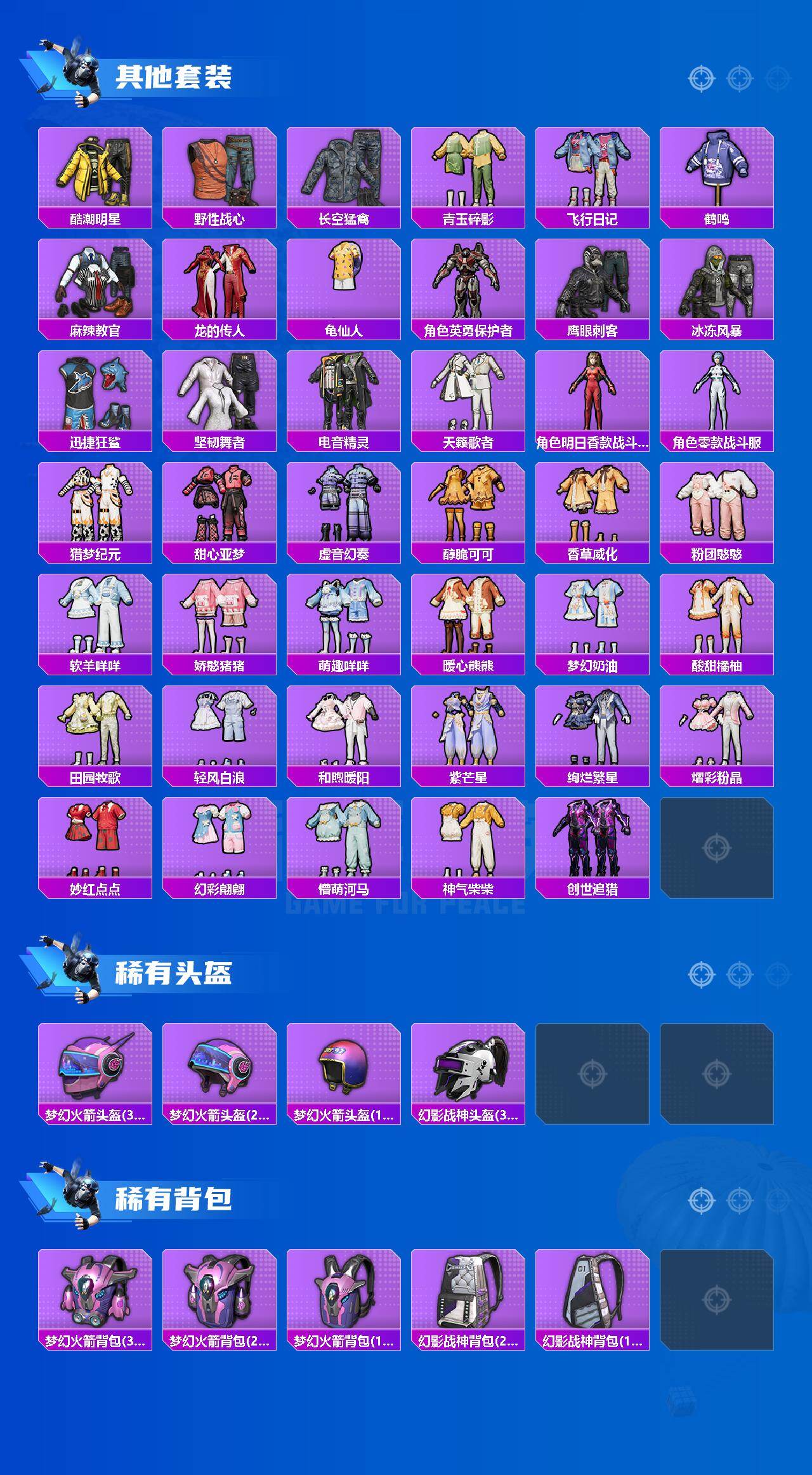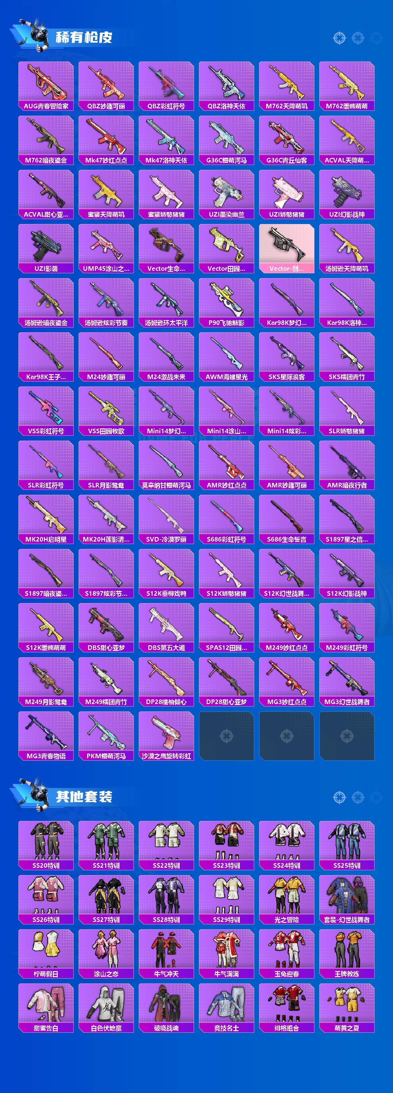 【稀有枪皮】:AKM-环太平洋,M16A4-幻世战舞者,M16A4-甜心亚梦,SCAR-L-炫彩节奏,SCAR-L-玉兔迎春,SCAR-L-青丘仙客,M416-暗夜行者,M416-月影鸳鸯,M416-糯团青竹,M416-红色方程式,GROZA-异彩先驱,GROZA-影袭,GROZA-懵萌河马,GROZA-田园牧歌,GROZA-黑色刀锋,AUG-天降萌叽,AUG-纯梦嫁纱,AUG-耀粉歌者,A