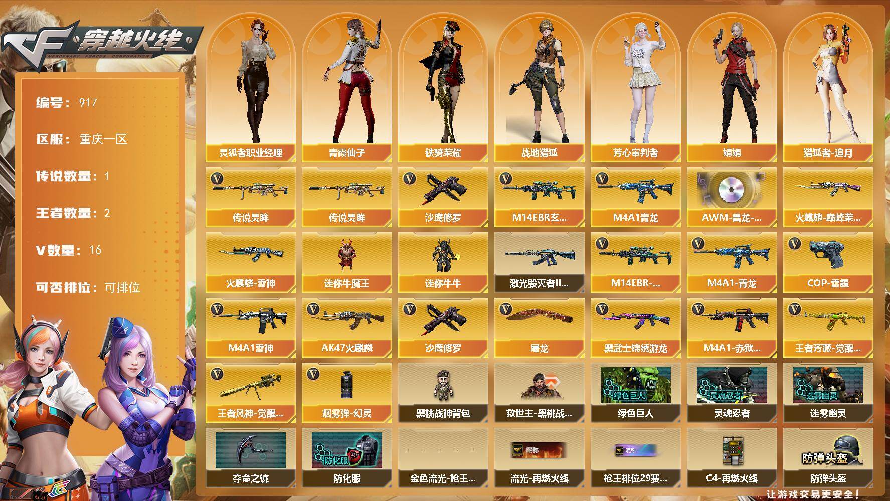 - [16969267]浙江一区-150V-11王者武器数-0炫金武器数 【传说武器】:传说圣灵 【热门武器】:传说圣灵,G36C-幻影,QBZ03-金色蔷薇,Scar Light-白虎,M200-幻神,金色蔷薇-古蛇迷踪,修罗-古蛇迷踪,M200-竞技荣光,死亡之眼,荣耀世冠-雷神,白虎-电玩蓝兔,荣耀世冠-柯尔特,Kar98K-星神,金色小号,C.A.T,牛牛-AK47,M4A1-黑骑士,汤姆逊-烈龙*6,RPK-盘龙*4,加特林-炼狱*4,斯泰尔-蝴蝶,火麒麟-绝迹,COP-白鲨,USP-雷暴,COP-堕天神*3,沙鹰-修罗,金刚伞 【王者炫金武器】:王者之怒*2 【音效卡】:M4A1-雷神音效卡,M4A1-黑骑士音效卡,Barrett-毁灭音效卡,Scar Light-白虎音效卡 【皮肤】:幻神-AG-CFPL S24冠军 皮肤,烈龙-星空,雷神-暗月,雷神-星空,雷神-虎将,雷神-R.LGD-CFPLS18冠军*2,雷神-机甲刑天皮肤,雷神-炽焰魔龙,火麒麟-雷神,火麒麟-冠军之心,AK47-火麒麟-传奇EVEN,火麒麟-平天大圣*2,火麒麟-巅峰荣耀,火麒麟-心动糖果,毁灭耀金皮肤,毁灭-星空,毁灭-CFS2020,毁灭-黑大圣皮肤,毁灭-风暴,黑龙-能量核心,M4A1-黑龙-361,黑骑士-地狱火,无影耀金皮肤,AK47-黑武士-361,战神-粉色甜心皮肤,战神-紫绶金章皮肤*3,战神-流金岁月皮肤,AK47-B-常胜将军-曹操*2,AK47-B-常胜将军-刘备*2,AK47-B-常胜将军-孙权*3,AWM-天龙-传奇70KG,AWM-天龙-传奇白鲨,极光-能量核心,修罗-能量核心,屠龙-荣耀之锋 【角色】:葵,炫,迷迭香,电竞教官-云悠悠,战地猎狐,蛇隐宗,修道士,空,暗夜-X,北极狐-X,风暴女,嘉年华灵狐,娟娟,兰-新年限定,灵狐者-X,灵狐者-黄金海岸,灵狐者-七夕宝贝,灵狐者-职业经理,龙儿-小淘气,麻雀,曼陀罗-X,潘多拉-X,潘多拉-甜心教官,潜龙队-X,邱刚敖,蛇姬,斯沃特-X,蜀雪,铁骑-乘风破浪,铁骑荣耀,新娜塔莎,樱-战斗天使,影武者-X,游珑儿,职业选手,雅典娜 【人偶武器】:火麒麟-绝迹,COP-白鲨,天龙-曼陀罗,火麒麟-灵狐,M4A1-雷神-精英刀锋,斯泰尔-蝴蝶,巴雷特-零-水下丽影*2,AWM-灵狐-15周年嘉年华,M37-葵,COP-旗袍