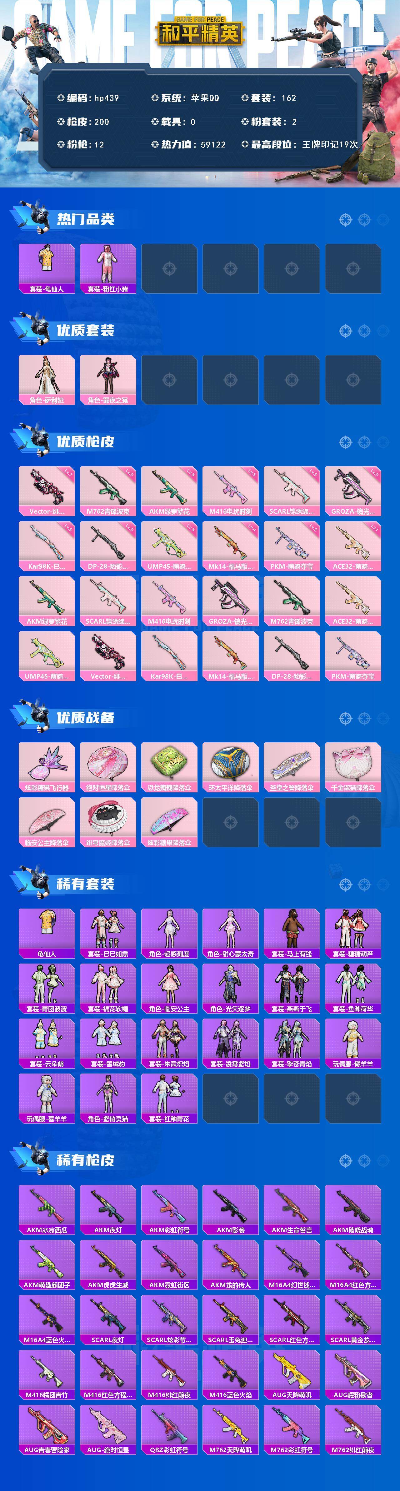 [17139577]苹果 手Q-2粉装-12特效枪-0载具-1粉色飞行器-59122热力值-19王牌印记-162套装-200枪皮 【热门品类】:套装-龟仙人,套装-粉红小猪 【粉色套装】:角色-萨利娅,角色-罪夜之冕 【粉色枪皮等级】:AKM-绿萝繁花(五级),SCAR-L-锦绣绵绵(五级),M416-电玩时刻(五级),GROZA-镜光银凌(五级),M762-青锋波束(五级),ACE32-萌骑漫游(一级),UMP45-萌骑冒险(五级),Vector-绯穹魔姬(七级),Kar98K-巳巳如意(五级),Mk14-福马献瑞(四级),DP-28-豹影疾电(五级),PKM-萌骑夺宝(二级) 【粉色枪皮】:AKM-绿萝繁花,SCAR-L-锦绣绵绵,M416-电玩时刻,GROZA-镜光银凌,M762-青锋波束,ACE32-萌骑漫游,UMP45-萌骑冒险,Vector-绯穹魔姬,Kar98K-巳巳如意,Mk14-福马献瑞,DP-28-豹影疾电,PKM-萌骑夺宝 【粉色飞行器】:炫彩糖果飞行器 【粉色降落伞】:绝对恒星降落伞,恐龙拽拽降落伞,环太平洋降落伞,圣堂之誓降落伞,千金淑猫降落伞,临安公主降落伞,绯穹魔姬降落伞,炫彩糖果降落伞 【稀有套装】:套装-龟仙人,套装-巳巳如意,角色-超感刻度,角色-甜心蒙太奇,套装-雪国风尚,套装-炫彩糖果,套装-马上有钱,套装-糖糖葫芦,套装-青团波波,套装-棉花软糖,角色-临安公主,角色-光矢逐梦,套装-燕燕于飞,套装-鱼渊荷华,套装-云朵鹅,套装-雪绒豹,套装-朱霞炽焰,套装-凌霄紫焰,套装-擎苍青焰,玩偶服-懒羊羊,玩偶服-喜羊羊,角色-紫俏灵猫,套装-红釉青花 【稀有枪皮】:AUG-冰晶雪宝,AKM-冰凉西瓜,AKM-夜灯,AKM-彩虹符号,AKM-影袭,AKM-生命誓言,AKM-破晓战魂,AKM-萌趣颜团子,AKM-虎虎生威,AKM-霓虹街区,AKM-龙的传人,M16A4-幻世战舞者,M16A4-红色方程式,M16A4-蓝色火焰,SCAR-L-夜灯,SCAR-L-炫彩节奏,SCAR-L-玉兔迎春,SCAR-L-红色方程式,SCAR-L-黄金龙骨,M416-糯团青竹,M416-红色方程式,M416-绯红前夜,M416-蓝色火焰,AUG-天降萌叽,AUG-耀粉歌者,AUG-青春冒险家,AUG-绝对恒星,QBZ-彩虹符号,M762-天降萌叽,M762-彩虹符号
