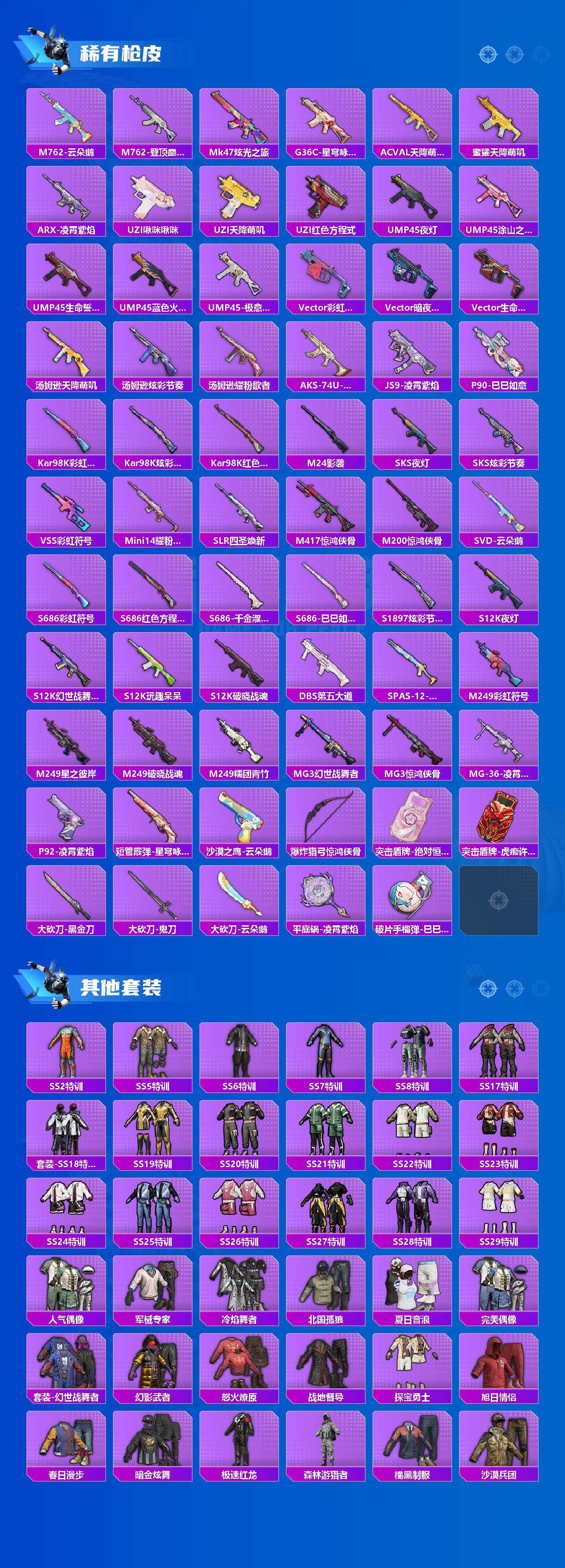 【稀有枪皮】:AUG-冰晶雪宝,AKM-冰凉西瓜,AKM-夜灯,AKM-彩虹符号,AKM-影袭,AKM-生命誓言,AKM-破晓战魂,AKM-萌趣颜团子,AKM-虎虎生威,AKM-霓虹街区,AKM-龙的传人,M16A4-幻世战舞者,M16A4-红色方程式,M16A4-蓝色火焰,SCAR-L-夜灯,SCAR-L-炫彩节奏,SCAR-L-玉兔迎春,SCAR-L-红色方程式,SCAR-L-黄金龙骨,M416-糯团青竹,M416-红色方程式,M416-绯红前夜,M416-蓝色火焰,AUG-天降萌叽,AUG-耀粉歌者,AUG-青春冒险家,AUG-绝对恒星,QBZ-彩虹符号,M762-天降萌叽,M762-彩虹符号