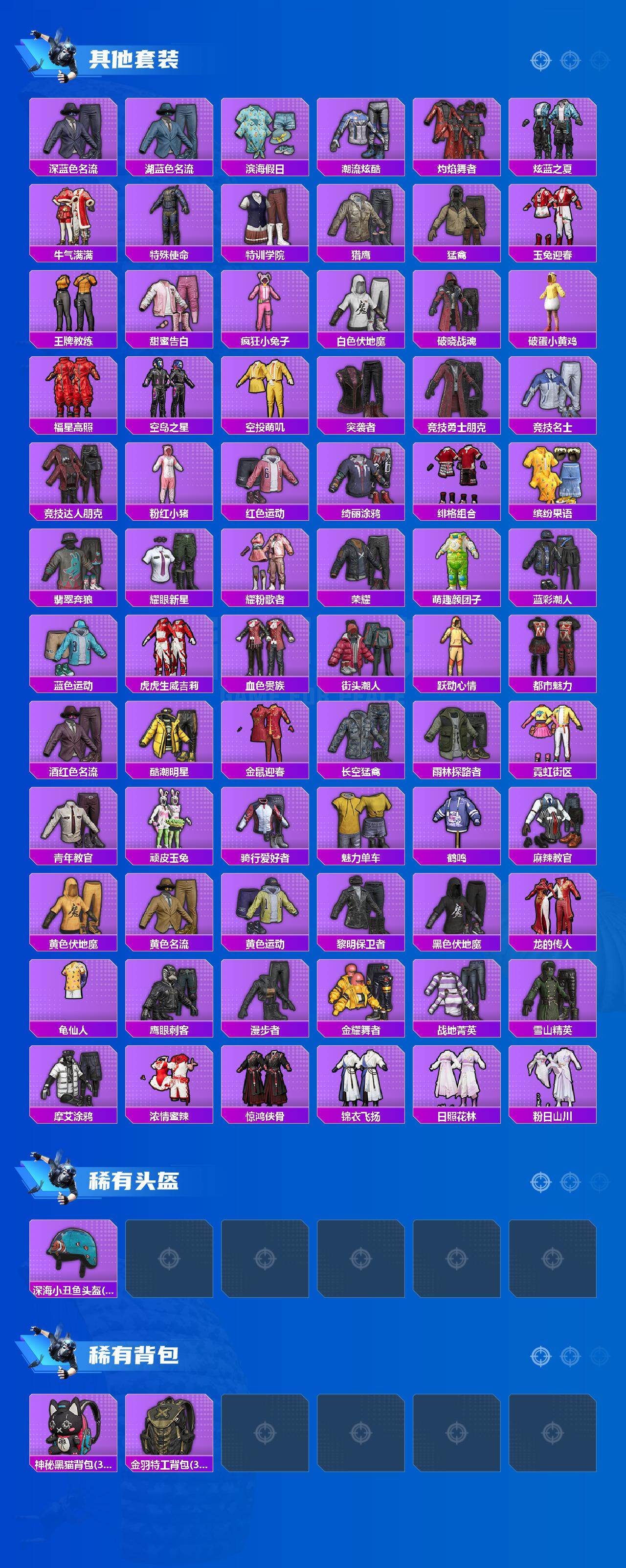 【稀有套装】:套装-龟仙人,套装-巳巳如意,角色-超感刻度,角色-甜心蒙太奇,套装-雪国风尚,套装-炫彩糖果,套装-马上有钱,套装-糖糖葫芦,套装-青团波波,套装-棉花软糖,角色-临安公主,角色-光矢逐梦,套装-燕燕于飞,套装-鱼渊荷华,套装-云朵鹅,套装-雪绒豹,套装-朱霞炽焰,套装-凌霄紫焰,套装-擎苍青焰,玩偶服-懒羊羊,玩偶服-喜羊羊,角色-紫俏灵猫,套装-红釉青花