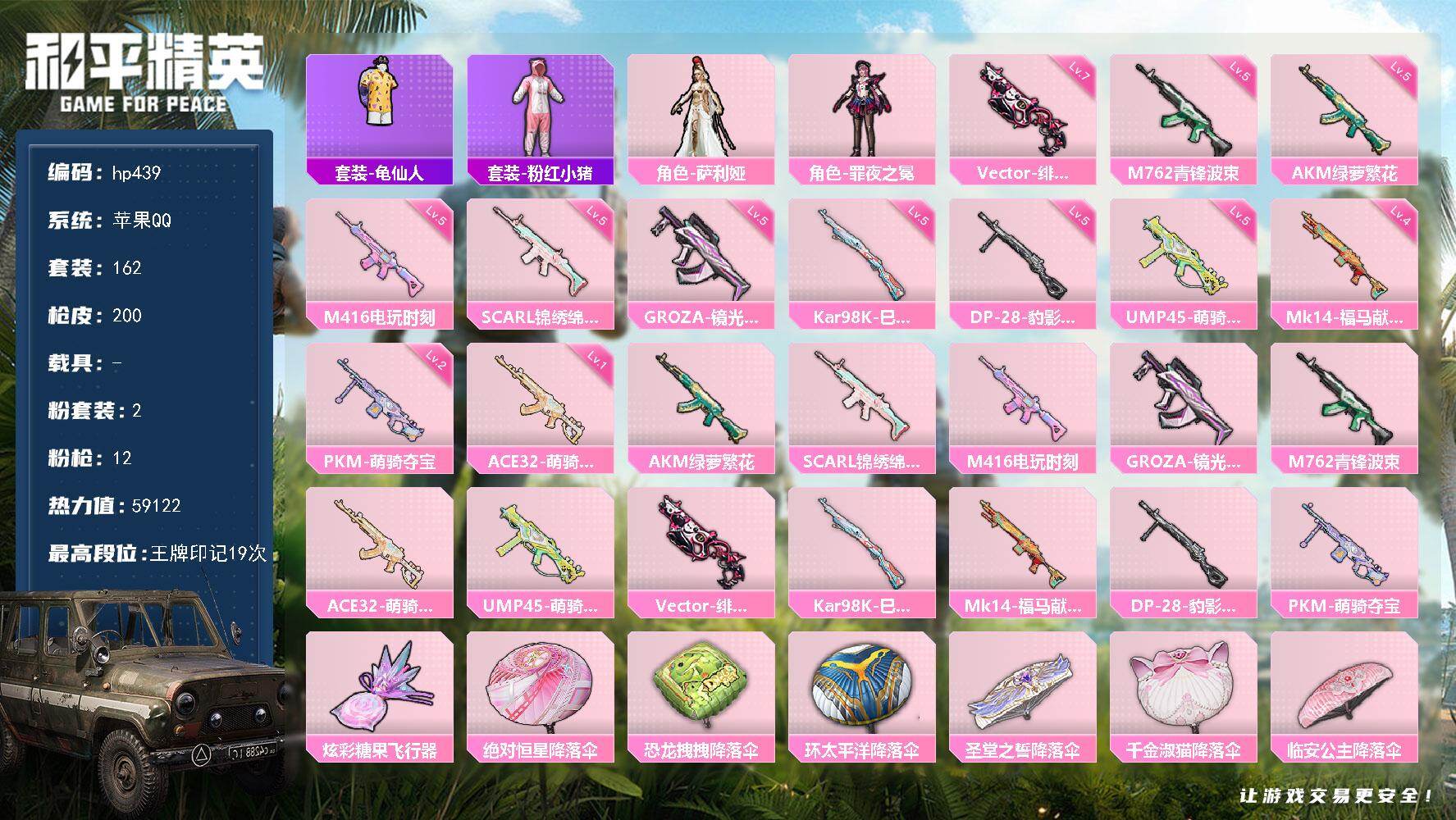 [17139577]苹果 手Q-2粉装-12特效枪-0载具-1粉色飞行器-59122热力值-19王牌印记-162套装-200枪皮